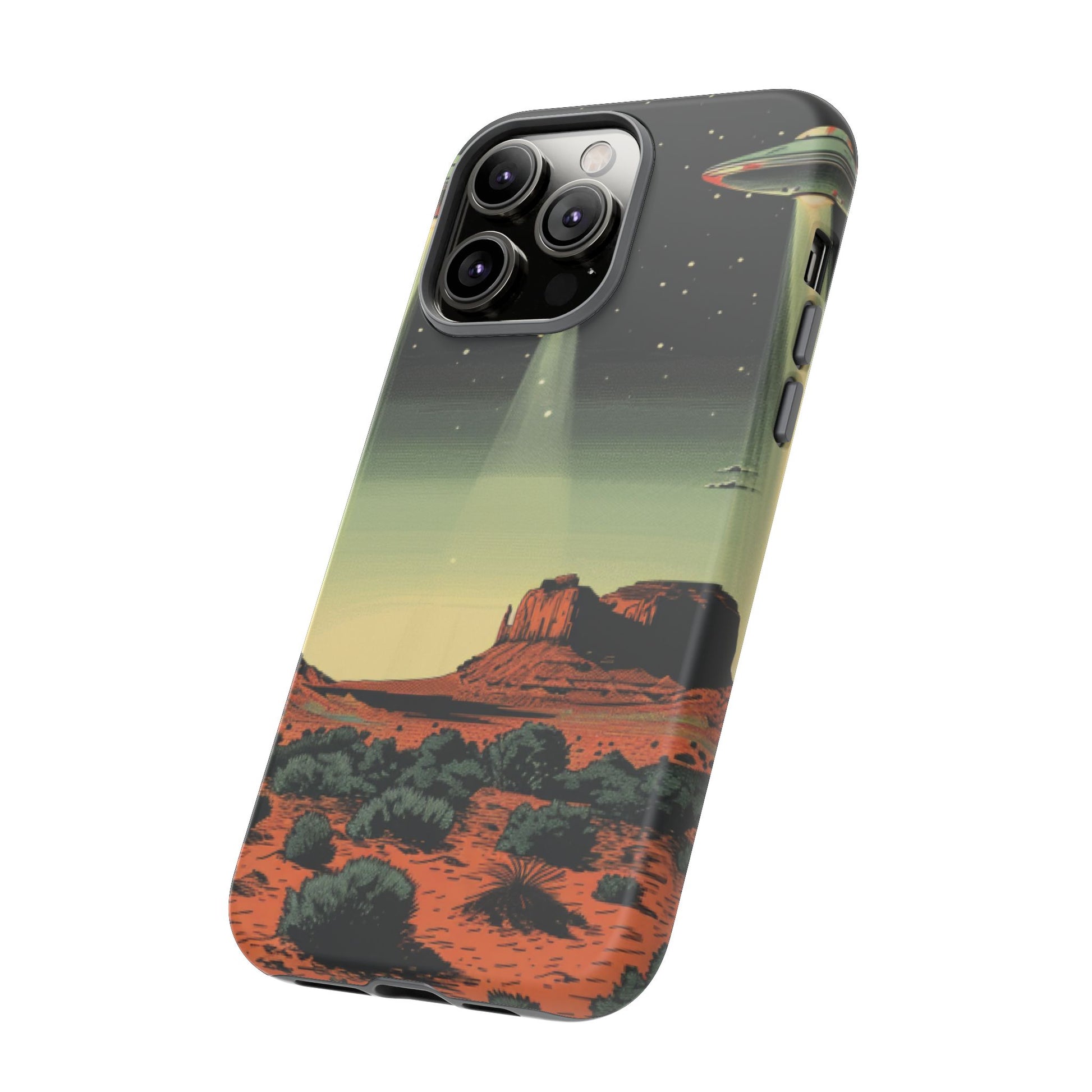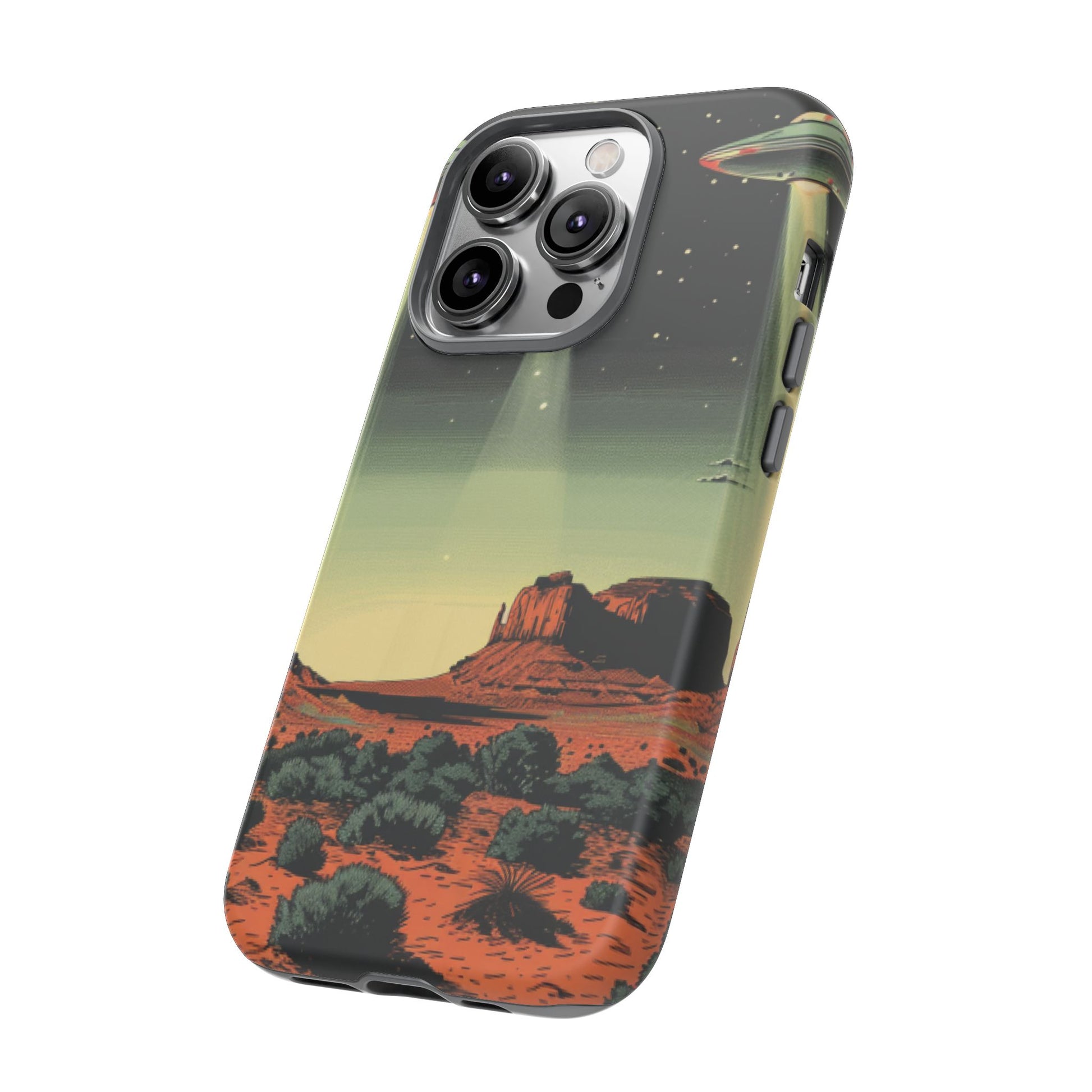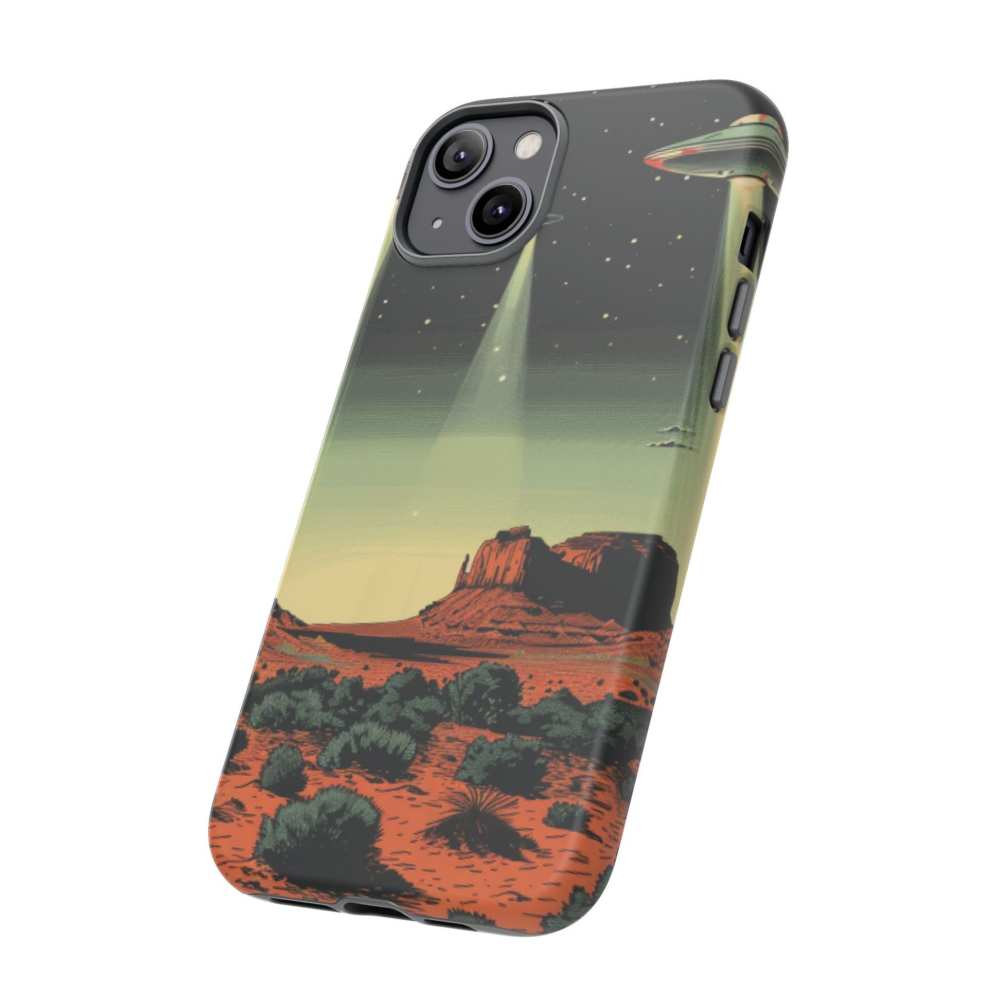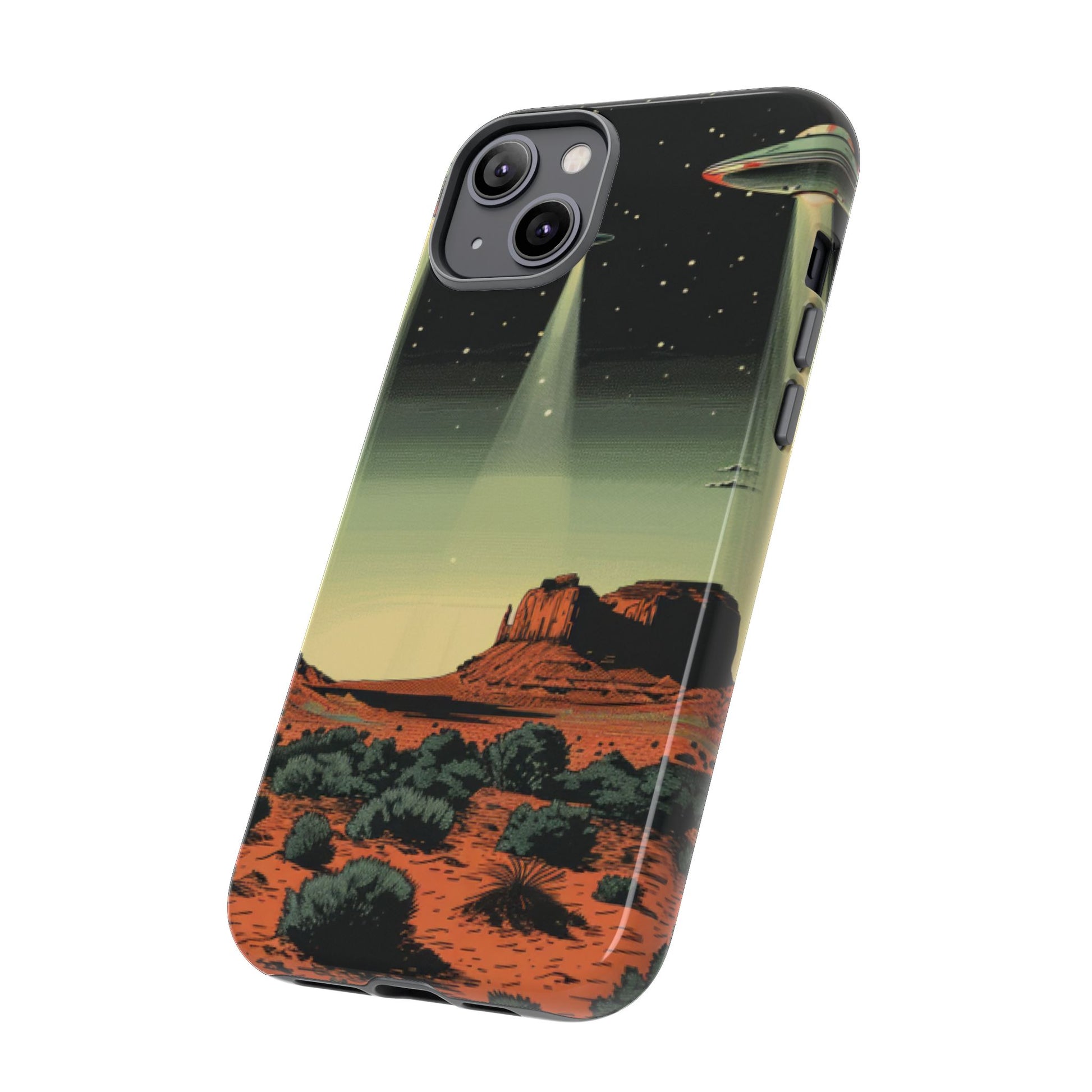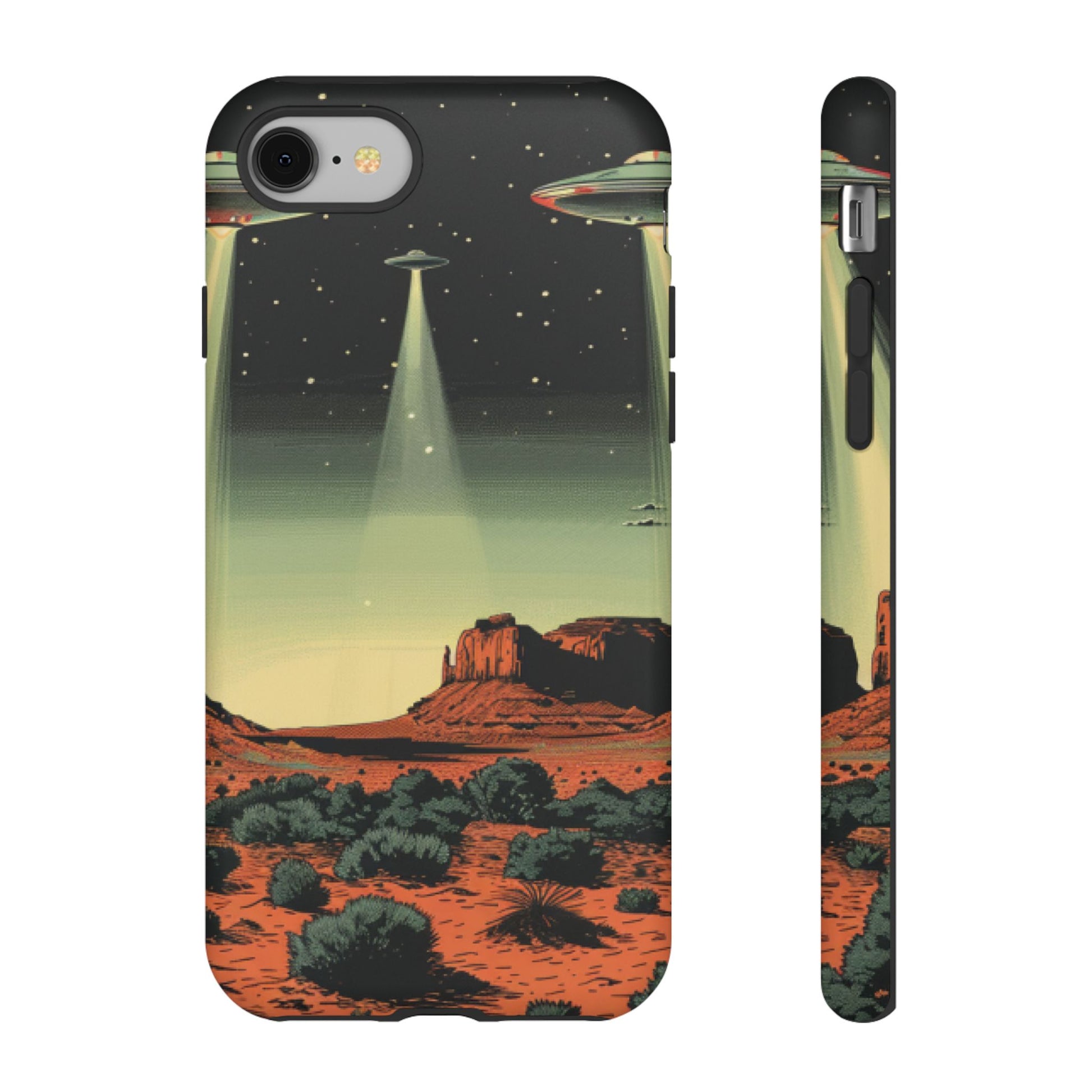 Night drives across red rock mesas, a hush of stars, and suddenly a silver disc sliding through the desert sky — this protective phone case carries that slow, cinematic thrill into everyday life. The double-layer shell hugs your phone while the TPU liner cushions every knock. The scene wraps fully around the case, keeping the vintage sci‑fi illustration crisp and weather-resistant. It’s for people who like their gear tough but mysterious: road‑trip storytellers, late-night stargazers, and collectors of retro space art. Use it on long drives, at outdoor meetups, or when you want a small, daily reminder of wide open places and strange lights on the horizon.