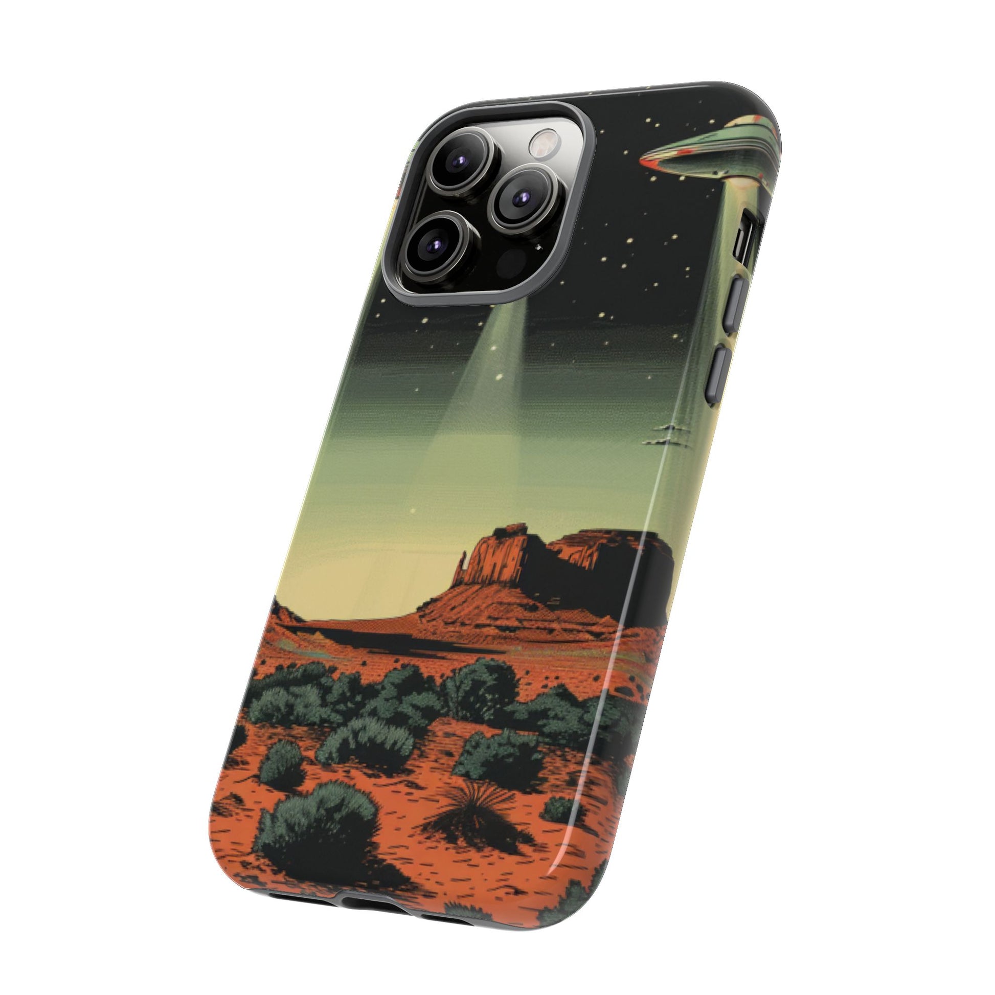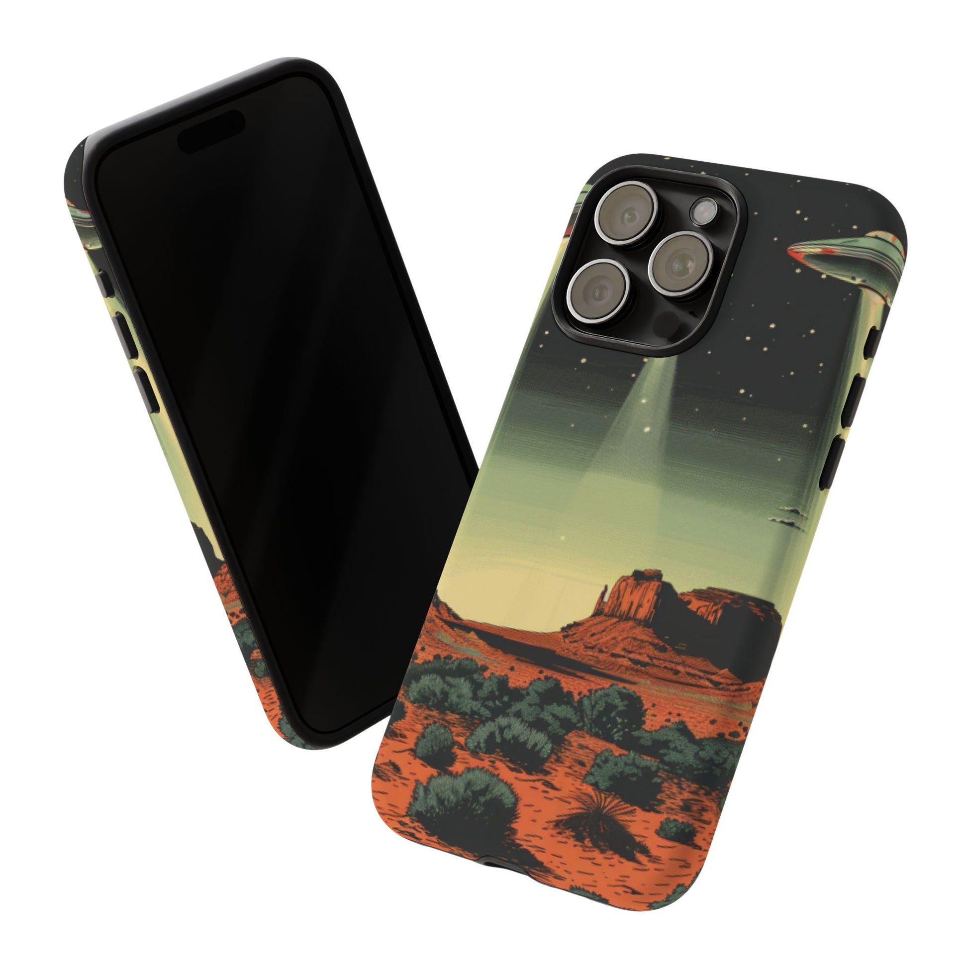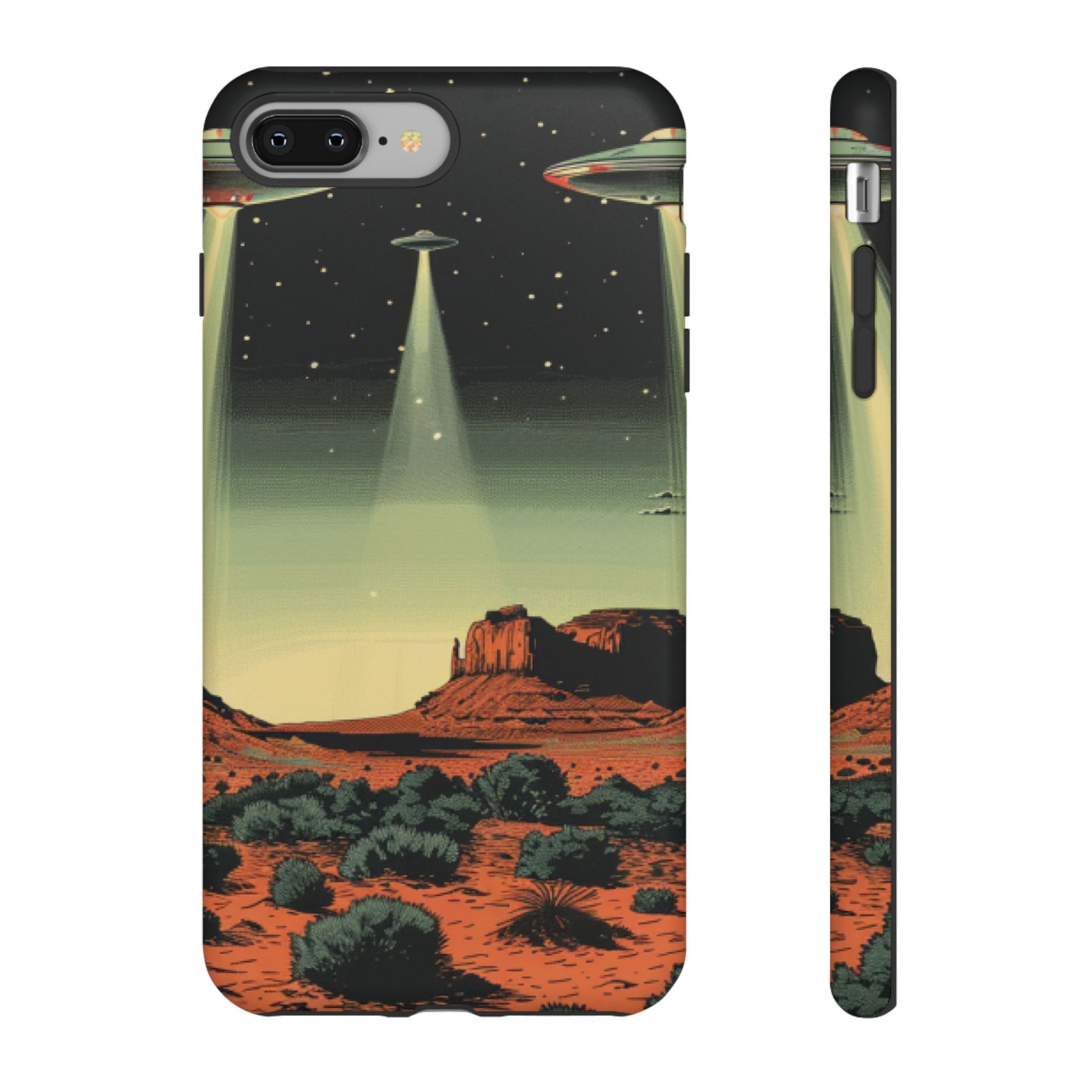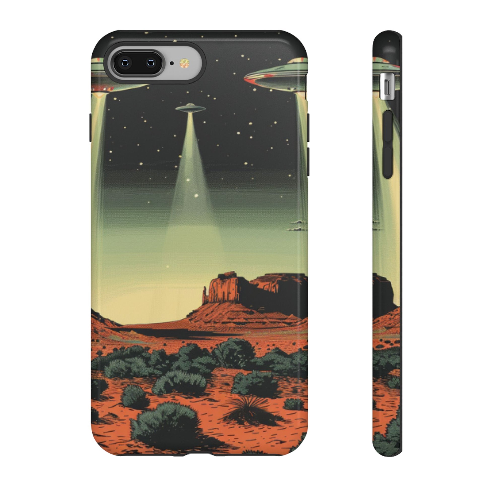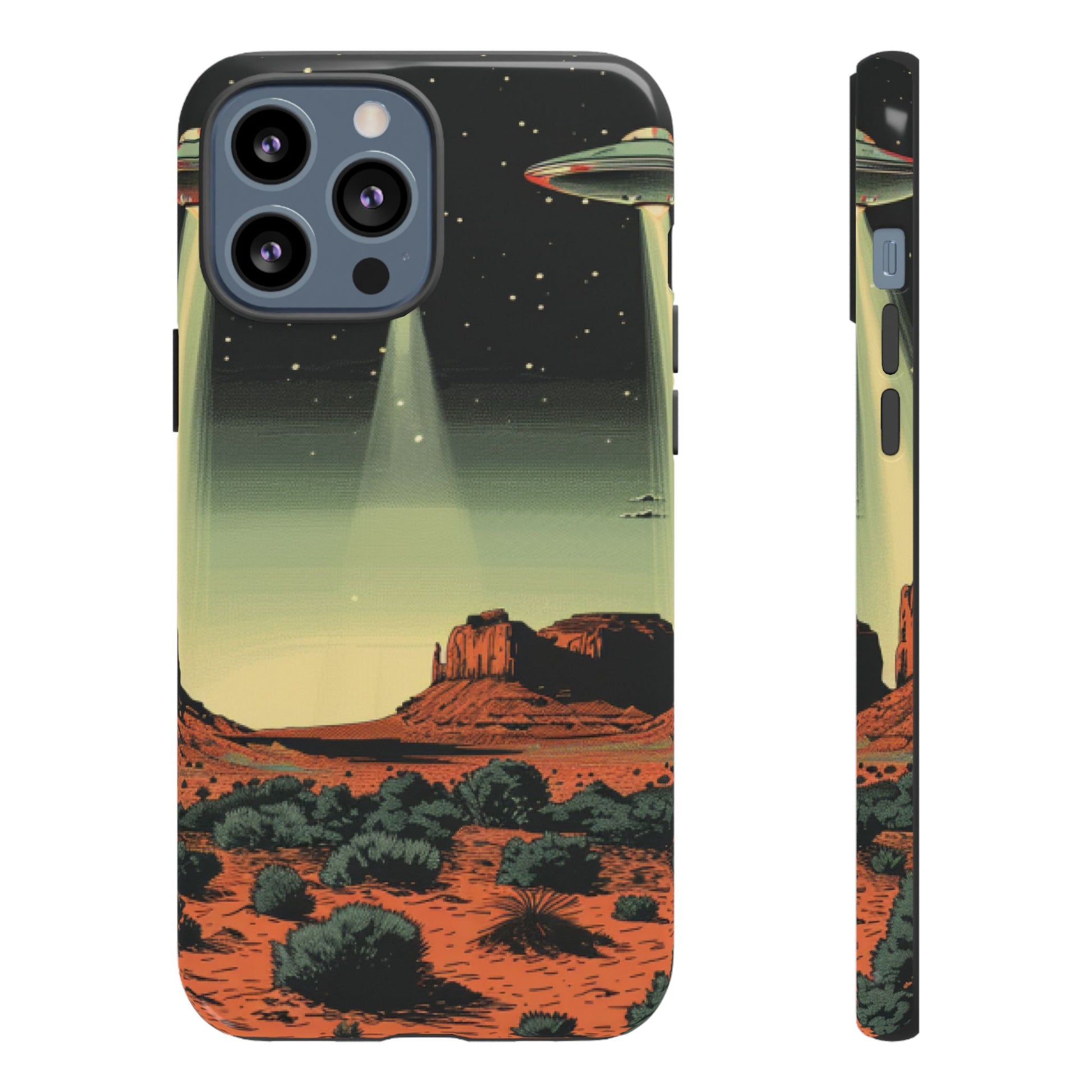 Night drives across red rock mesas, a hush of stars, and suddenly a silver disc sliding through the desert sky — this protective phone case carries that slow, cinematic thrill into everyday life. The double-layer shell hugs your phone while the TPU liner cushions every knock. The scene wraps fully around the case, keeping the vintage sci‑fi illustration crisp and weather-resistant. It’s for people who like their gear tough but mysterious: road‑trip storytellers, late-night stargazers, and collectors of retro space art. Use it on long drives, at outdoor meetups, or when you want a small, daily reminder of wide open places and strange lights on the horizon.