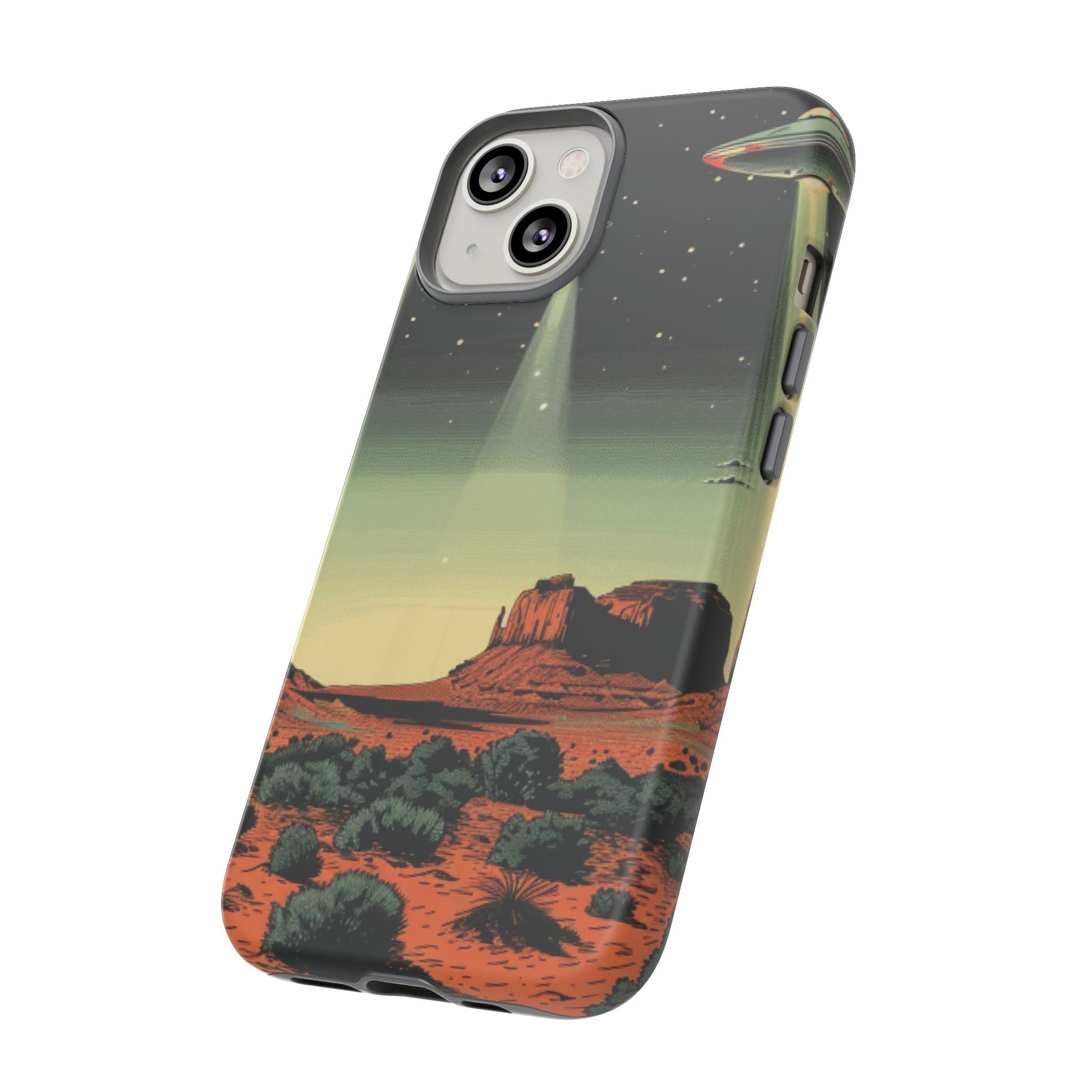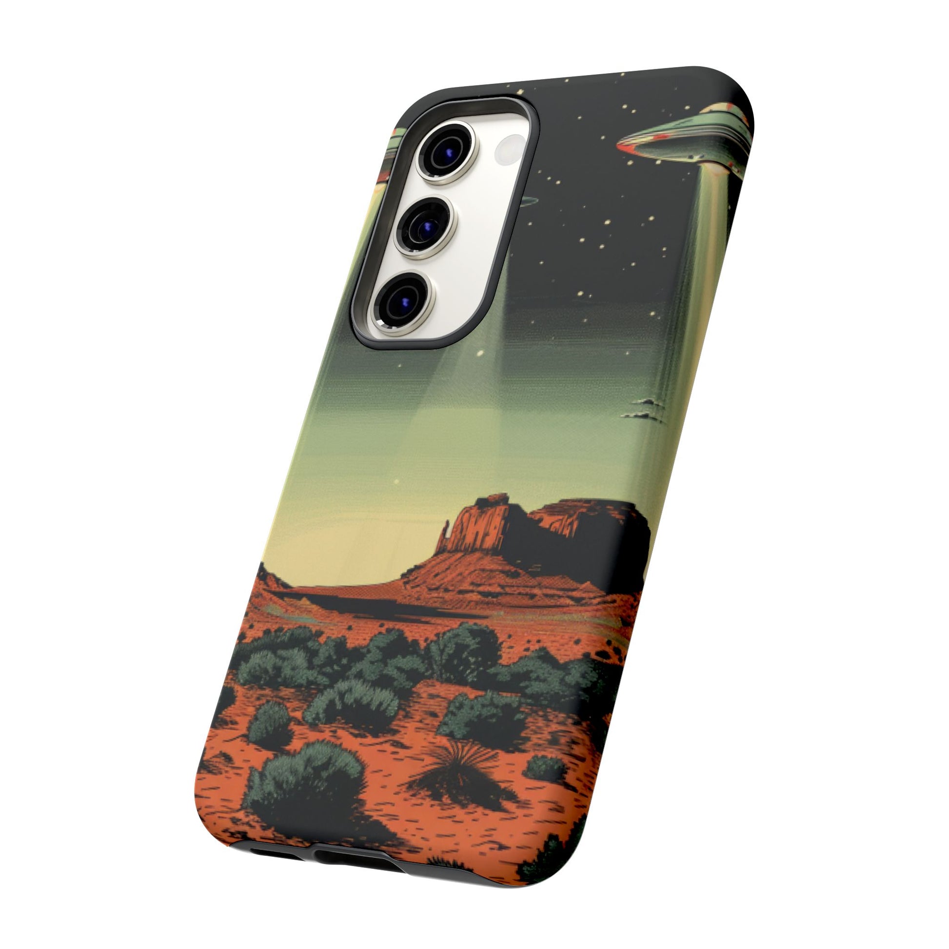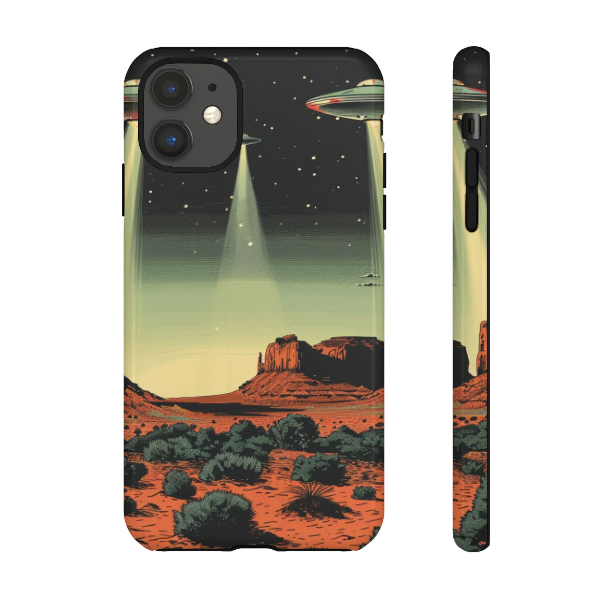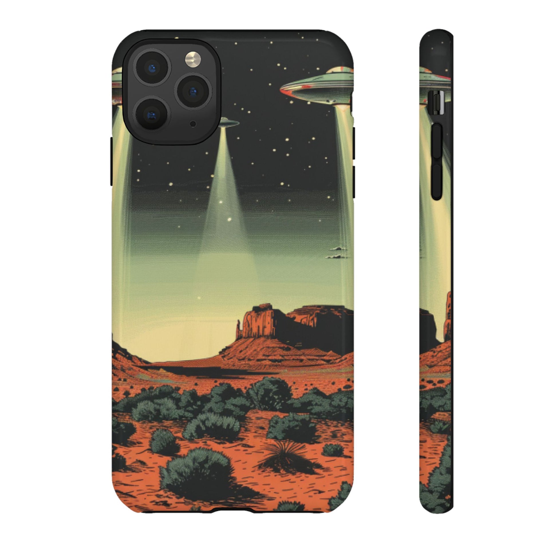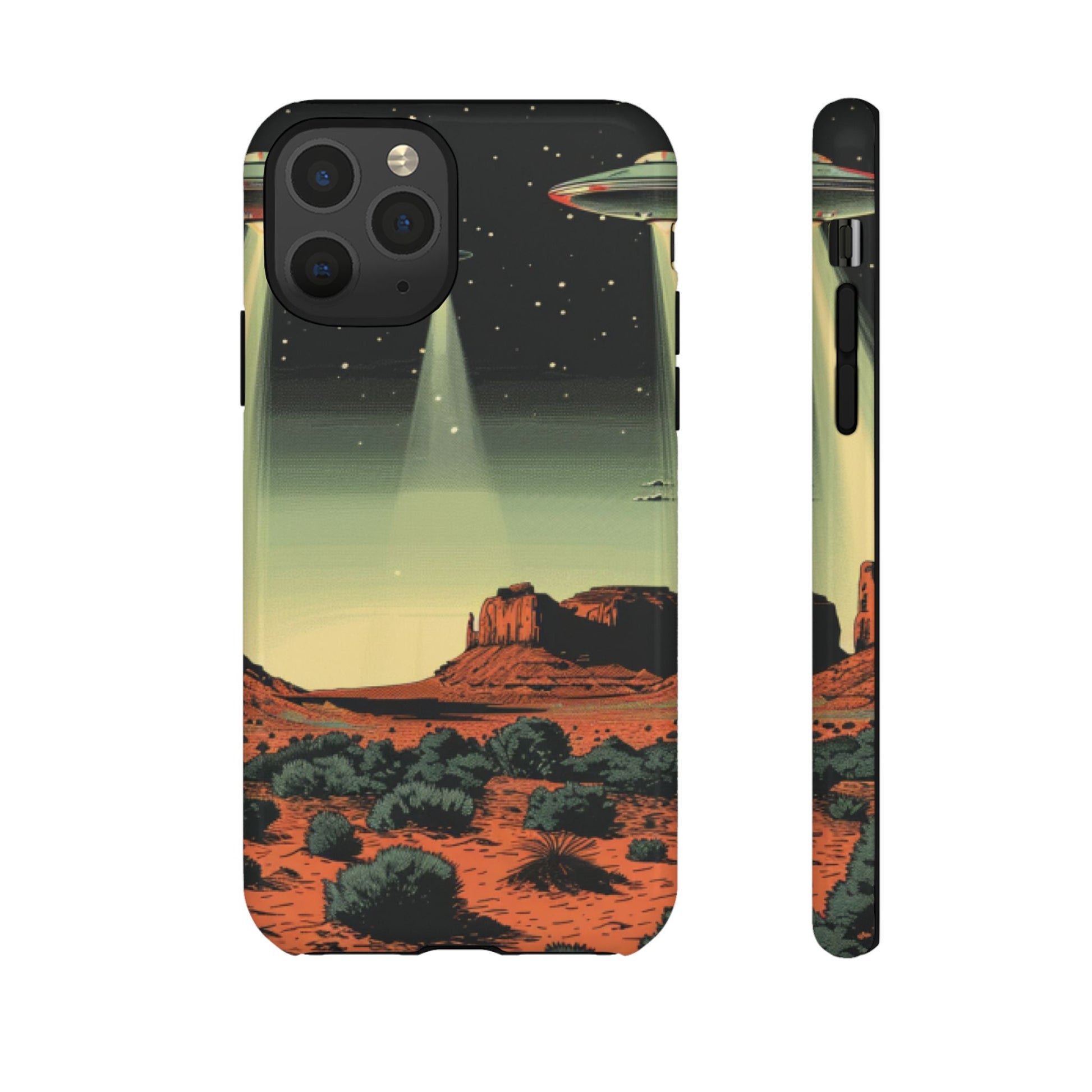 Night drives across red rock mesas, a hush of stars, and suddenly a silver disc sliding through the desert sky — this protective phone case carries that slow, cinematic thrill into everyday life. The double-layer shell hugs your phone while the TPU liner cushions every knock. The scene wraps fully around the case, keeping the vintage sci‑fi illustration crisp and weather-resistant. It’s for people who like their gear tough but mysterious: road‑trip storytellers, late-night stargazers, and collectors of retro space art. Use it on long drives, at outdoor meetups, or when you want a small, daily reminder of wide open places and strange lights on the horizon.
