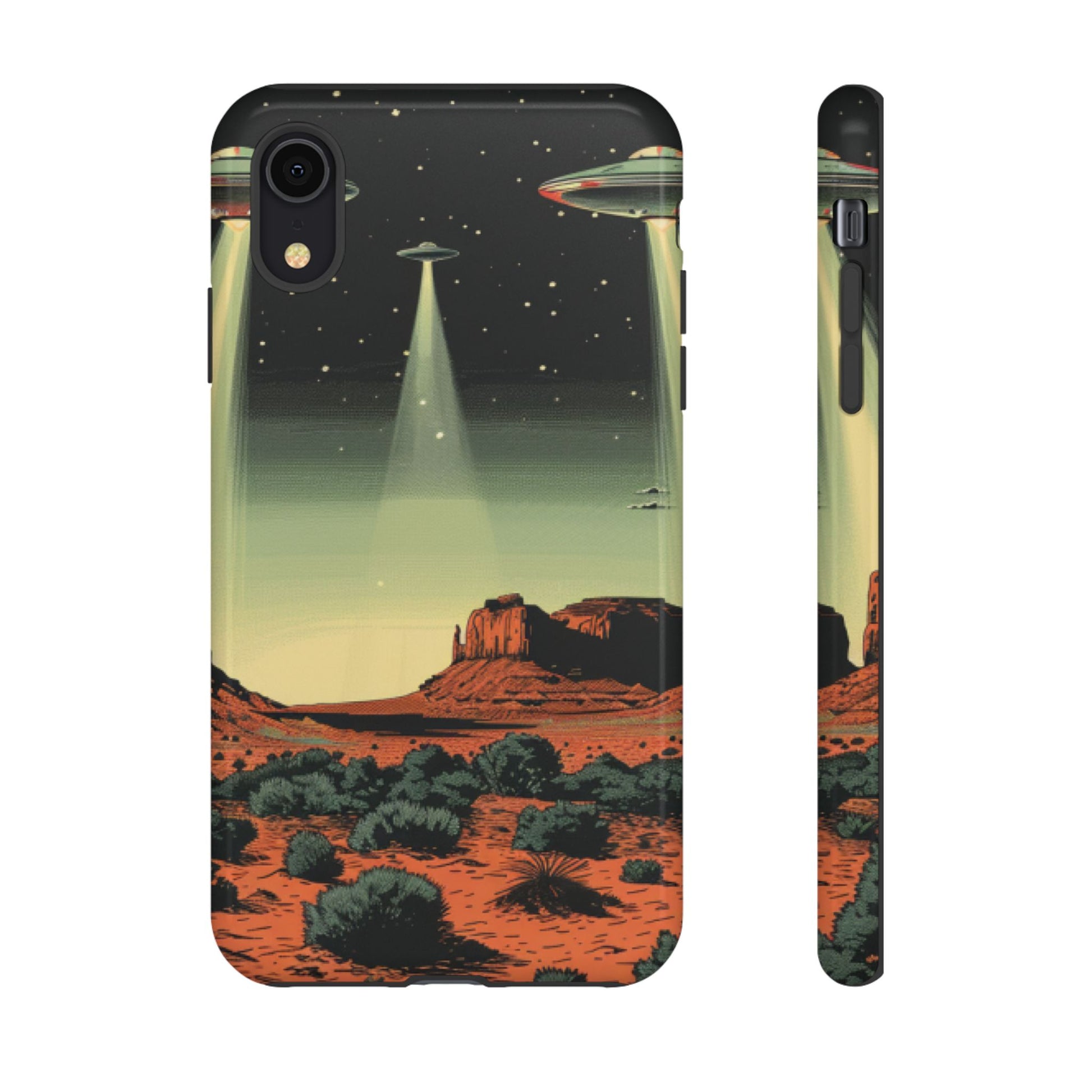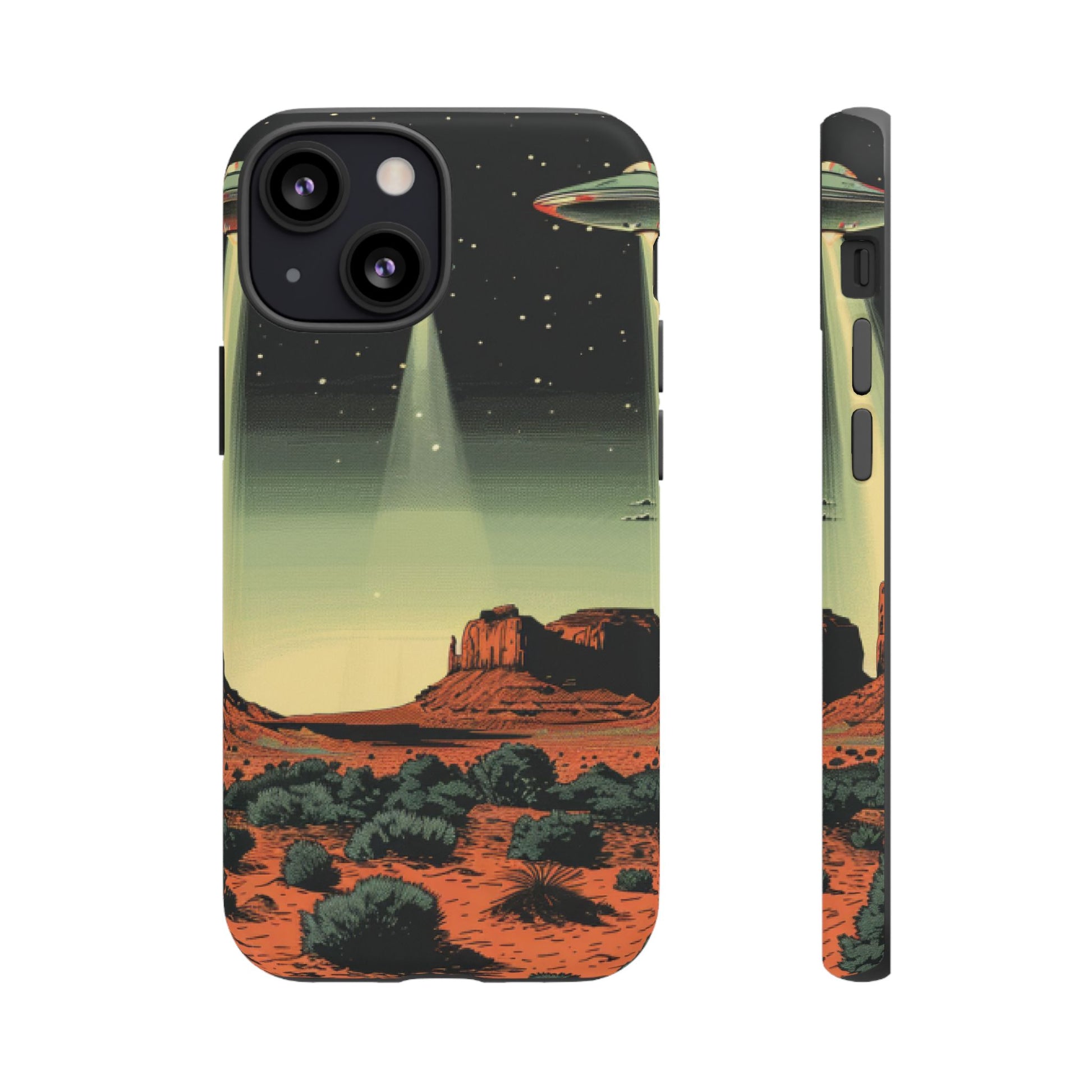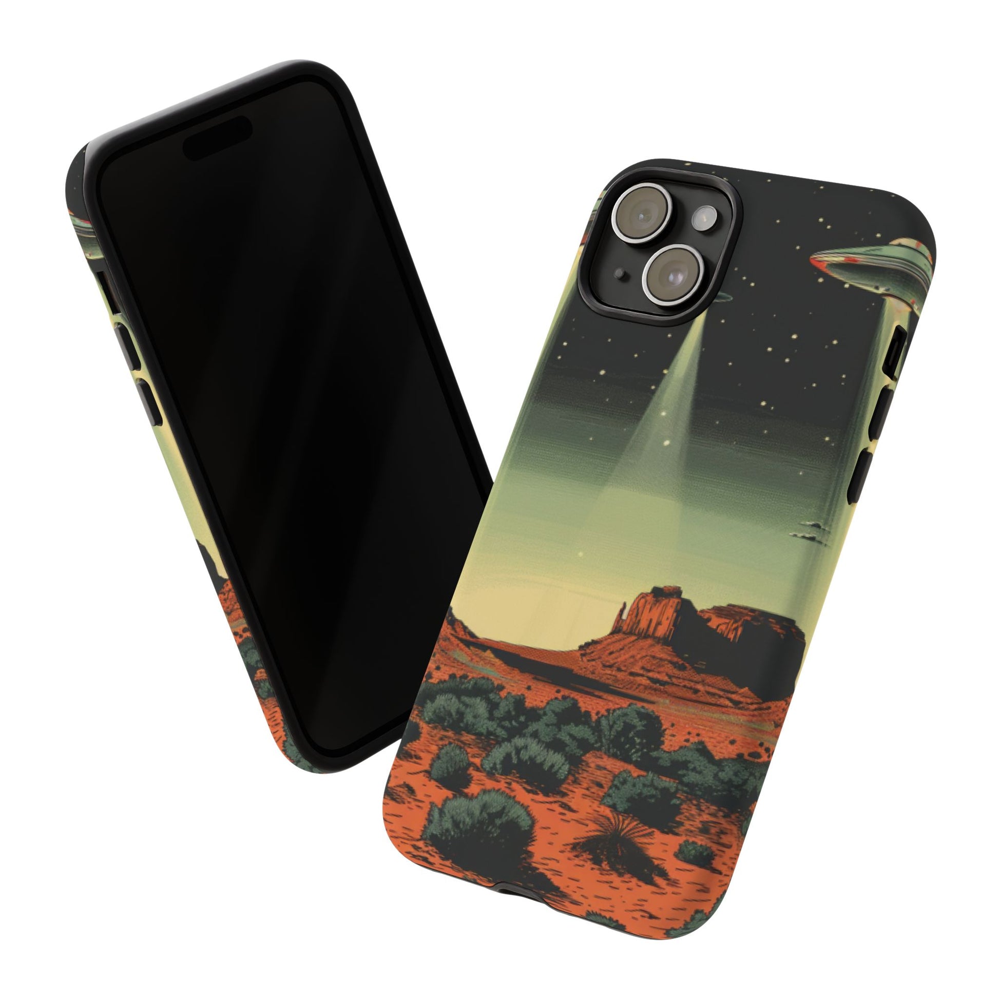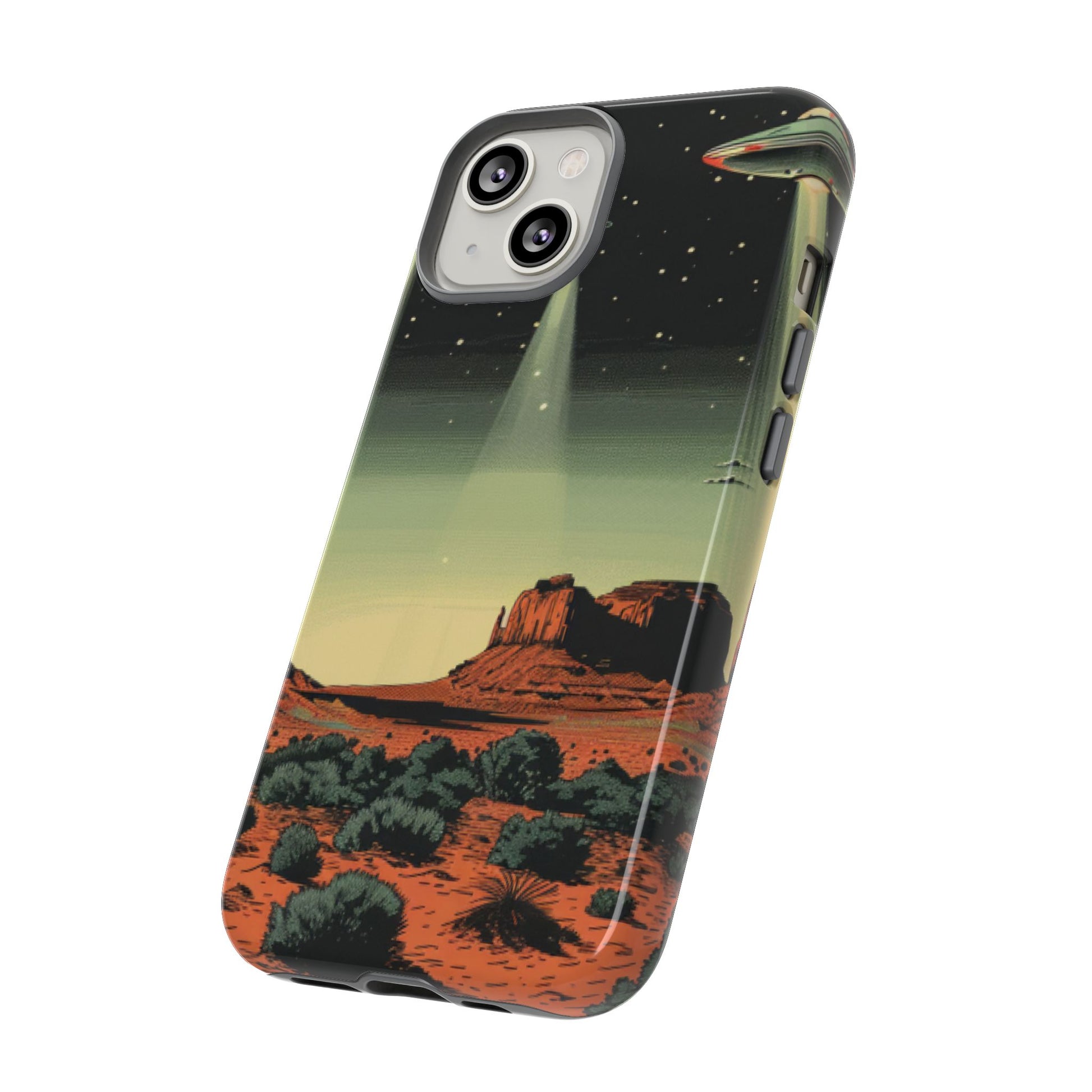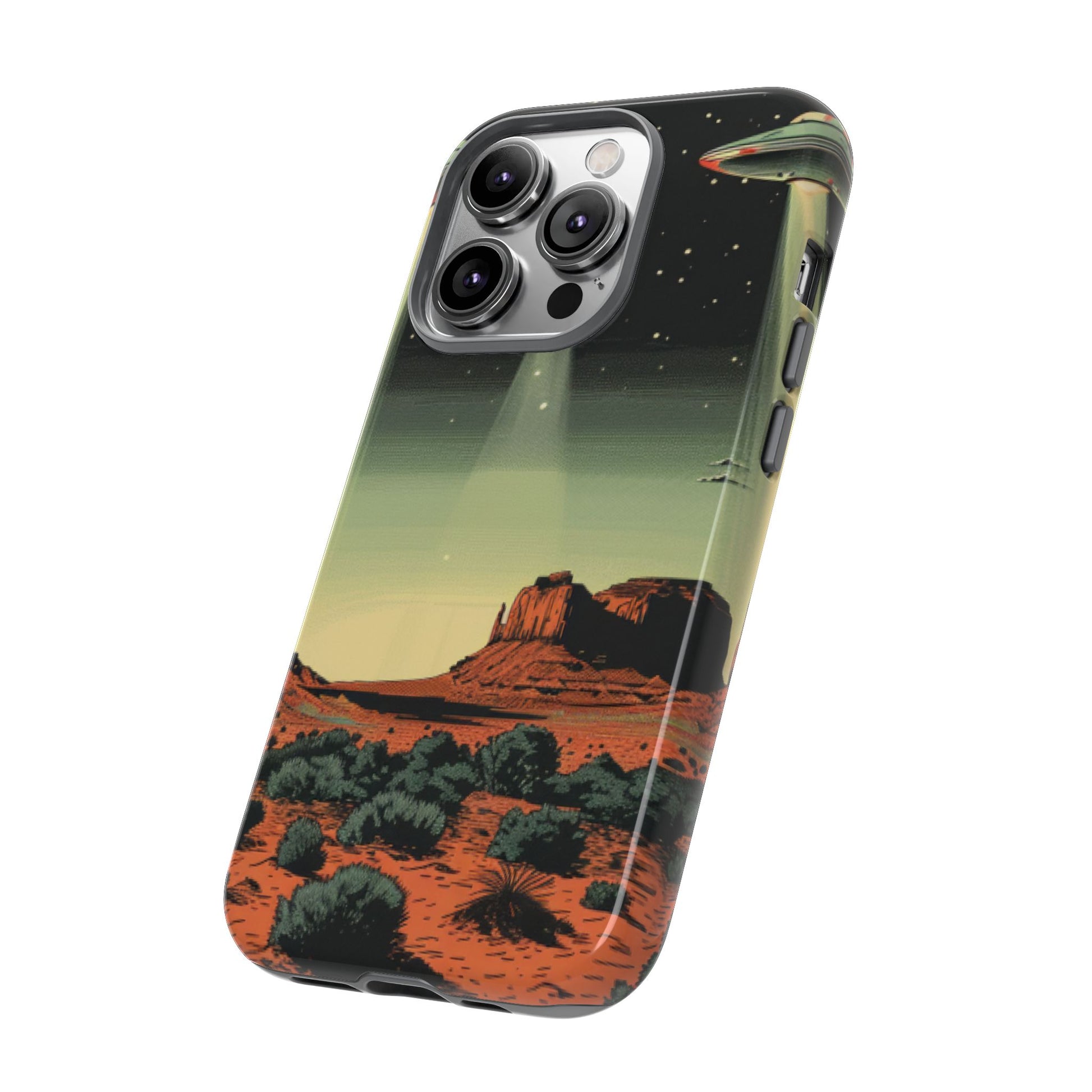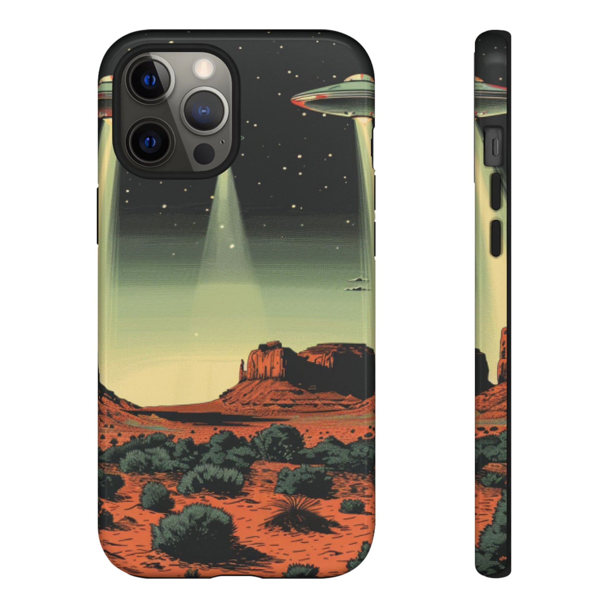 Night drives across red rock mesas, a hush of stars, and suddenly a silver disc sliding through the desert sky — this protective phone case carries that slow, cinematic thrill into everyday life. The double-layer shell hugs your phone while the TPU liner cushions every knock. The scene wraps fully around the case, keeping the vintage sci‑fi illustration crisp and weather-resistant. It’s for people who like their gear tough but mysterious: road‑trip storytellers, late-night stargazers, and collectors of retro space art. Use it on long drives, at outdoor meetups, or when you want a small, daily reminder of wide open places and strange lights on the horizon.