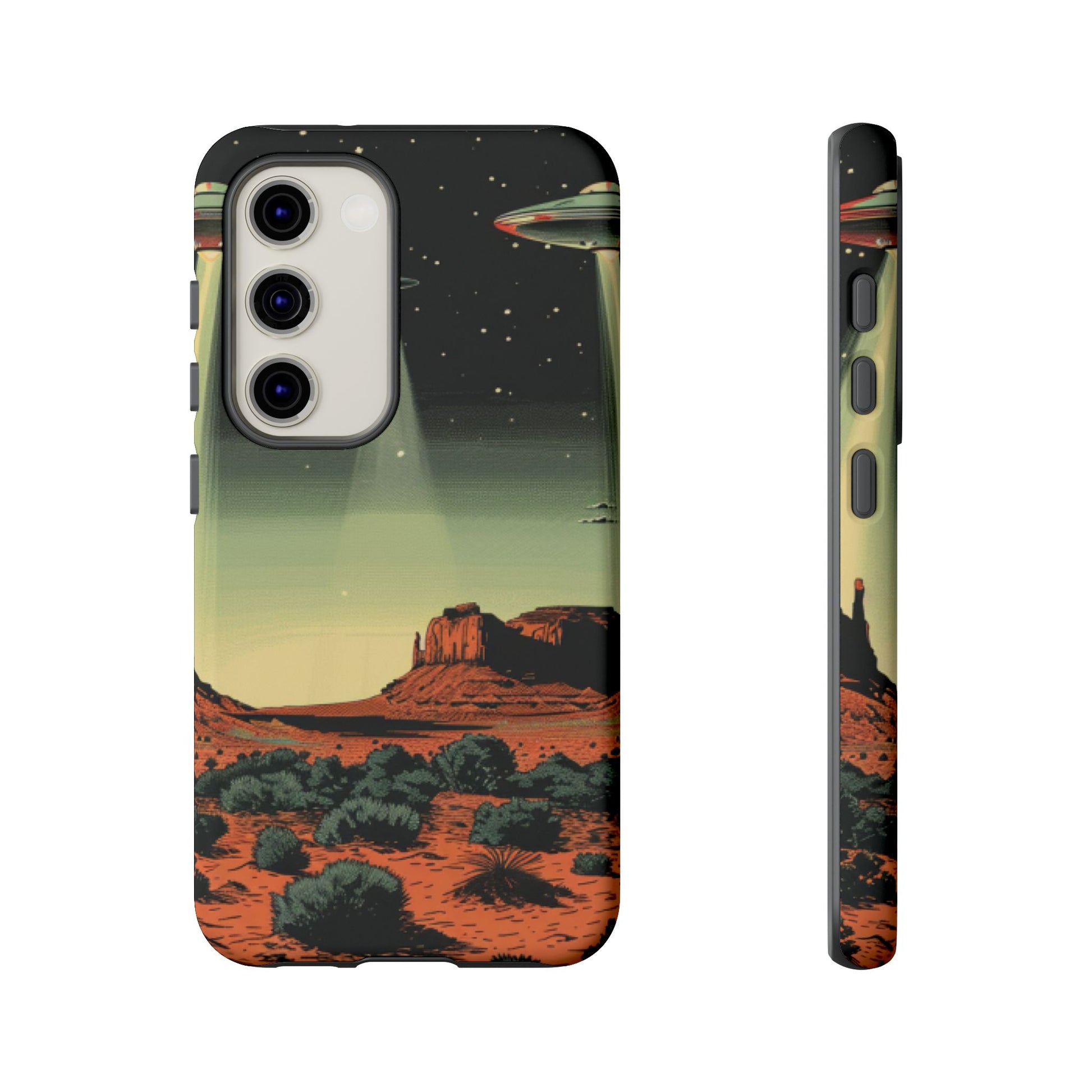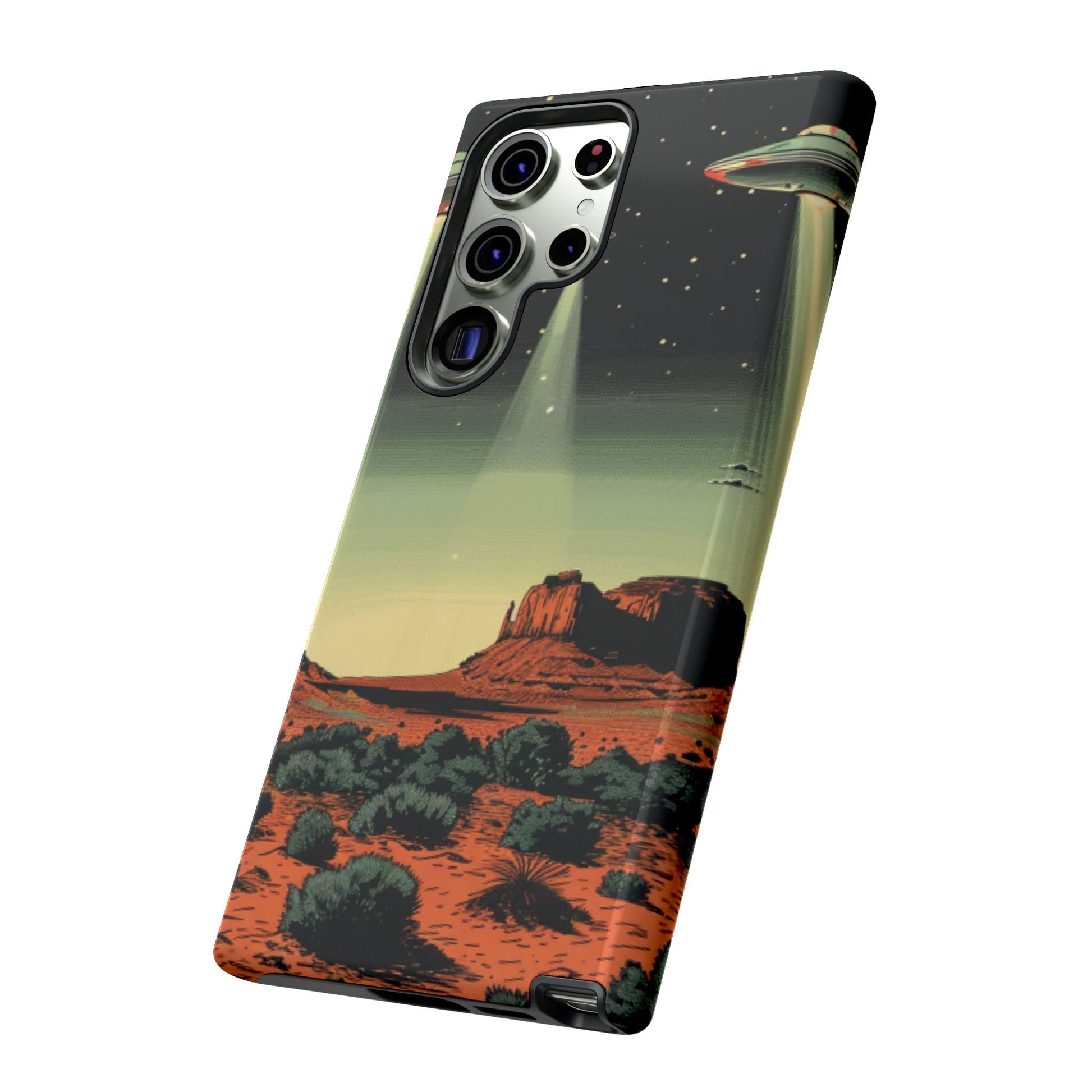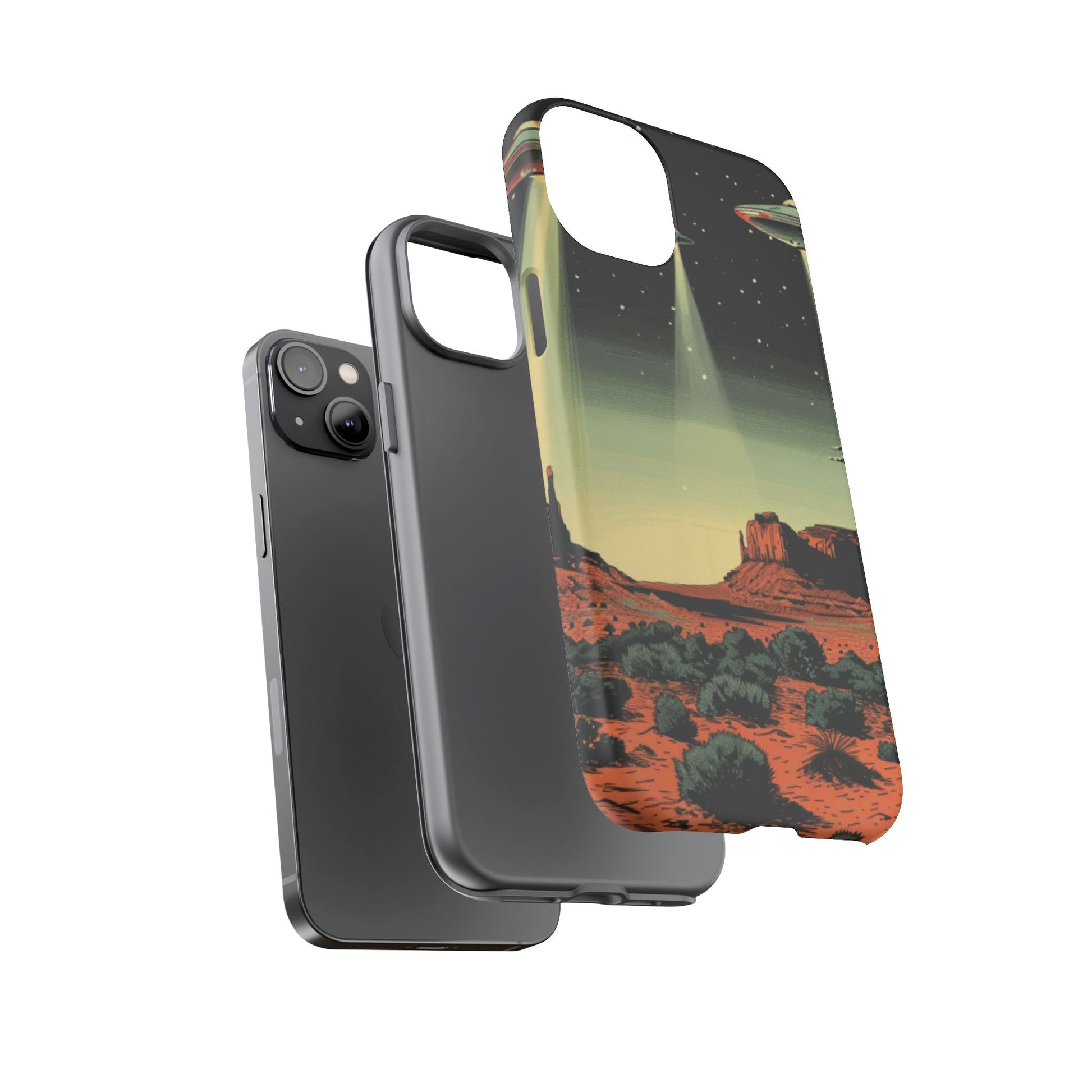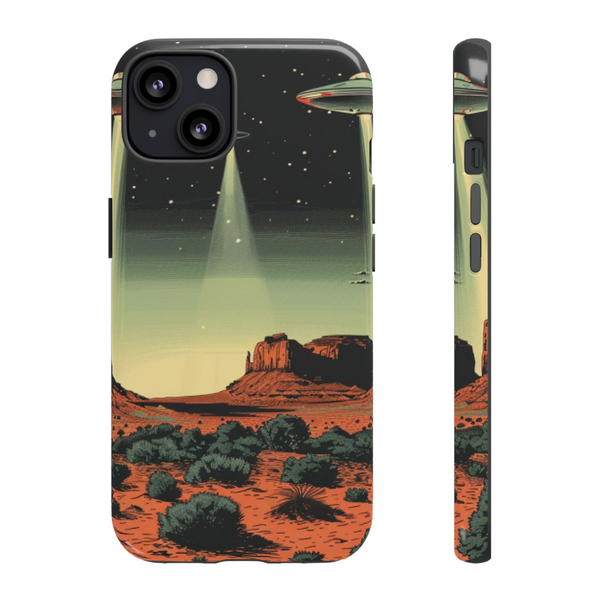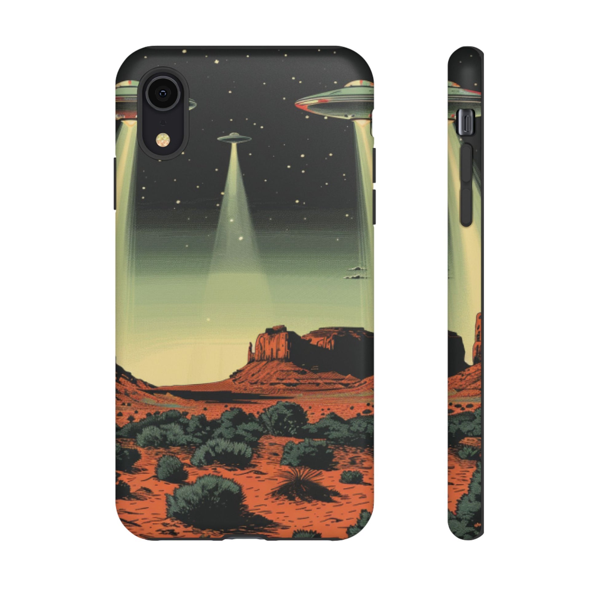 Night drives across red rock mesas, a hush of stars, and suddenly a silver disc sliding through the desert sky — this protective phone case carries that slow, cinematic thrill into everyday life. The double-layer shell hugs your phone while the TPU liner cushions every knock. The scene wraps fully around the case, keeping the vintage sci‑fi illustration crisp and weather-resistant. It’s for people who like their gear tough but mysterious: road‑trip storytellers, late-night stargazers, and collectors of retro space art. Use it on long drives, at outdoor meetups, or when you want a small, daily reminder of wide open places and strange lights on the horizon.