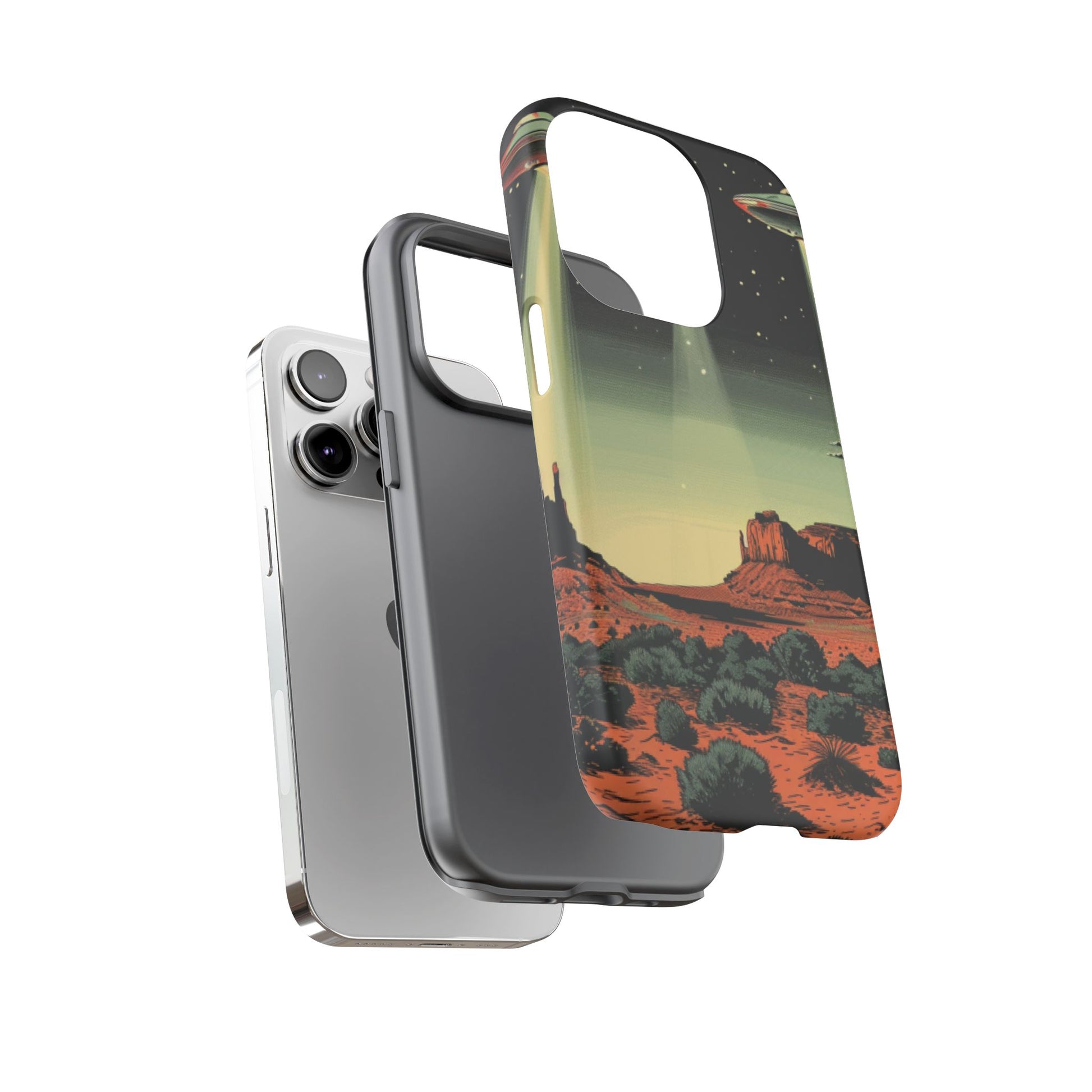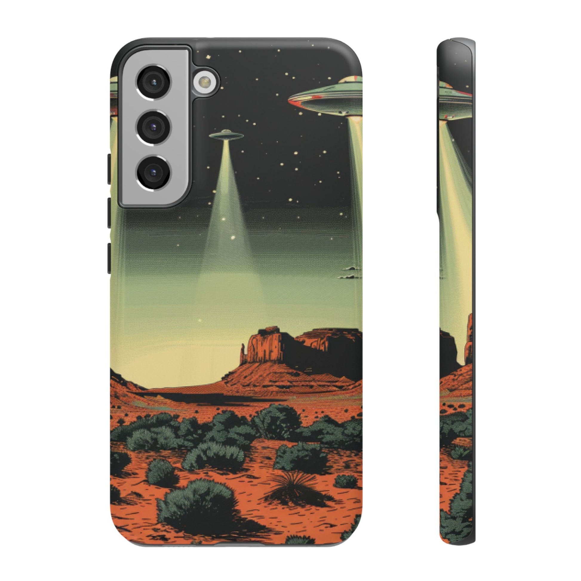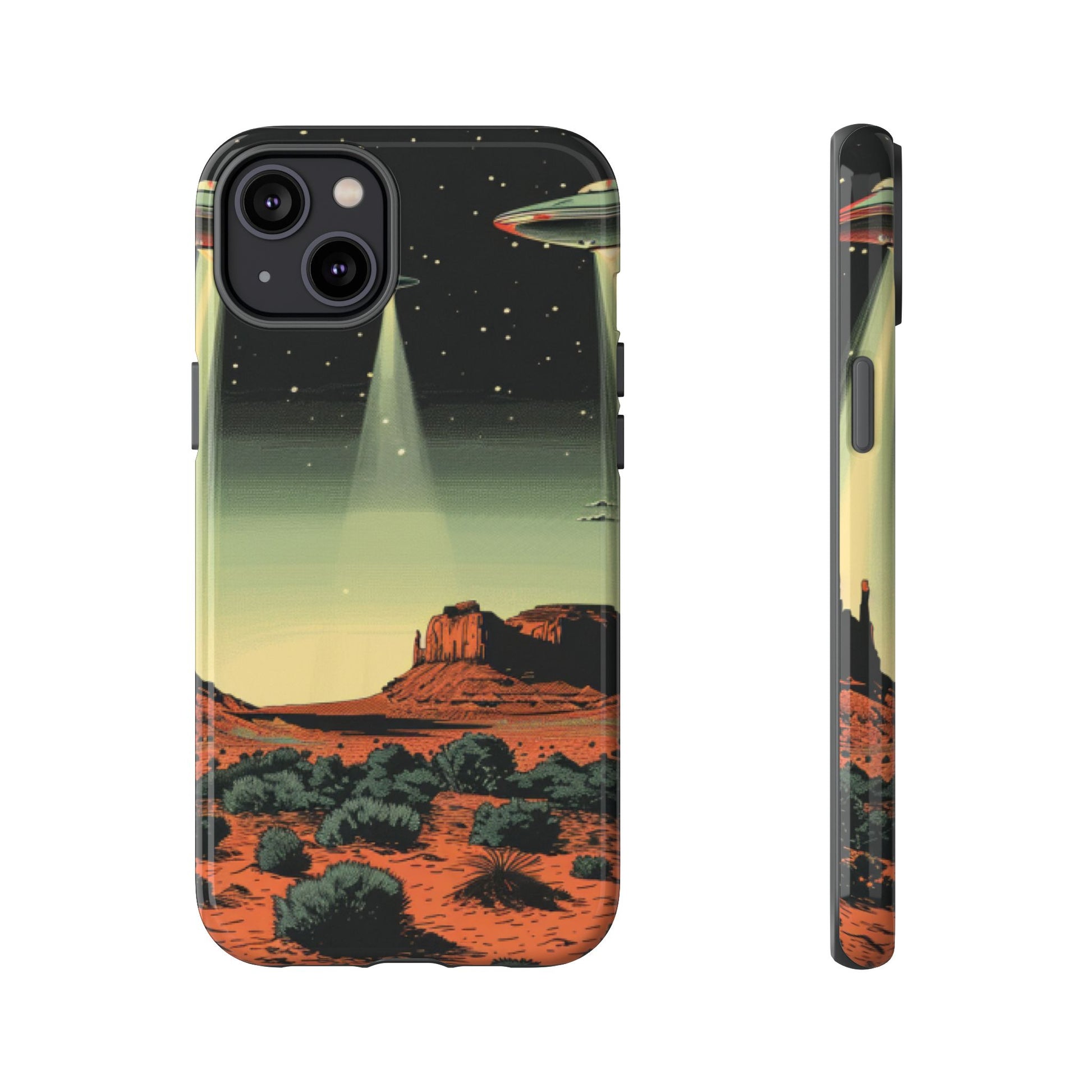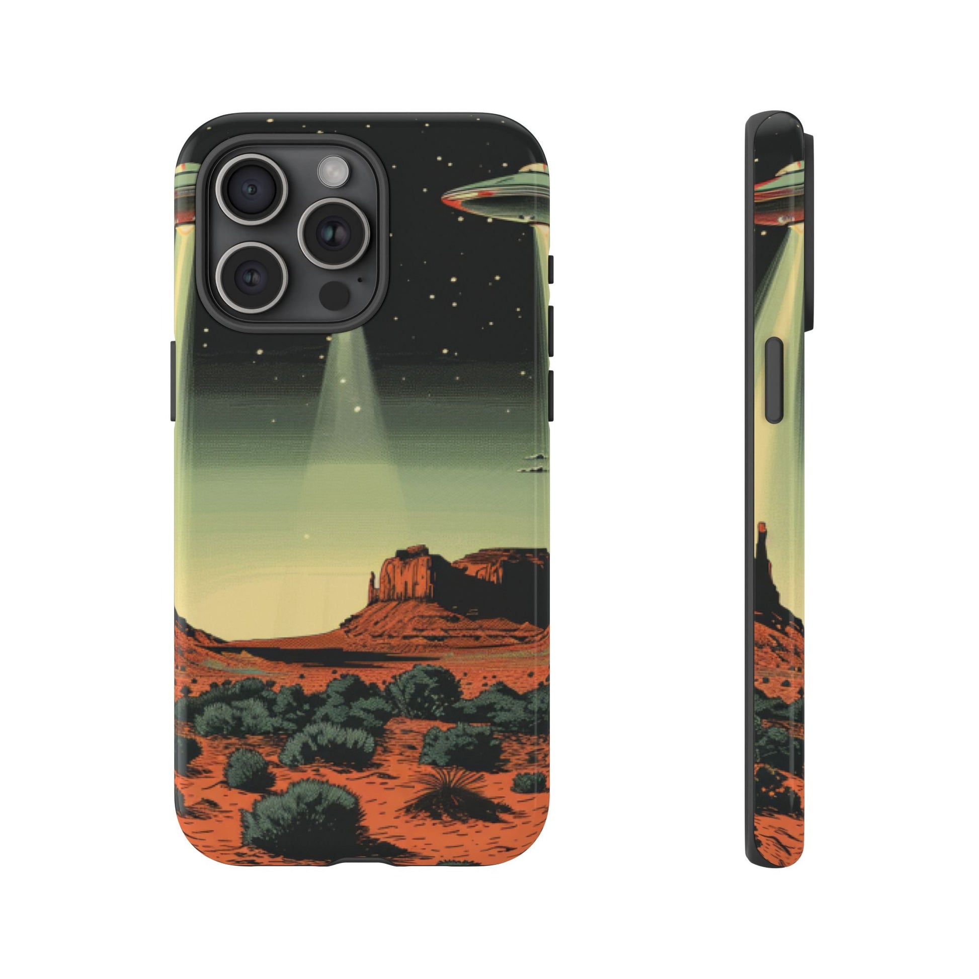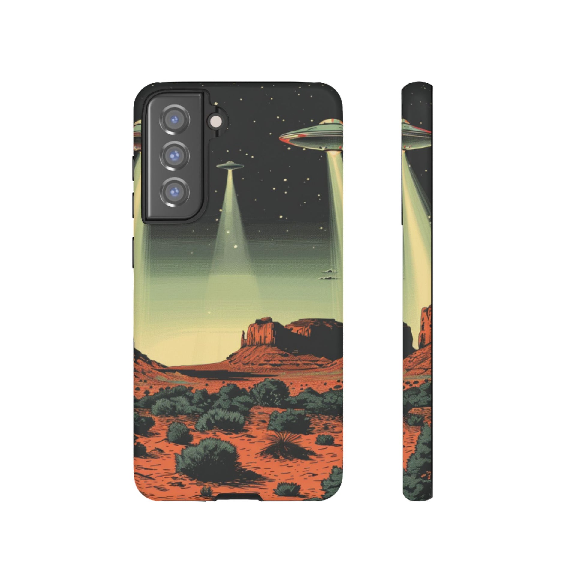 Night drives across red rock mesas, a hush of stars, and suddenly a silver disc sliding through the desert sky — this protective phone case carries that slow, cinematic thrill into everyday life. The double-layer shell hugs your phone while the TPU liner cushions every knock. The scene wraps fully around the case, keeping the vintage sci‑fi illustration crisp and weather-resistant. It’s for people who like their gear tough but mysterious: road‑trip storytellers, late-night stargazers, and collectors of retro space art. Use it on long drives, at outdoor meetups, or when you want a small, daily reminder of wide open places and strange lights on the horizon.