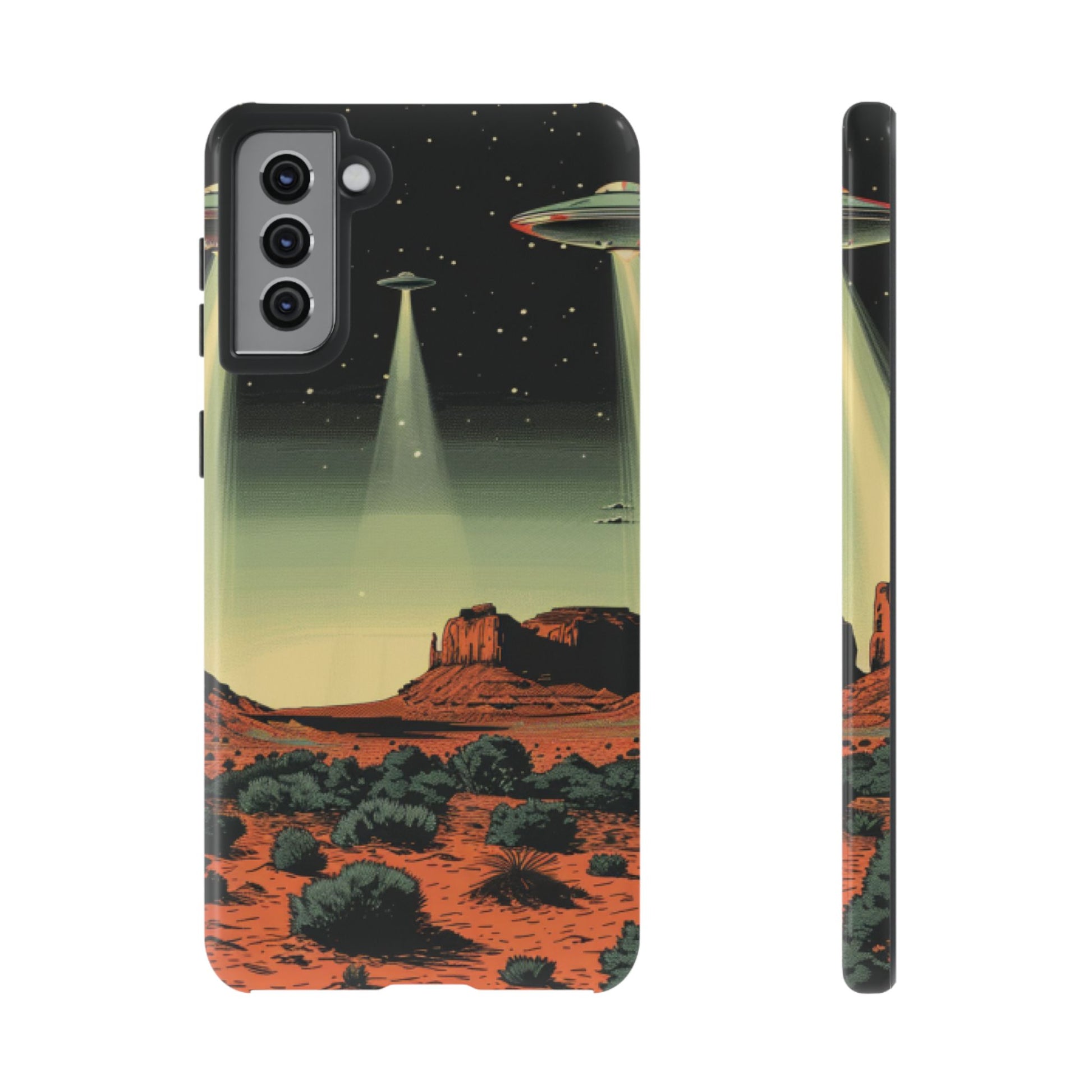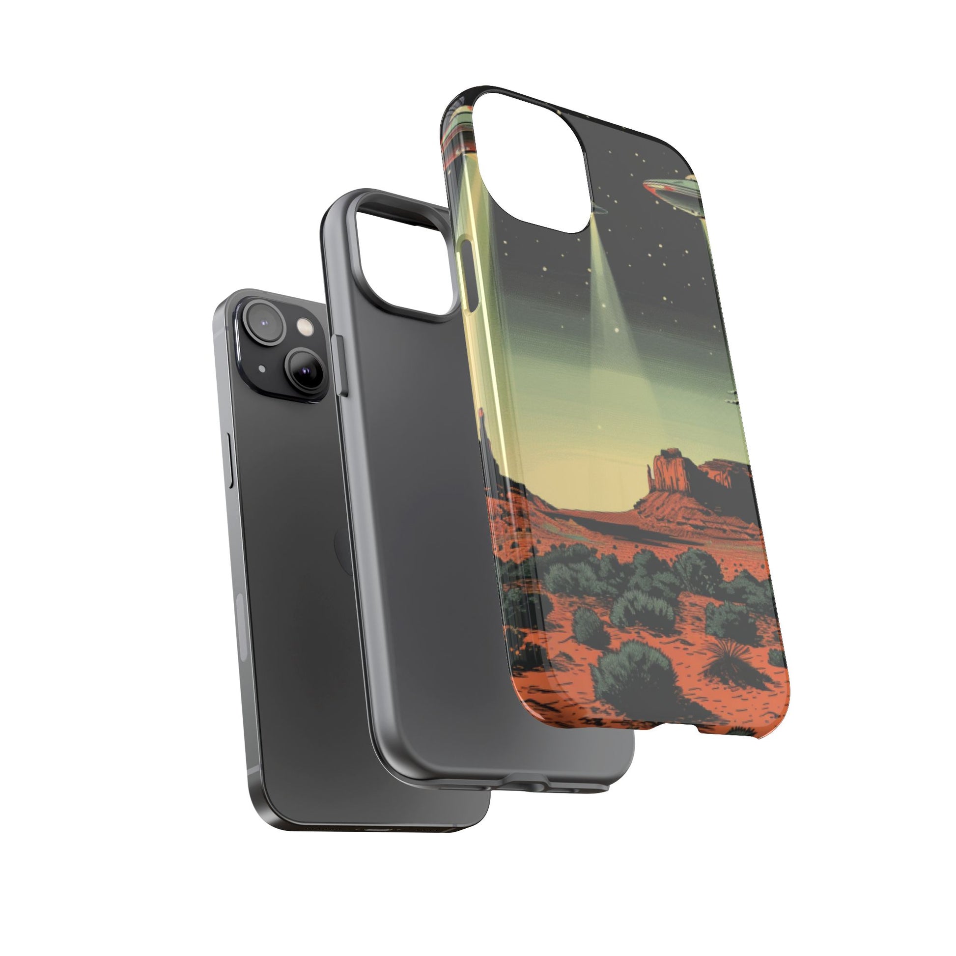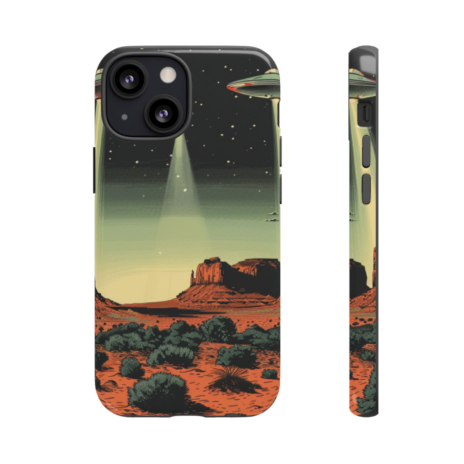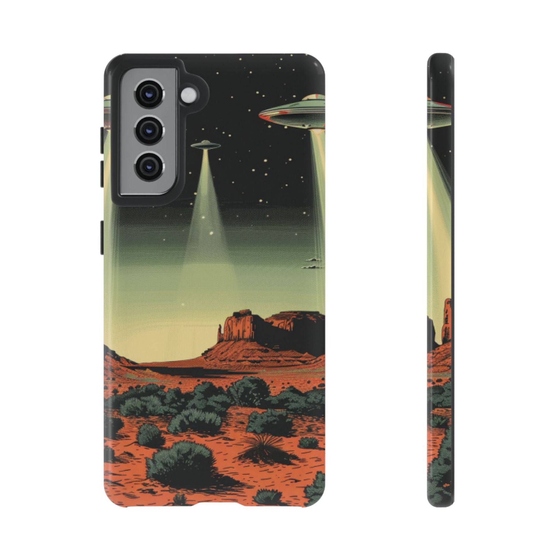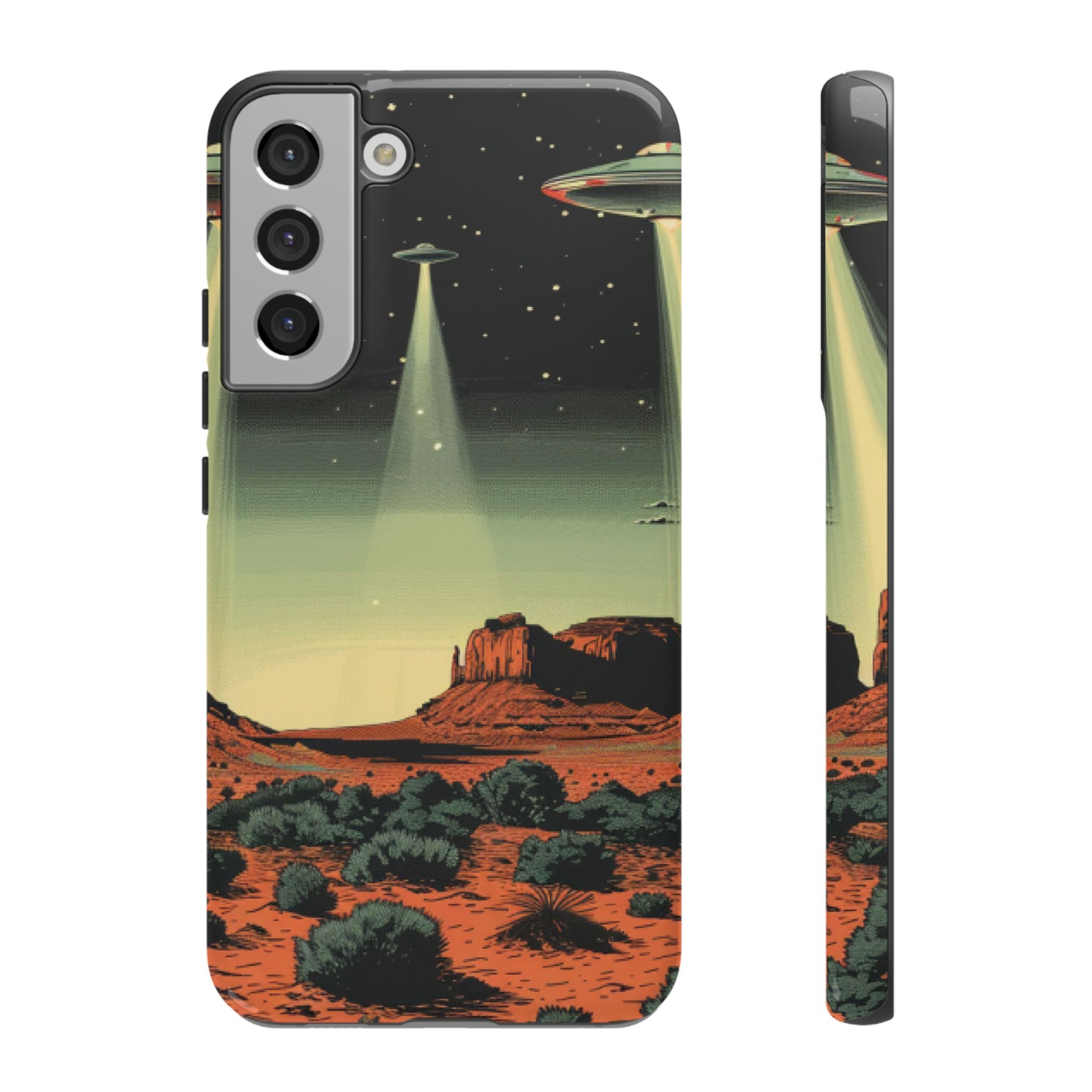 Night drives across red rock mesas, a hush of stars, and suddenly a silver disc sliding through the desert sky — this protective phone case carries that slow, cinematic thrill into everyday life. The double-layer shell hugs your phone while the TPU liner cushions every knock. The scene wraps fully around the case, keeping the vintage sci‑fi illustration crisp and weather-resistant. It’s for people who like their gear tough but mysterious: road‑trip storytellers, late-night stargazers, and collectors of retro space art. Use it on long drives, at outdoor meetups, or when you want a small, daily reminder of wide open places and strange lights on the horizon.