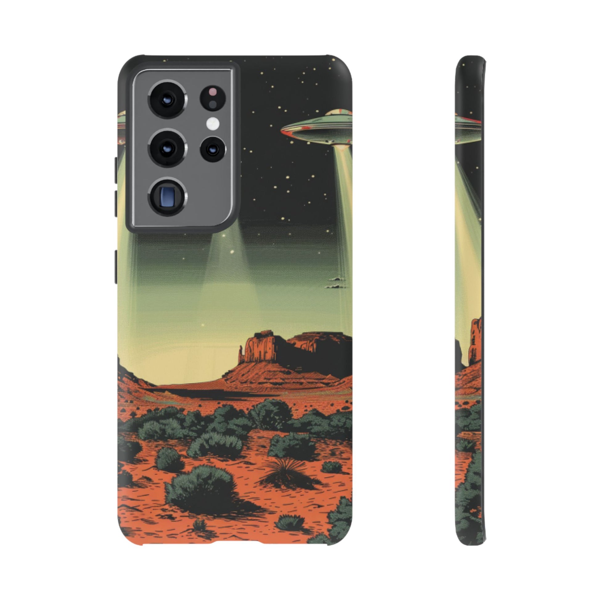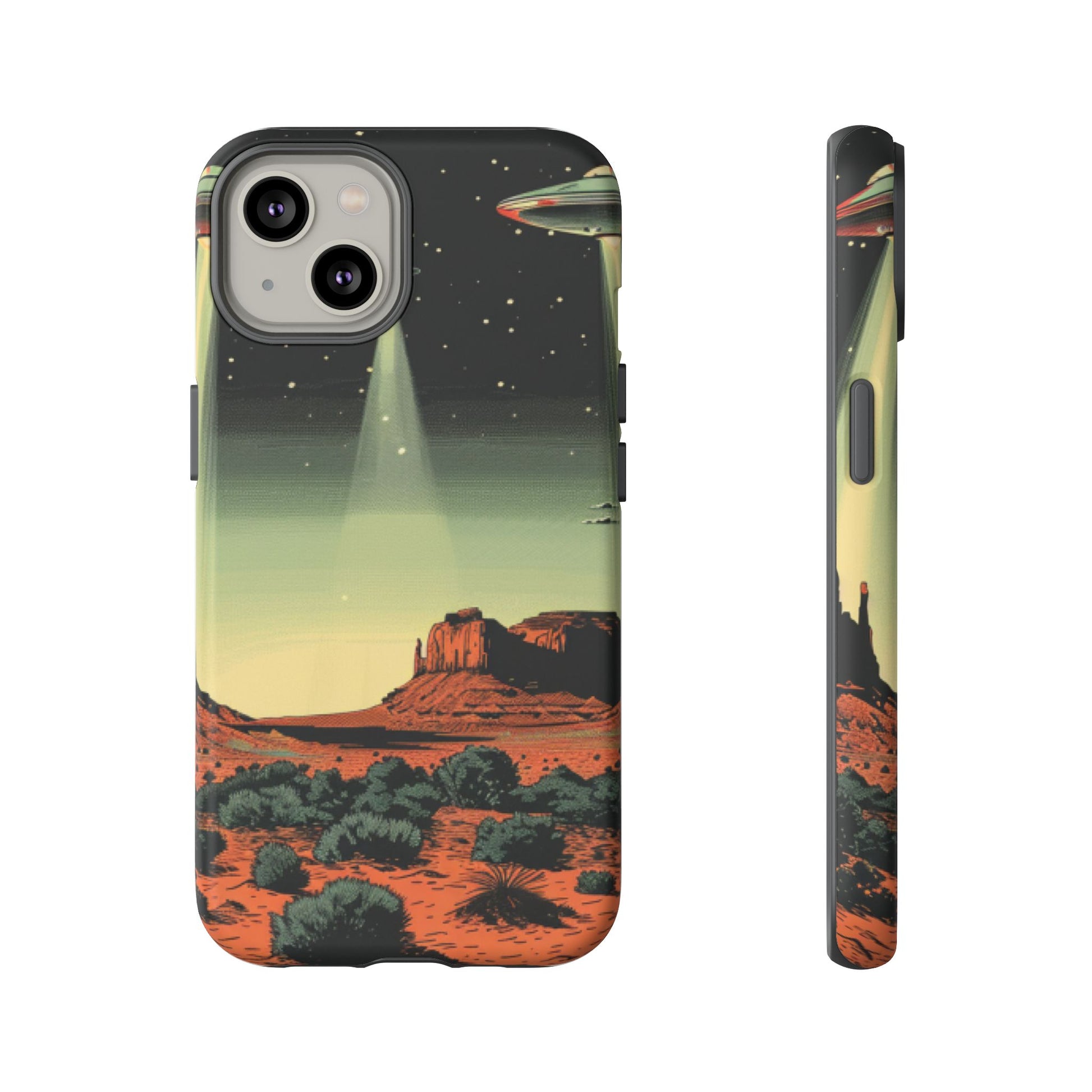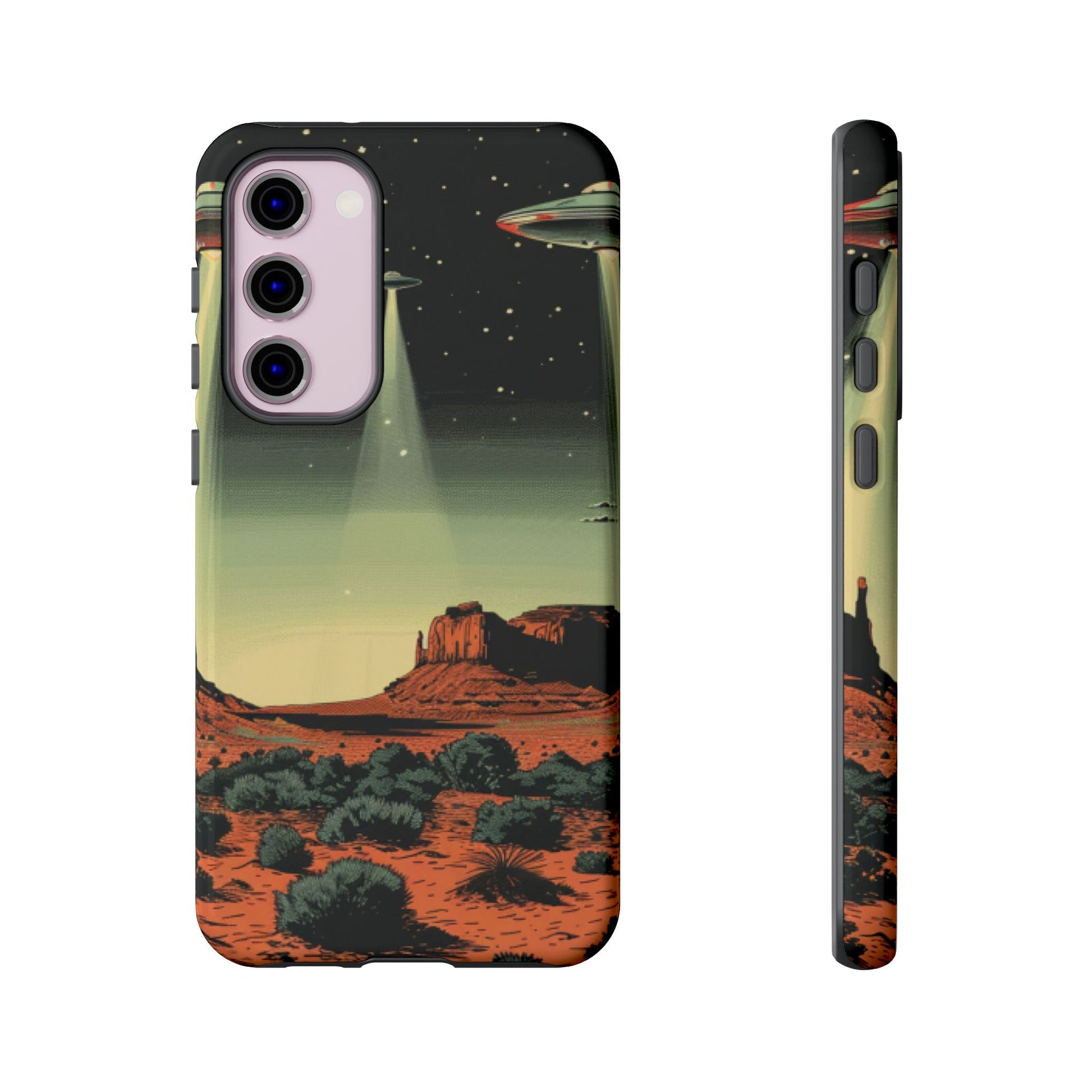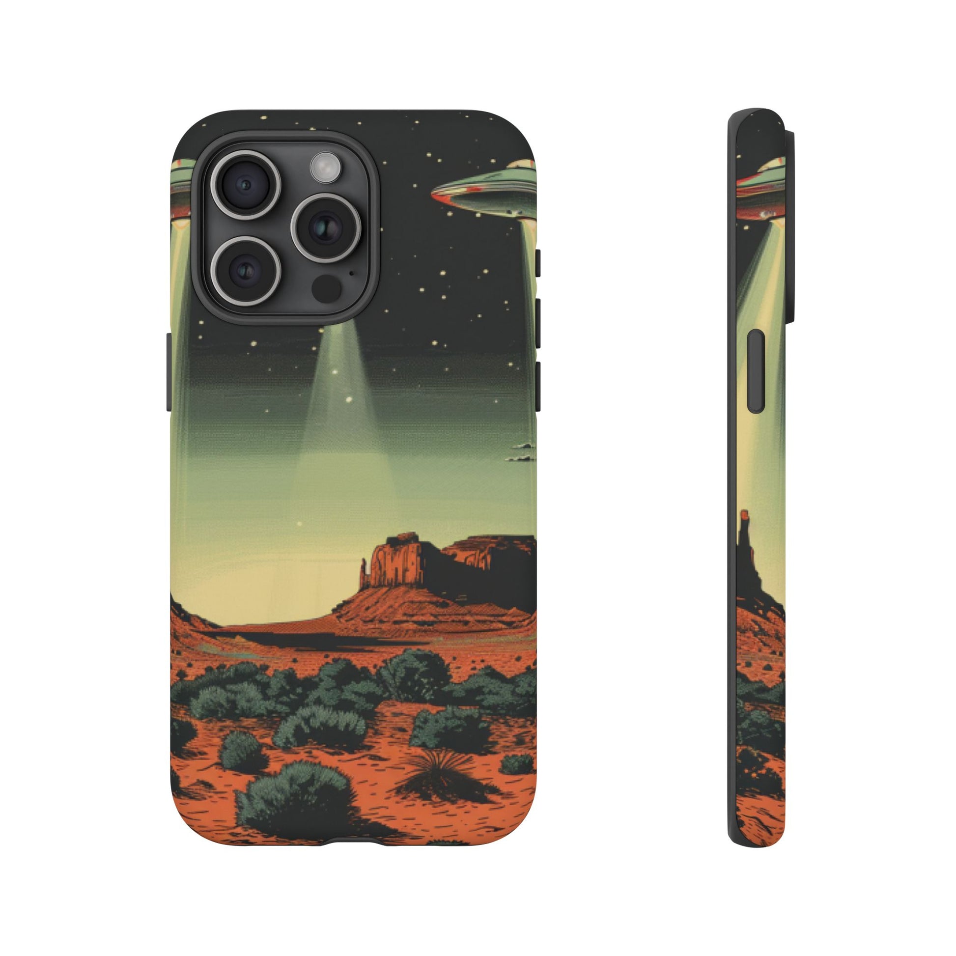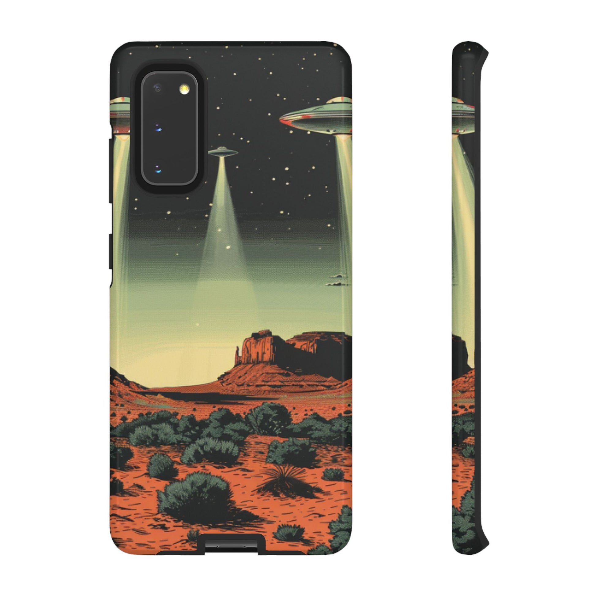 Night drives across red rock mesas, a hush of stars, and suddenly a silver disc sliding through the desert sky — this protective phone case carries that slow, cinematic thrill into everyday life. The double-layer shell hugs your phone while the TPU liner cushions every knock. The scene wraps fully around the case, keeping the vintage sci‑fi illustration crisp and weather-resistant. It’s for people who like their gear tough but mysterious: road‑trip storytellers, late-night stargazers, and collectors of retro space art. Use it on long drives, at outdoor meetups, or when you want a small, daily reminder of wide open places and strange lights on the horizon.