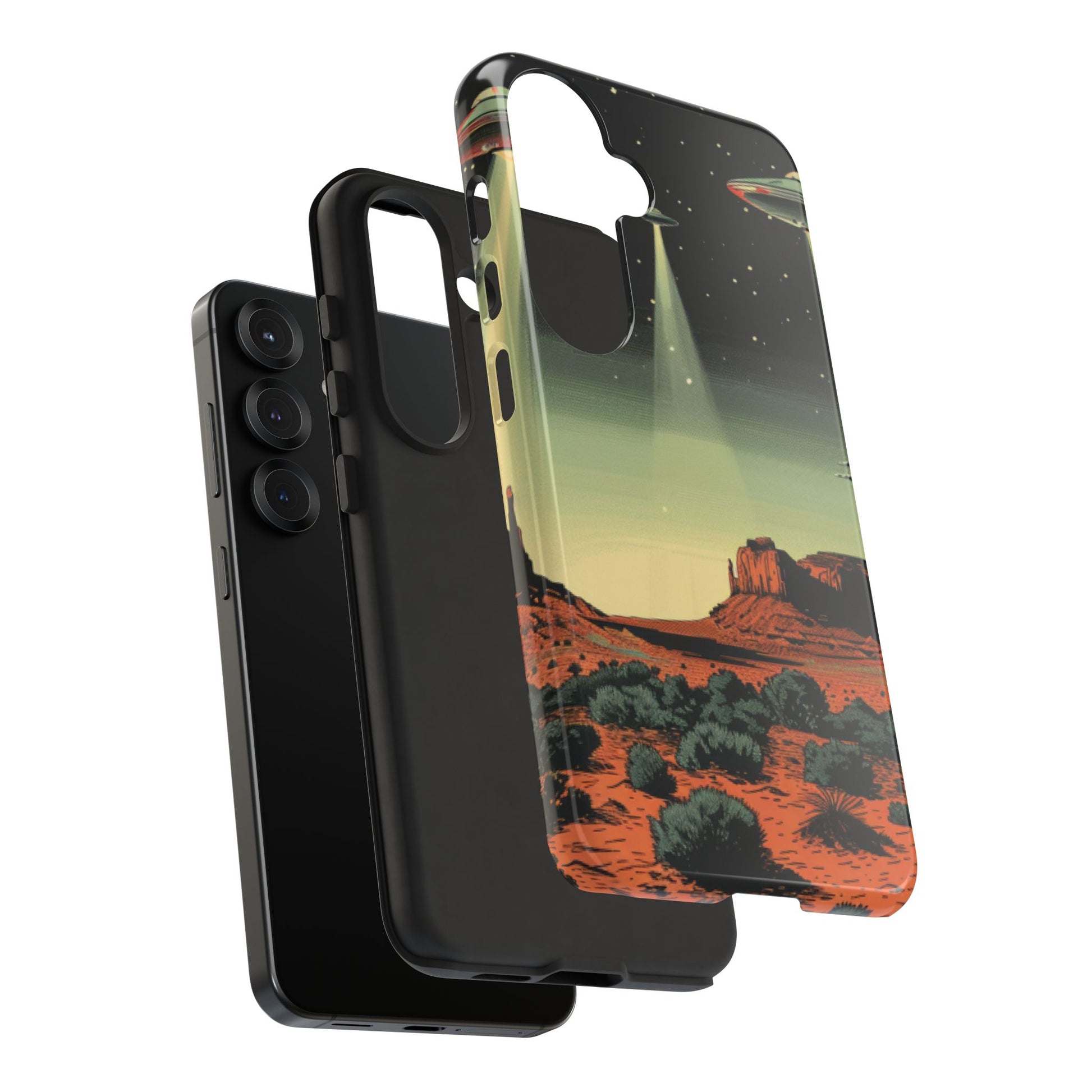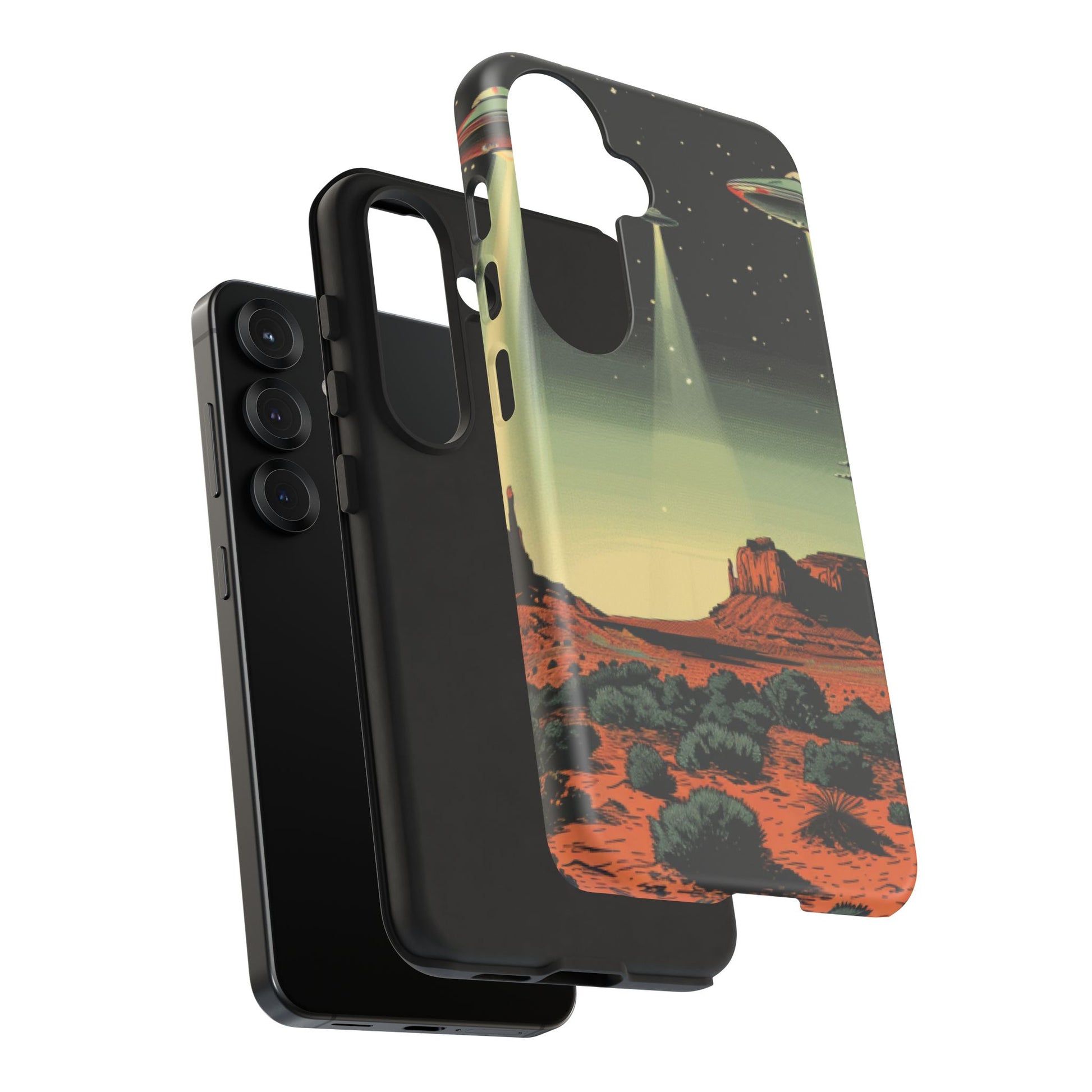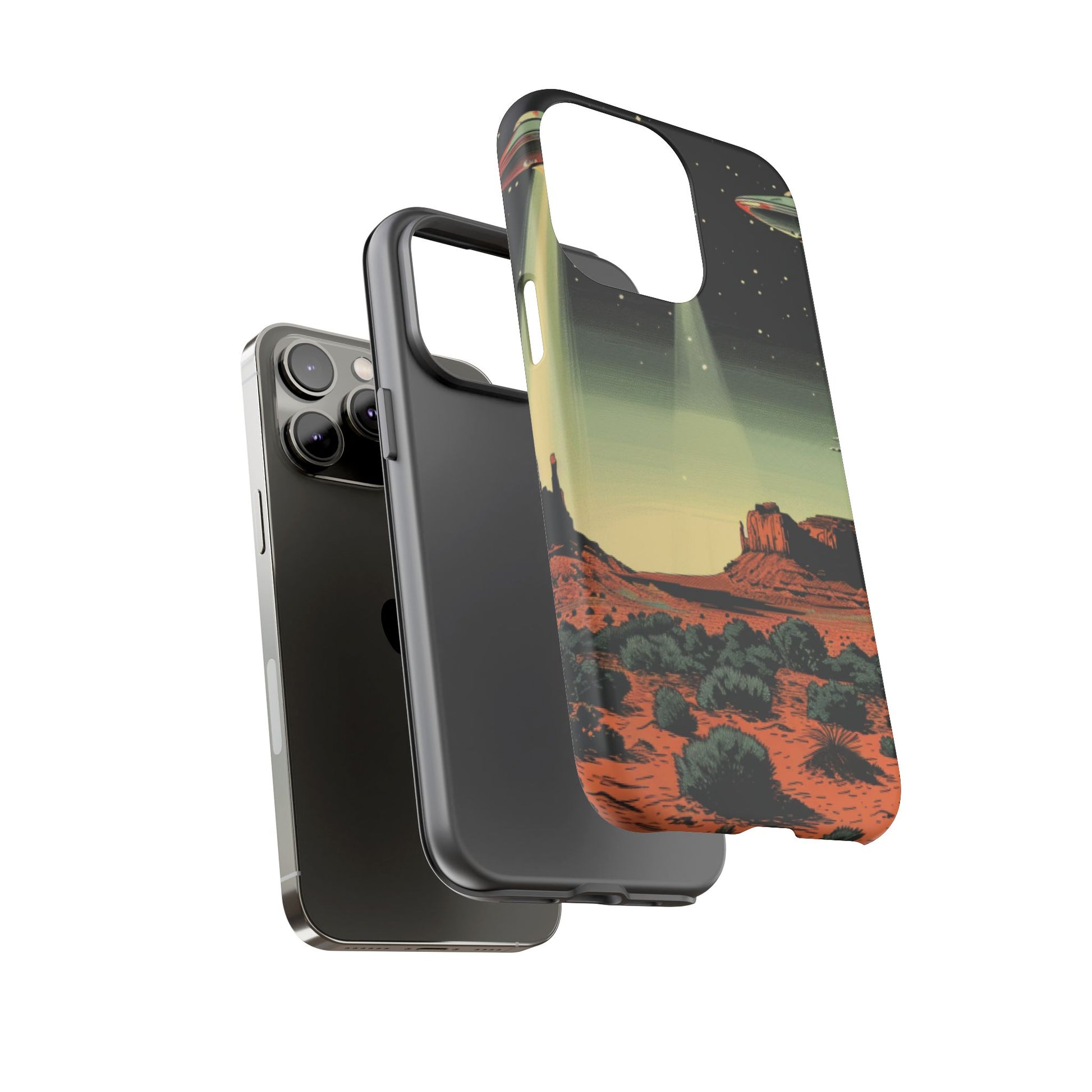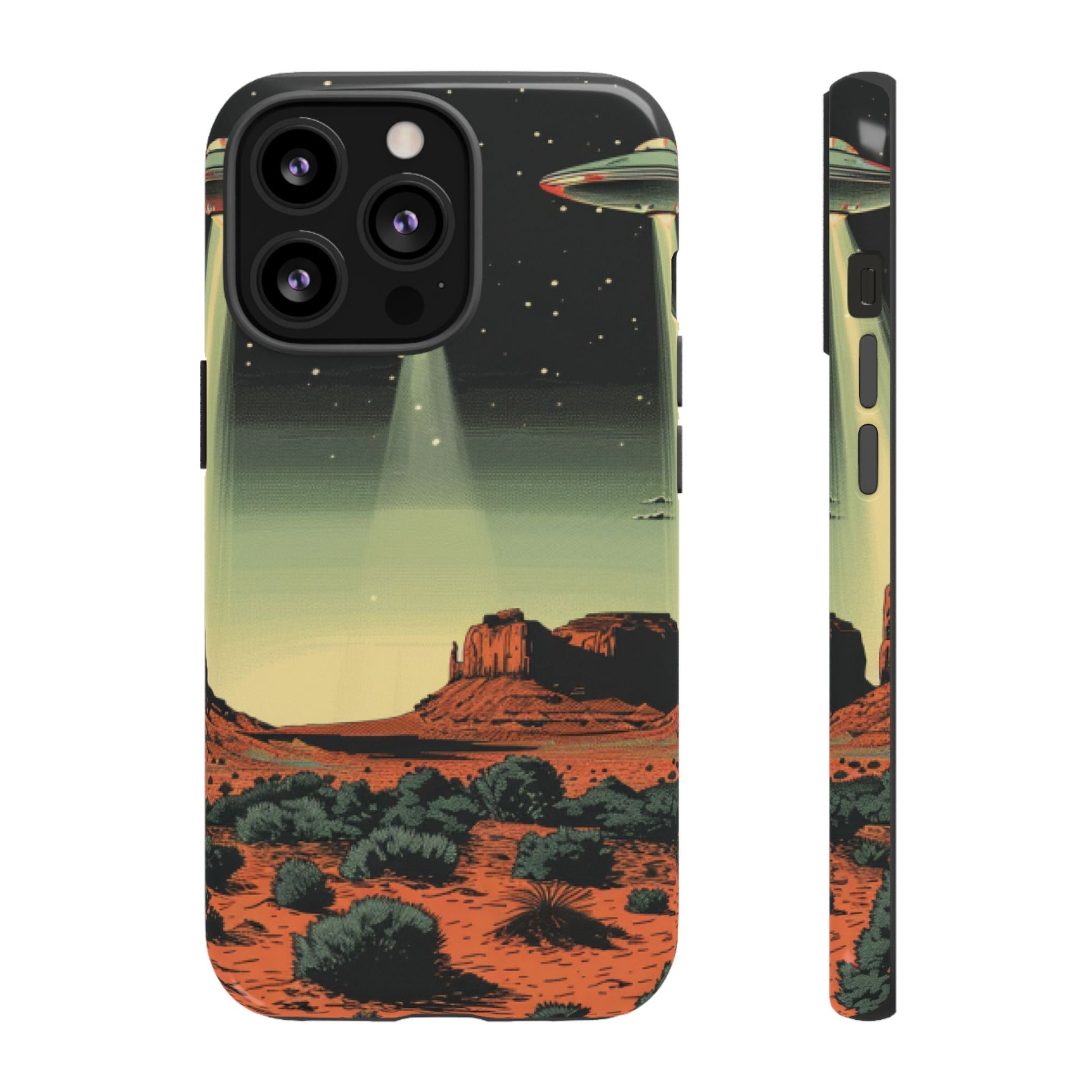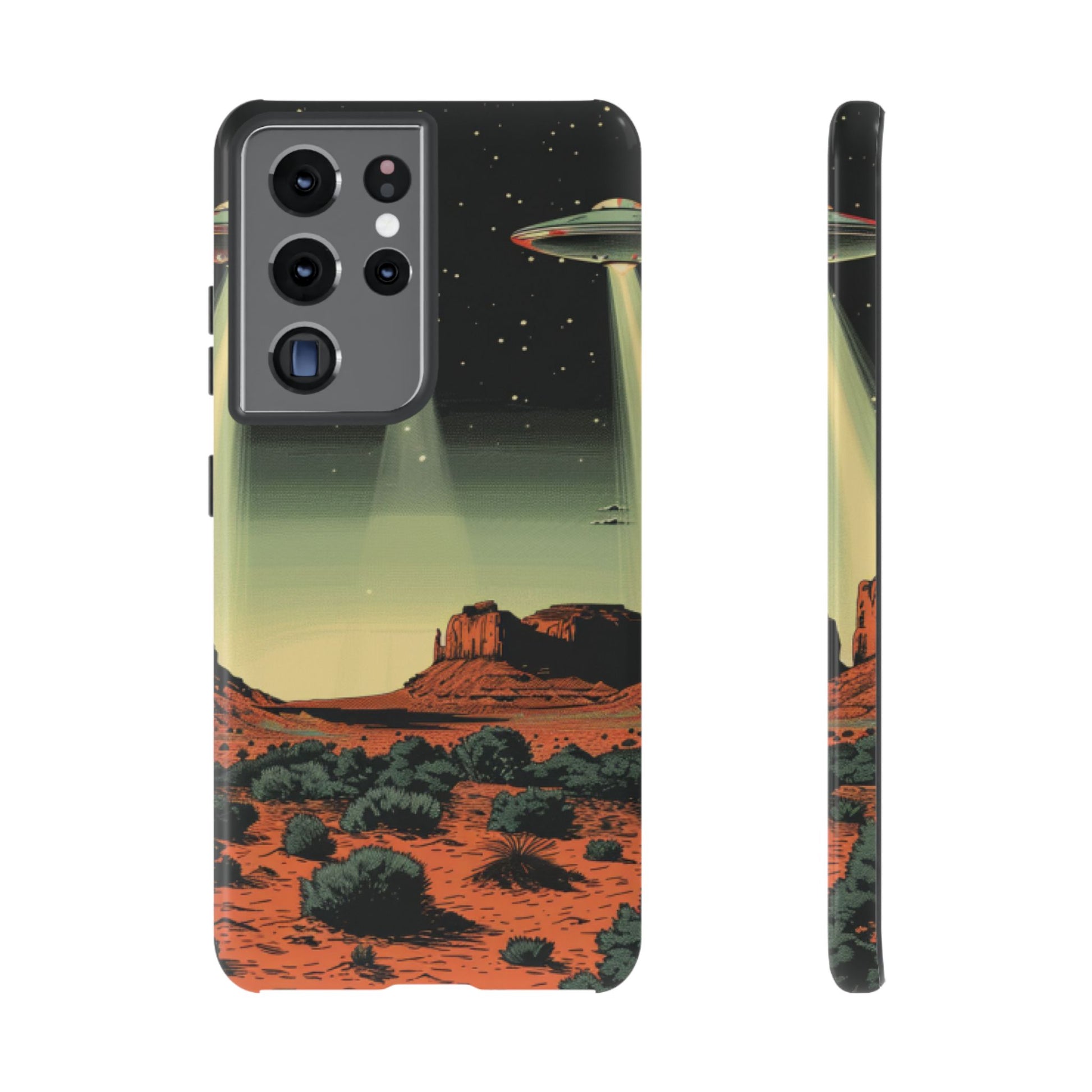 Night drives across red rock mesas, a hush of stars, and suddenly a silver disc sliding through the desert sky — this protective phone case carries that slow, cinematic thrill into everyday life. The double-layer shell hugs your phone while the TPU liner cushions every knock. The scene wraps fully around the case, keeping the vintage sci‑fi illustration crisp and weather-resistant. It’s for people who like their gear tough but mysterious: road‑trip storytellers, late-night stargazers, and collectors of retro space art. Use it on long drives, at outdoor meetups, or when you want a small, daily reminder of wide open places and strange lights on the horizon.