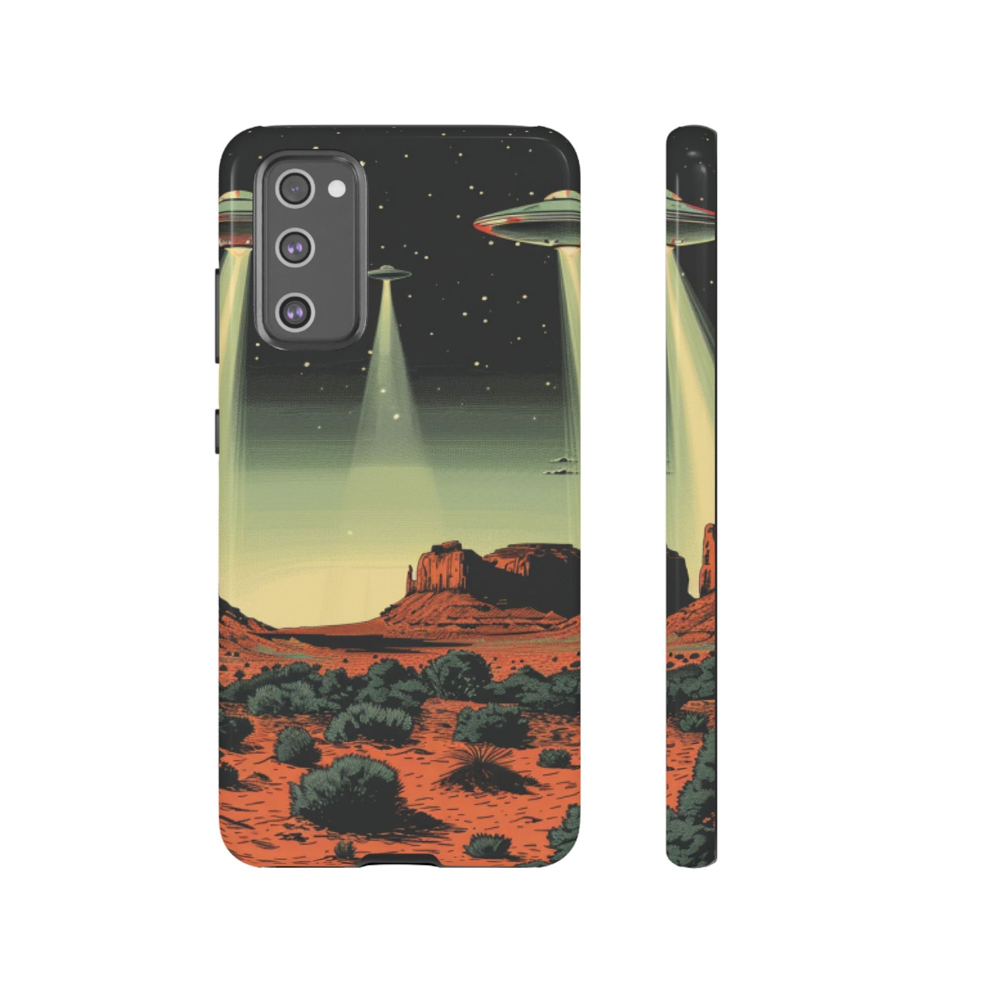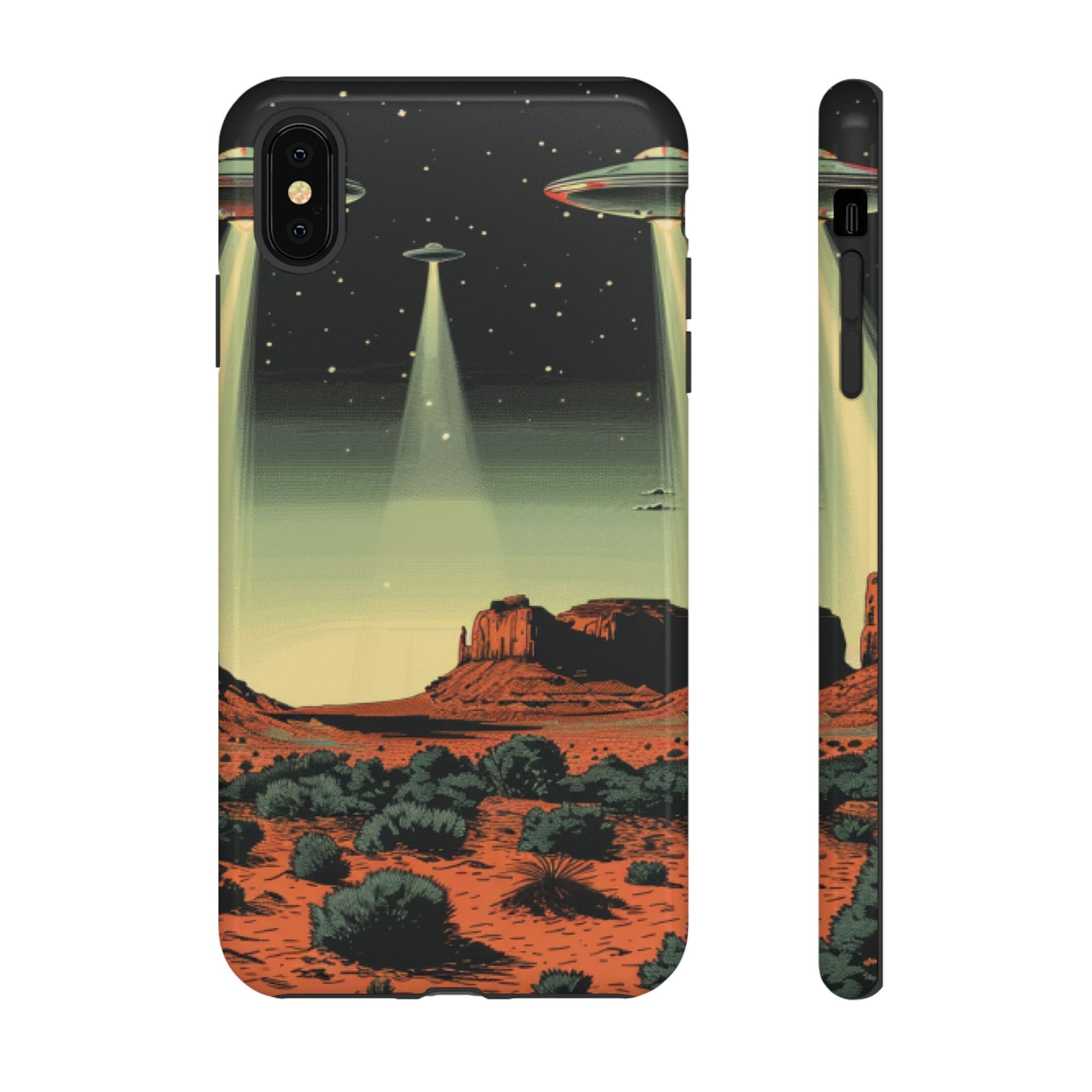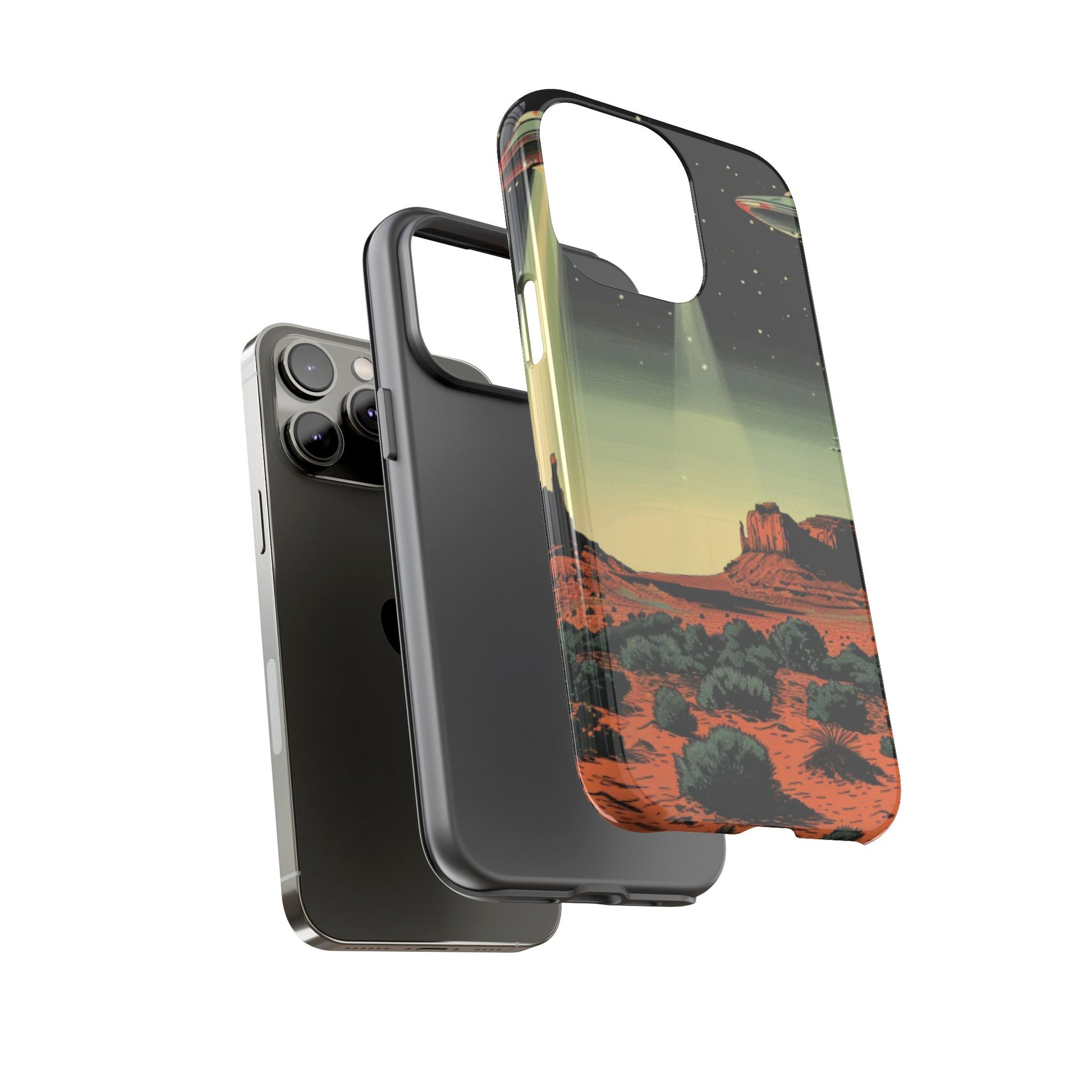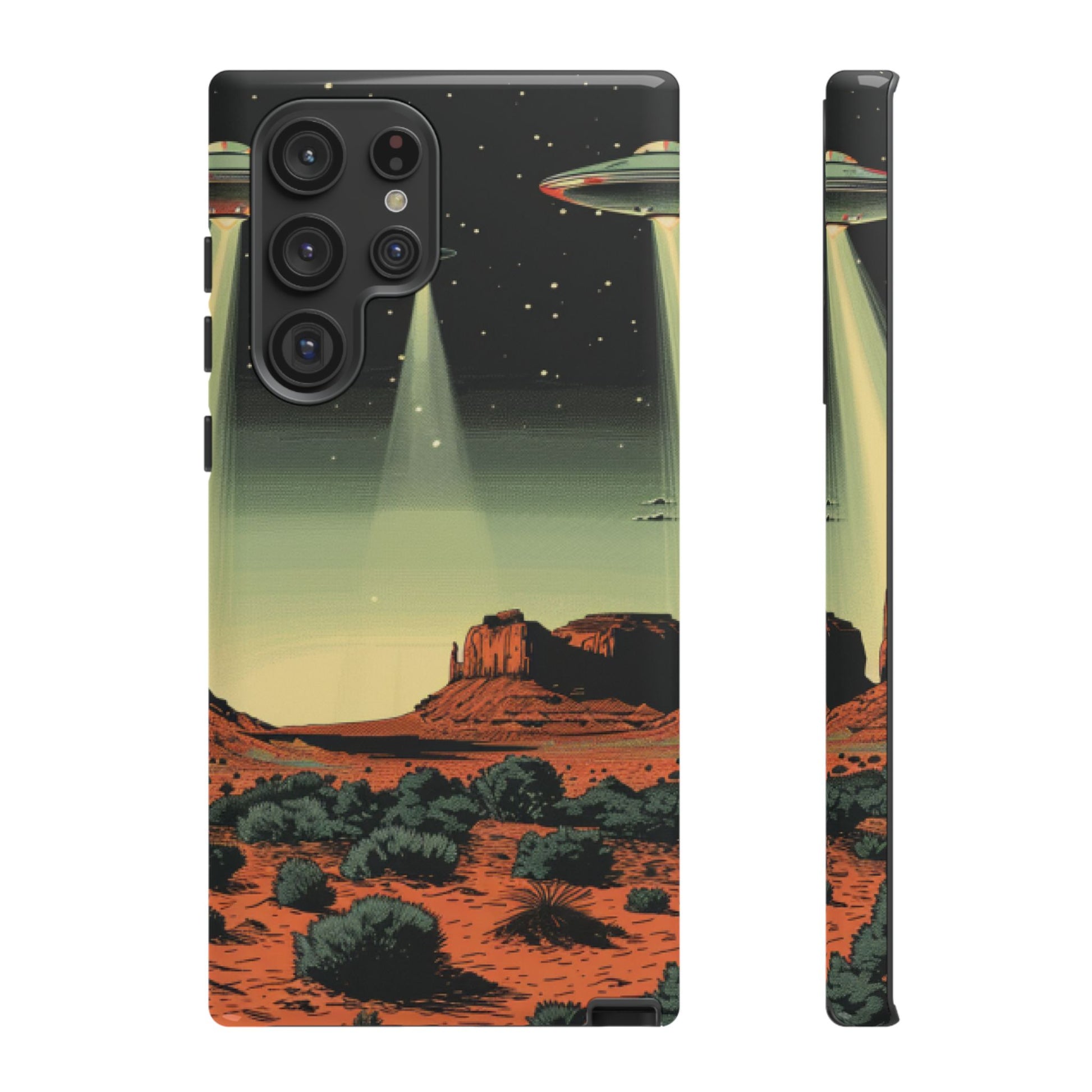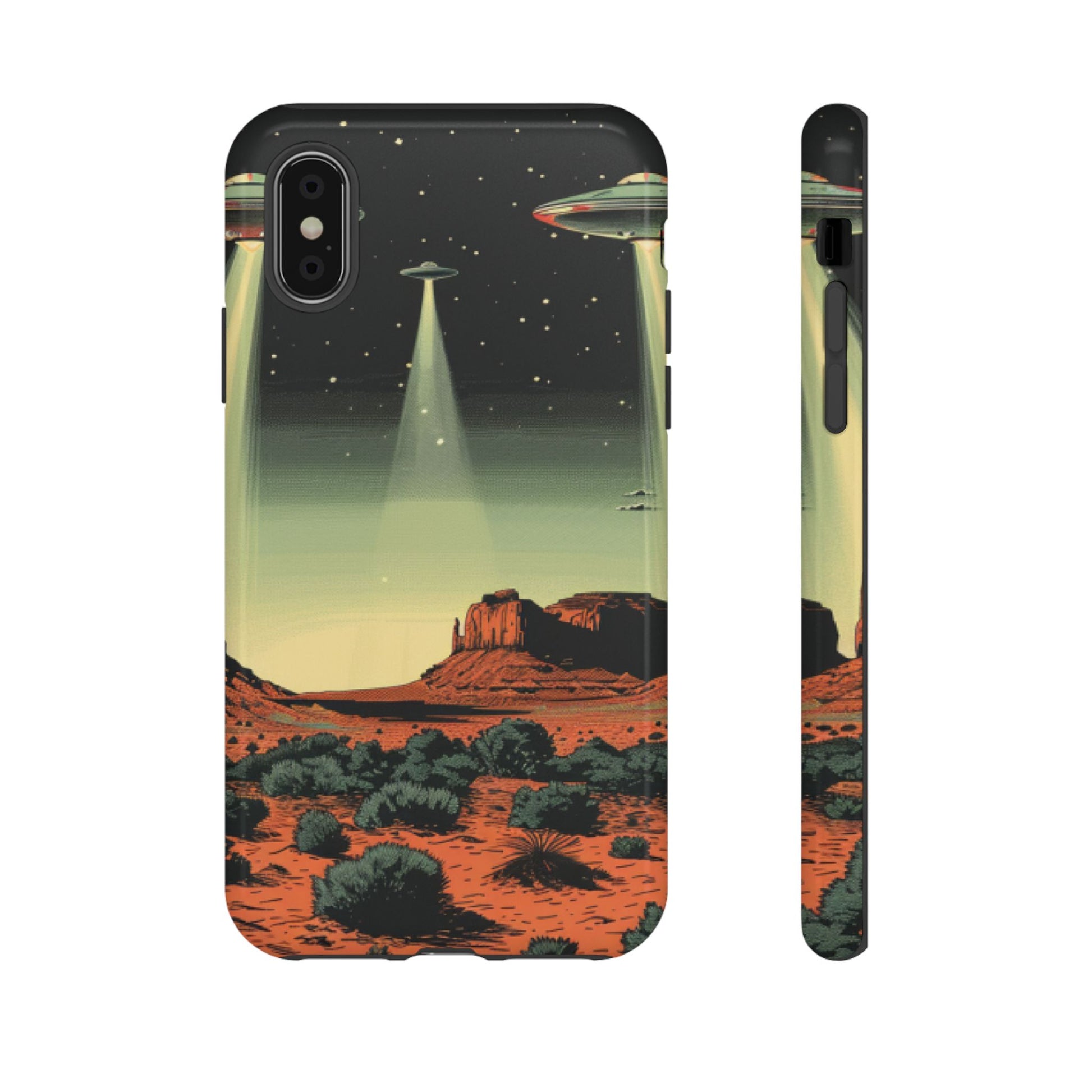 Night drives across red rock mesas, a hush of stars, and suddenly a silver disc sliding through the desert sky — this protective phone case carries that slow, cinematic thrill into everyday life. The double-layer shell hugs your phone while the TPU liner cushions every knock. The scene wraps fully around the case, keeping the vintage sci‑fi illustration crisp and weather-resistant. It’s for people who like their gear tough but mysterious: road‑trip storytellers, late-night stargazers, and collectors of retro space art. Use it on long drives, at outdoor meetups, or when you want a small, daily reminder of wide open places and strange lights on the horizon.