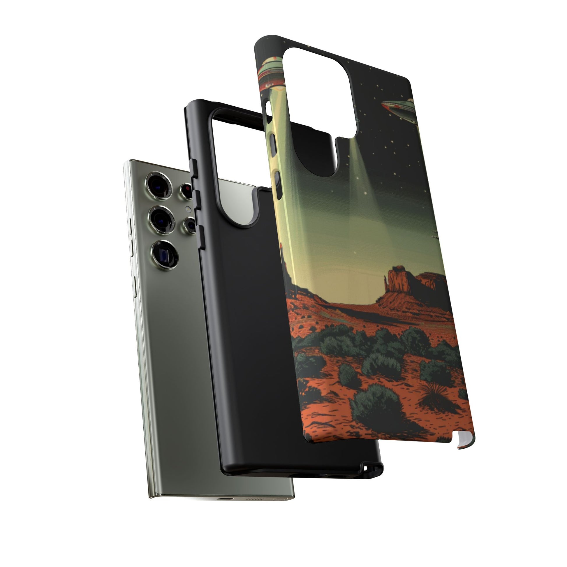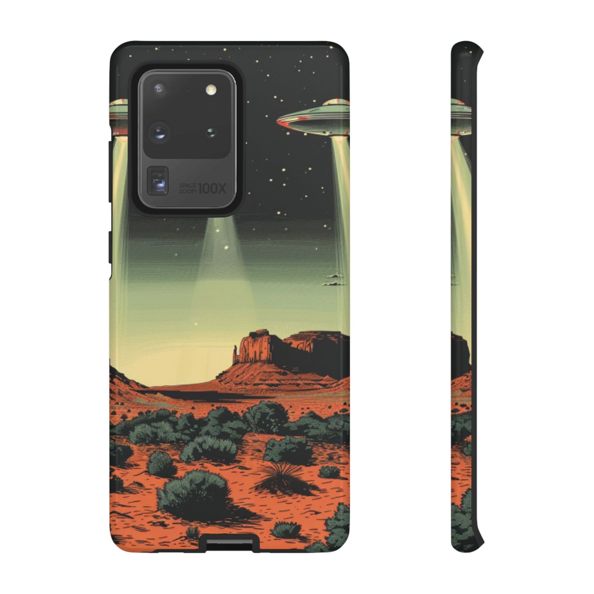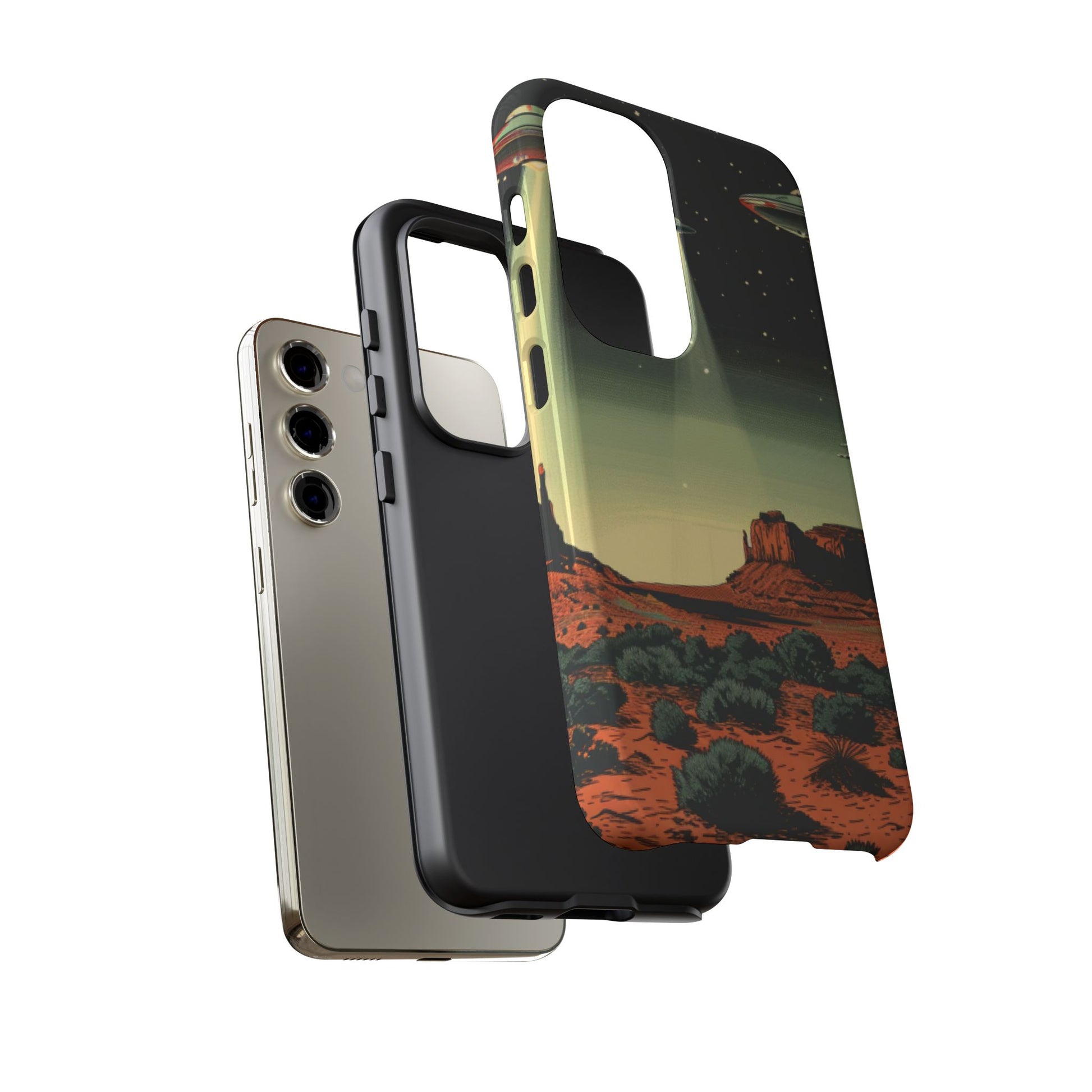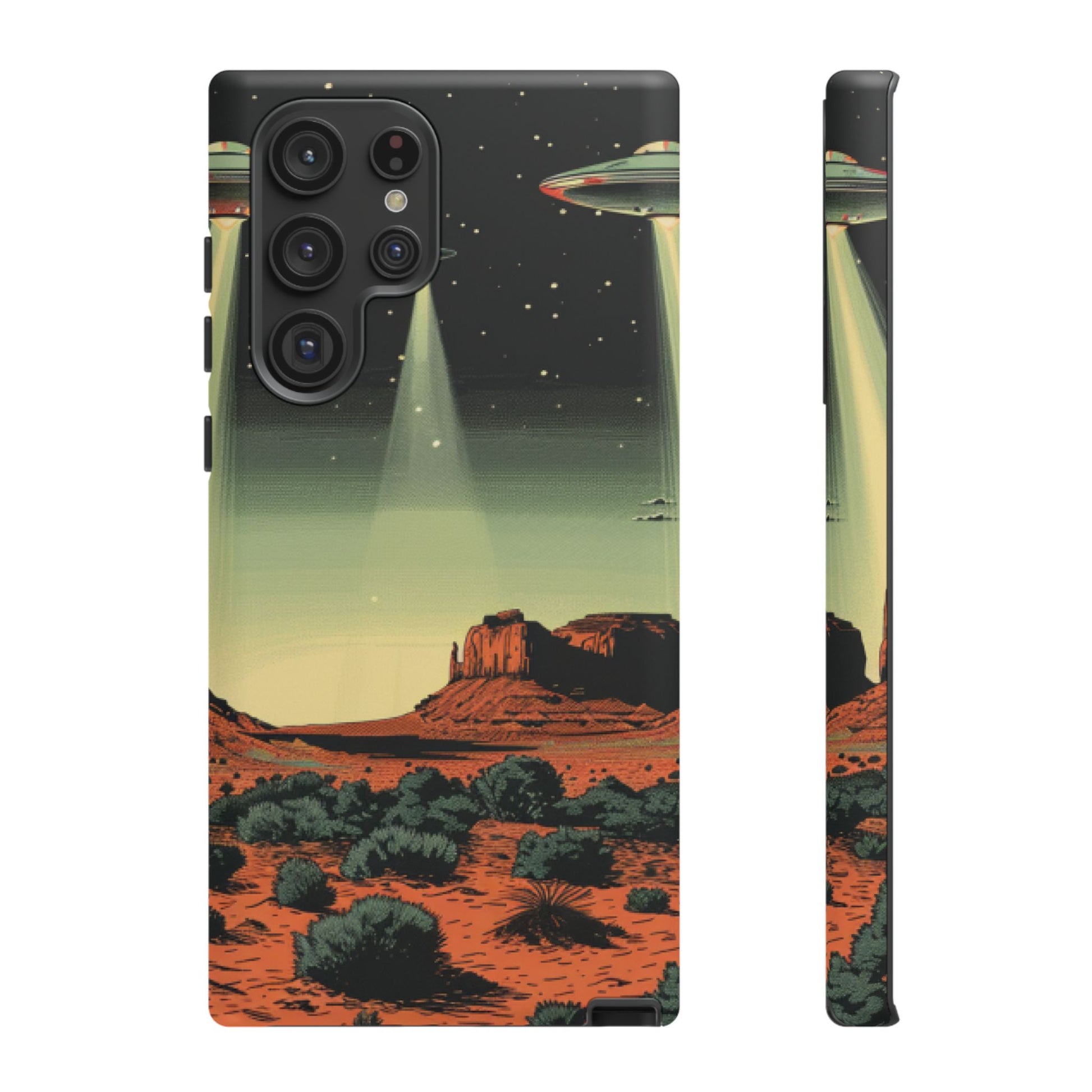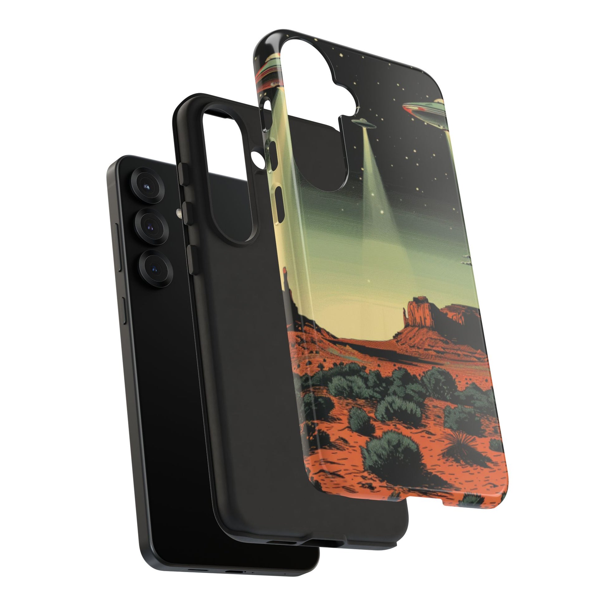 Night drives across red rock mesas, a hush of stars, and suddenly a silver disc sliding through the desert sky — this protective phone case carries that slow, cinematic thrill into everyday life. The double-layer shell hugs your phone while the TPU liner cushions every knock. The scene wraps fully around the case, keeping the vintage sci‑fi illustration crisp and weather-resistant. It’s for people who like their gear tough but mysterious: road‑trip storytellers, late-night stargazers, and collectors of retro space art. Use it on long drives, at outdoor meetups, or when you want a small, daily reminder of wide open places and strange lights on the horizon.