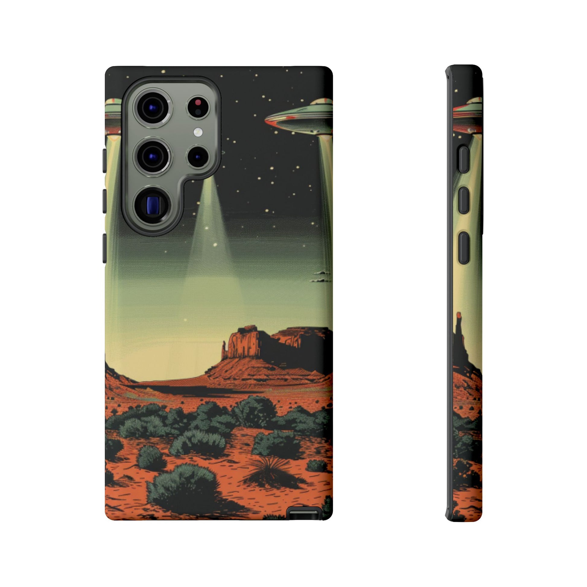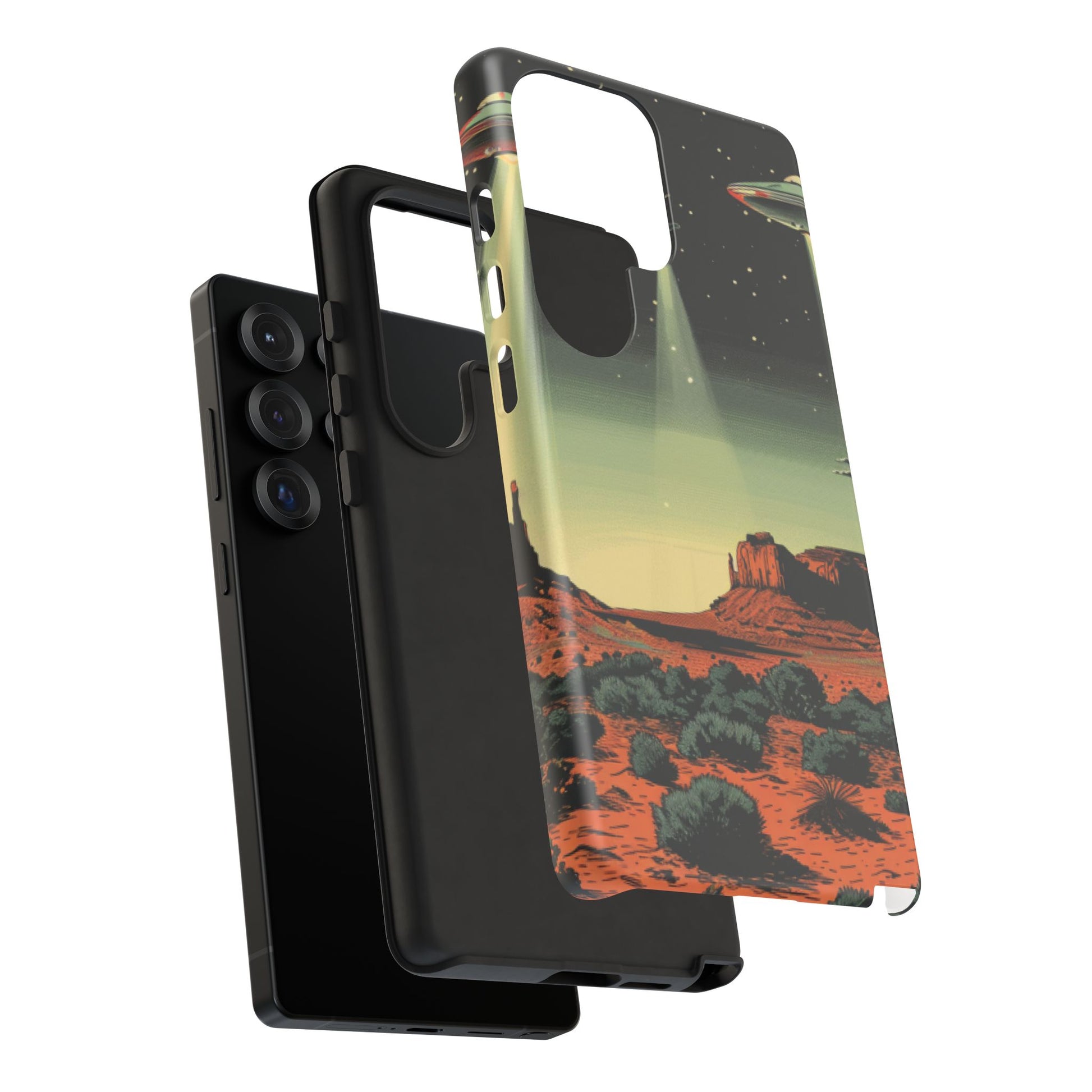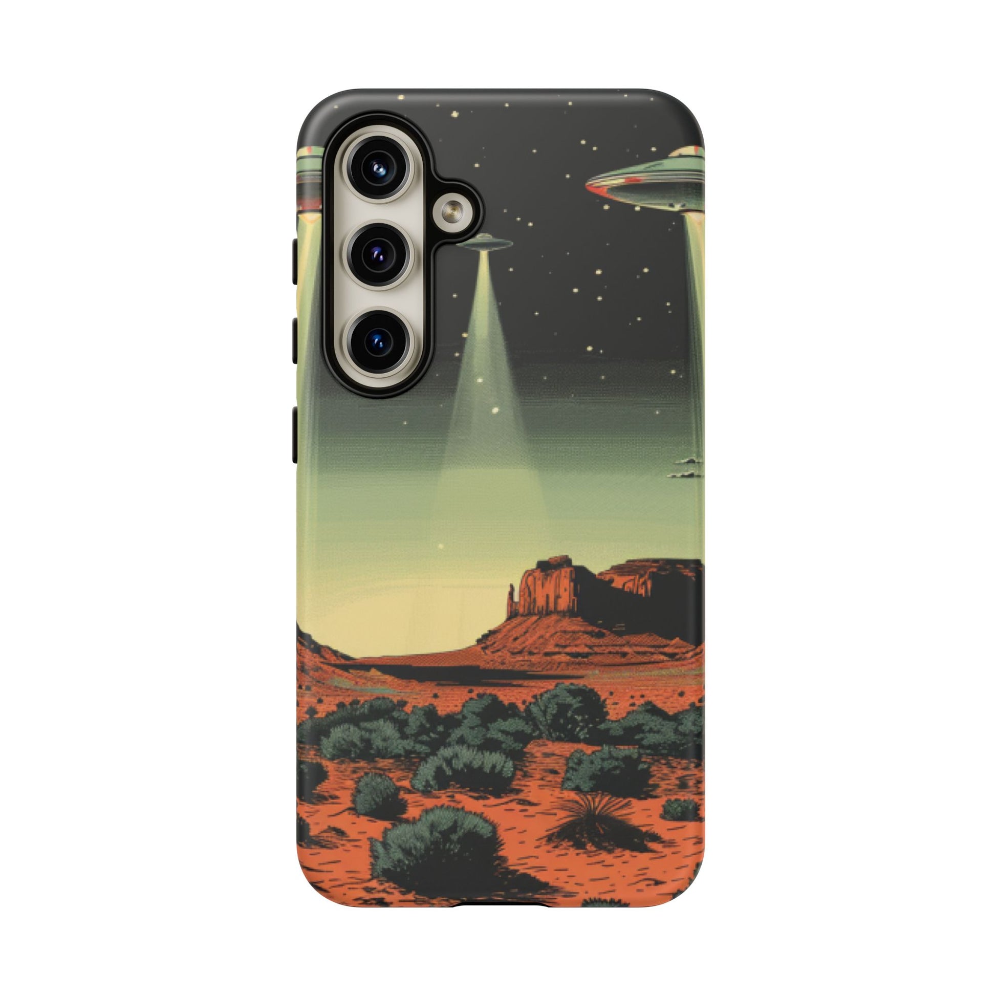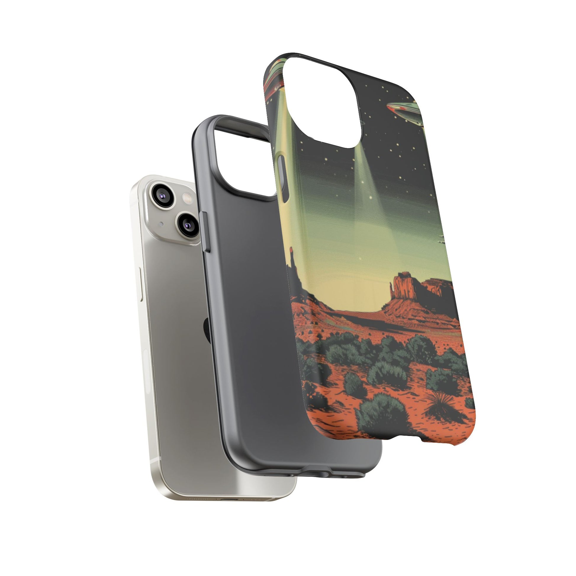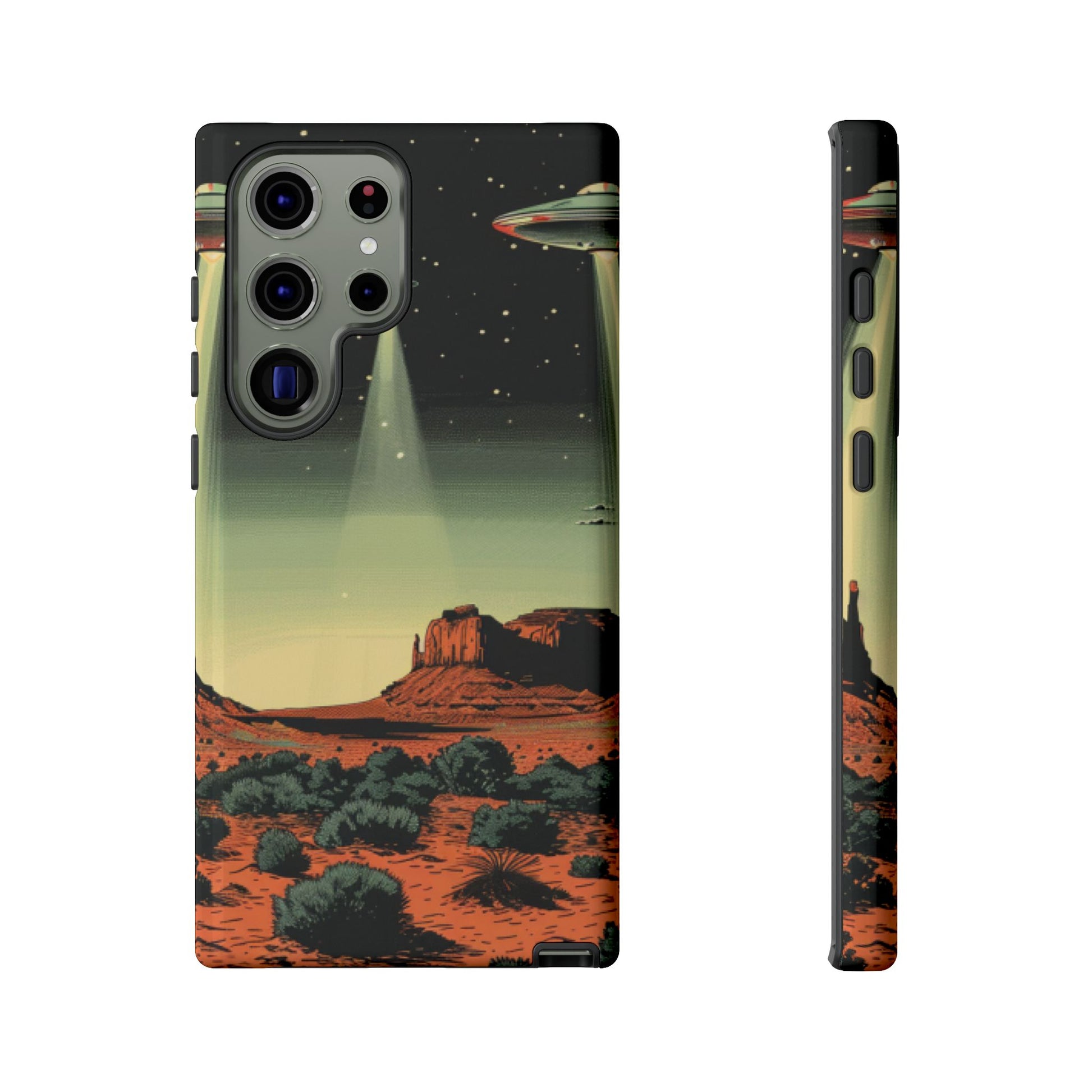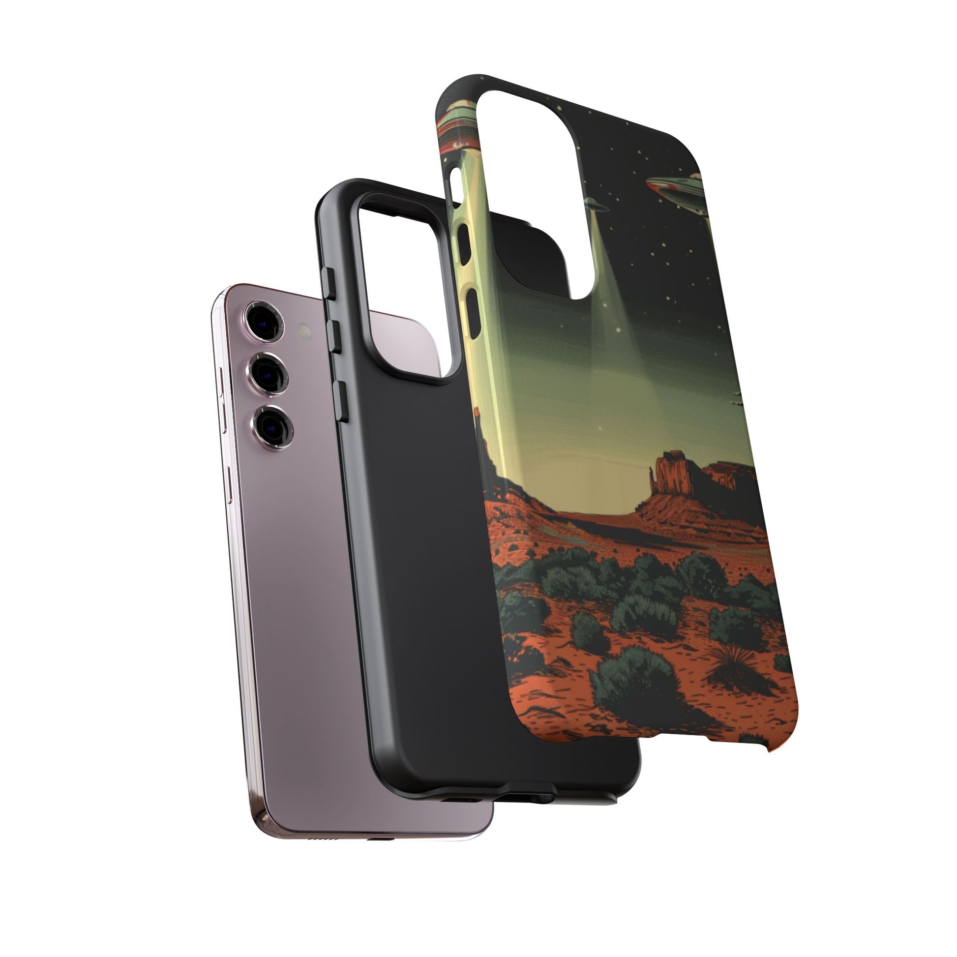 Night drives across red rock mesas, a hush of stars, and suddenly a silver disc sliding through the desert sky — this protective phone case carries that slow, cinematic thrill into everyday life. The double-layer shell hugs your phone while the TPU liner cushions every knock. The scene wraps fully around the case, keeping the vintage sci‑fi illustration crisp and weather-resistant. It’s for people who like their gear tough but mysterious: road‑trip storytellers, late-night stargazers, and collectors of retro space art. Use it on long drives, at outdoor meetups, or when you want a small, daily reminder of wide open places and strange lights on the horizon.