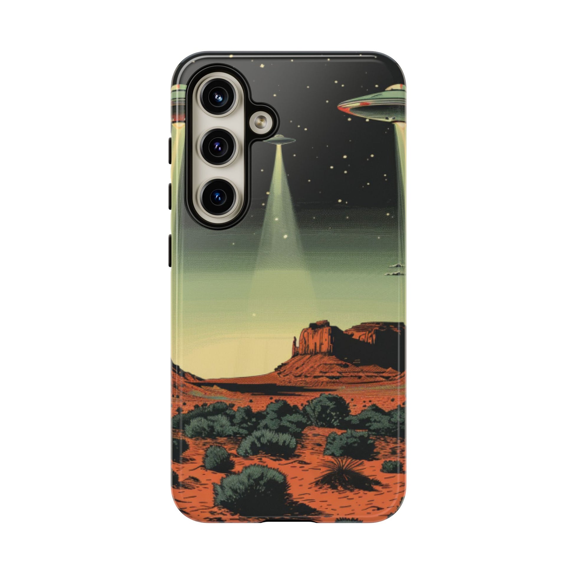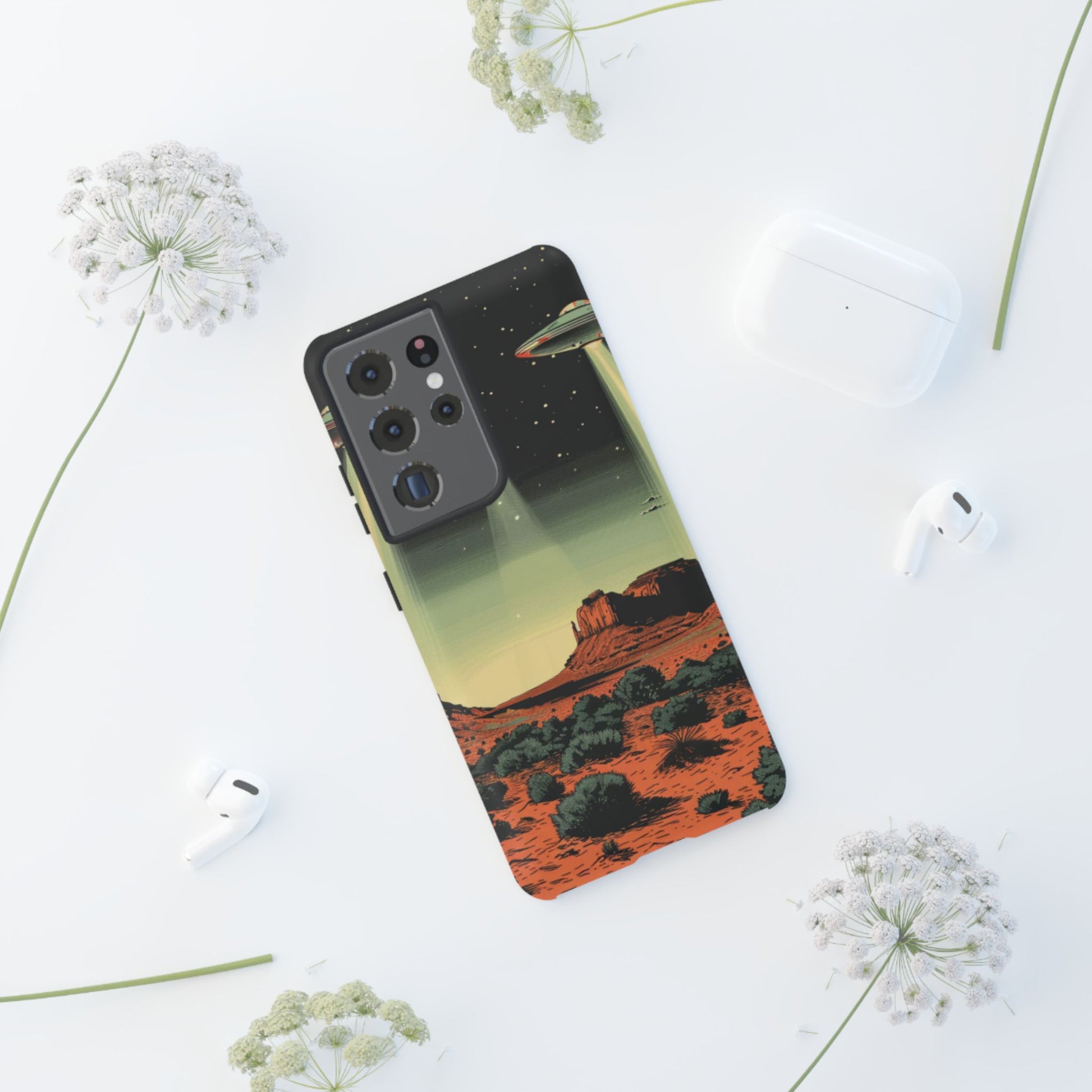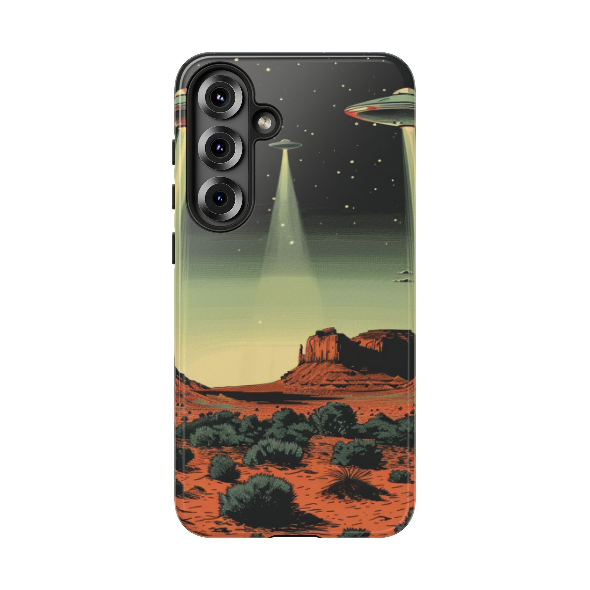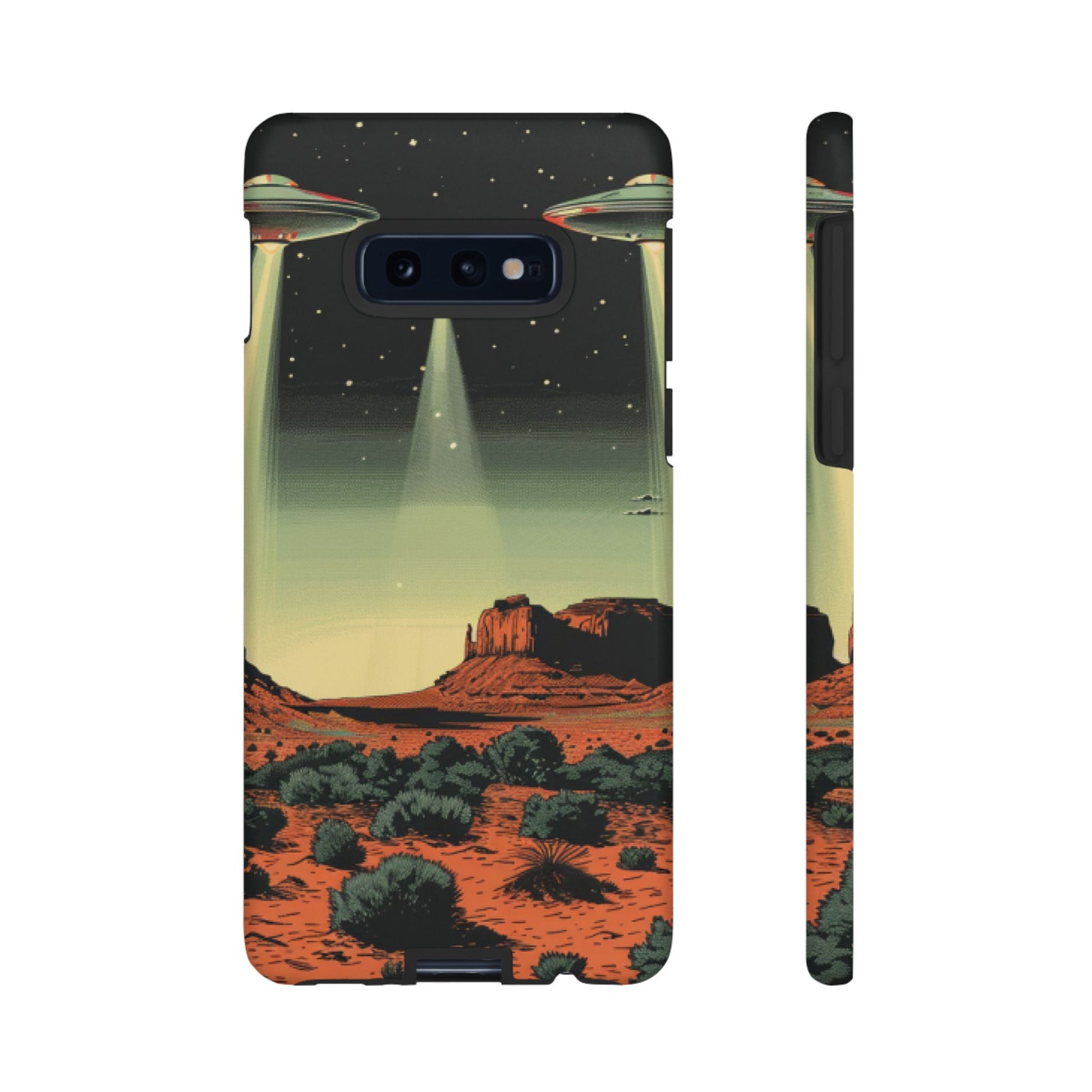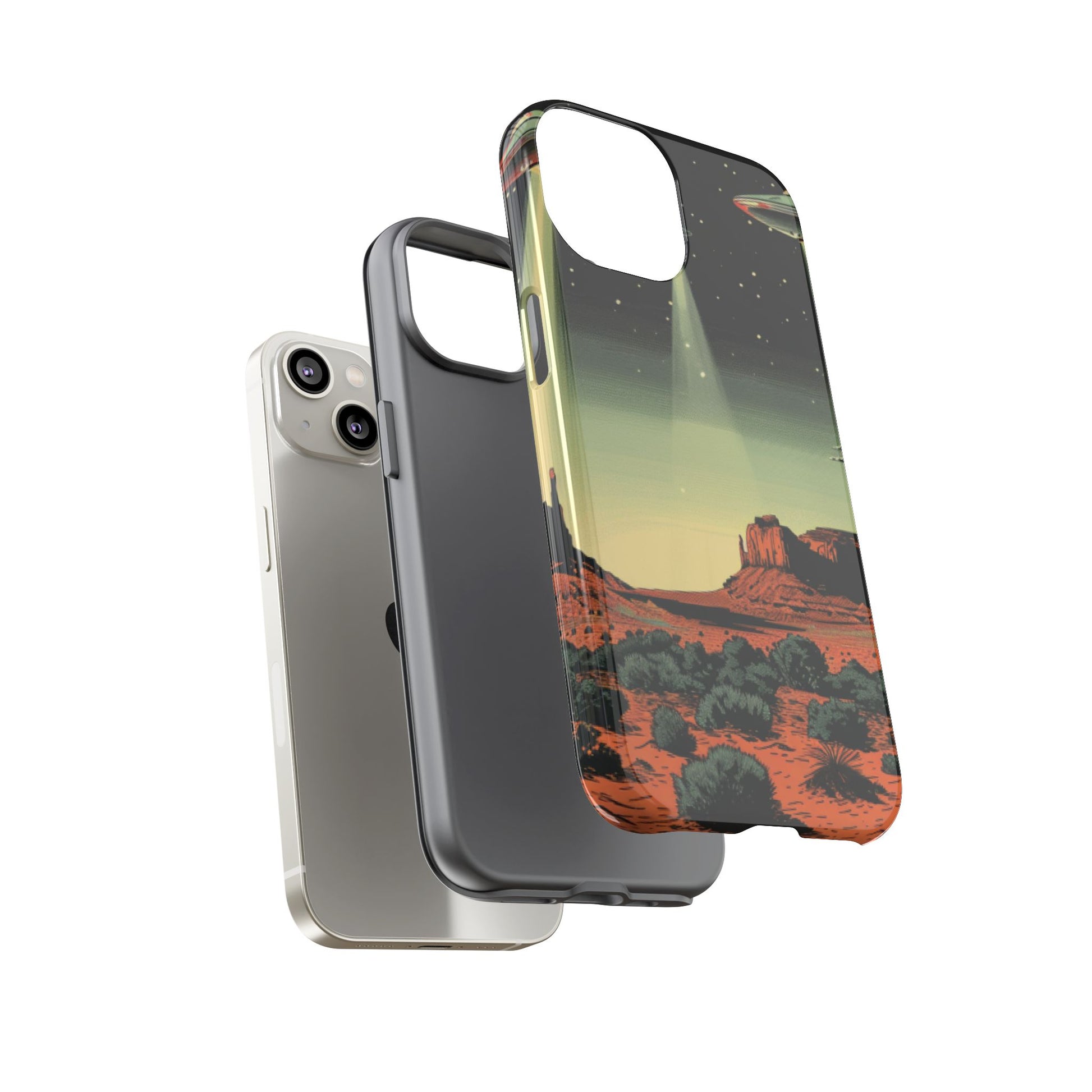 Night drives across red rock mesas, a hush of stars, and suddenly a silver disc sliding through the desert sky — this protective phone case carries that slow, cinematic thrill into everyday life. The double-layer shell hugs your phone while the TPU liner cushions every knock. The scene wraps fully around the case, keeping the vintage sci‑fi illustration crisp and weather-resistant. It’s for people who like their gear tough but mysterious: road‑trip storytellers, late-night stargazers, and collectors of retro space art. Use it on long drives, at outdoor meetups, or when you want a small, daily reminder of wide open places and strange lights on the horizon.