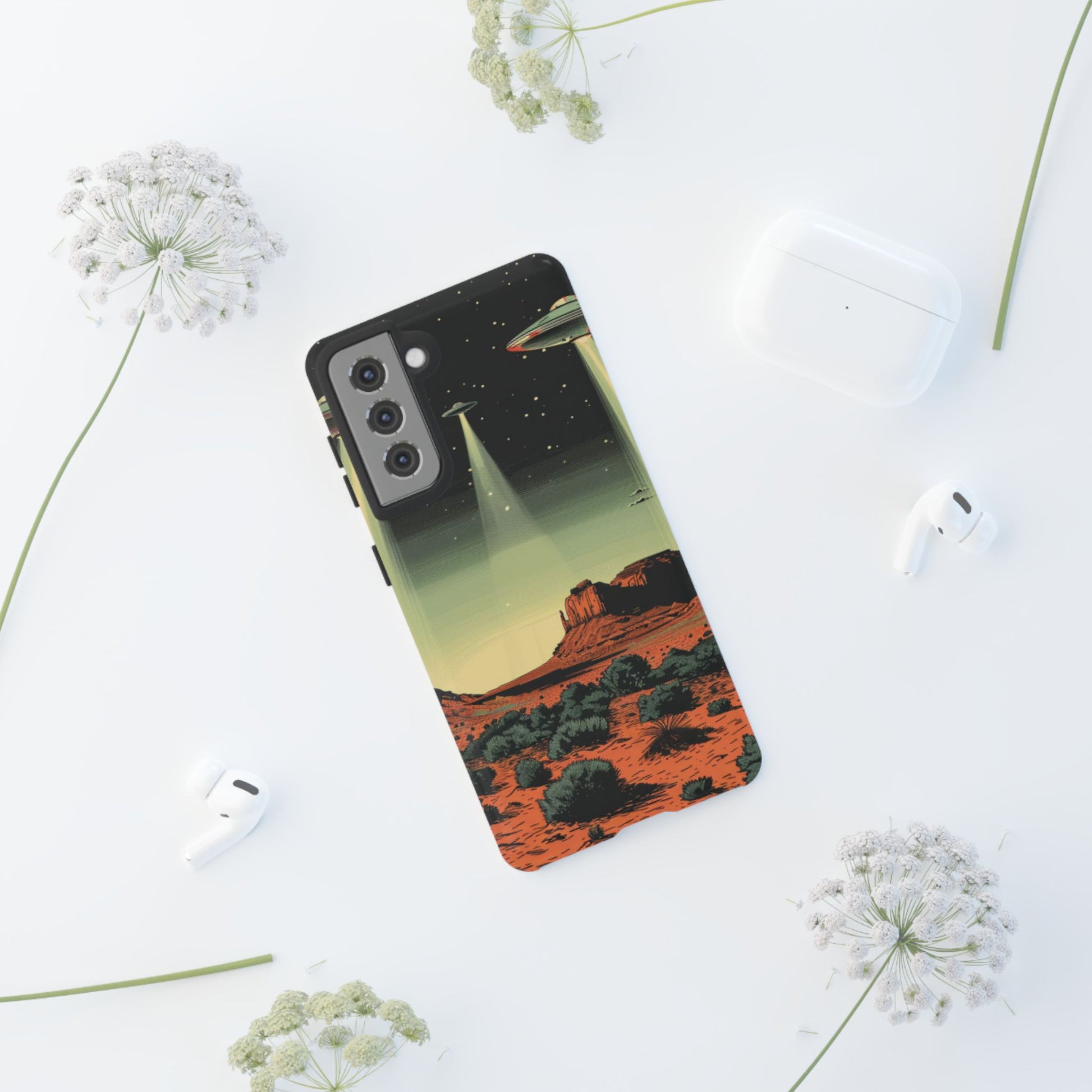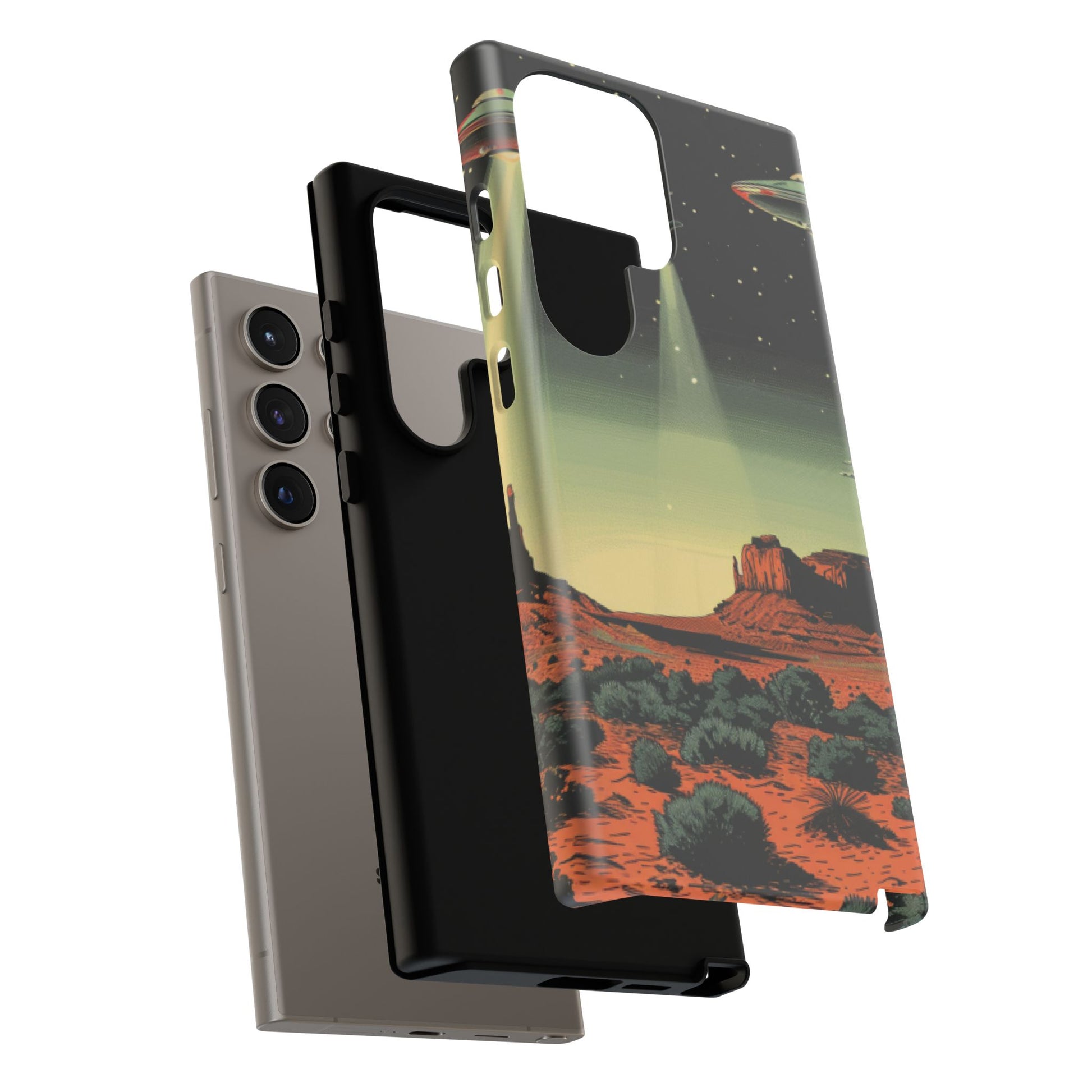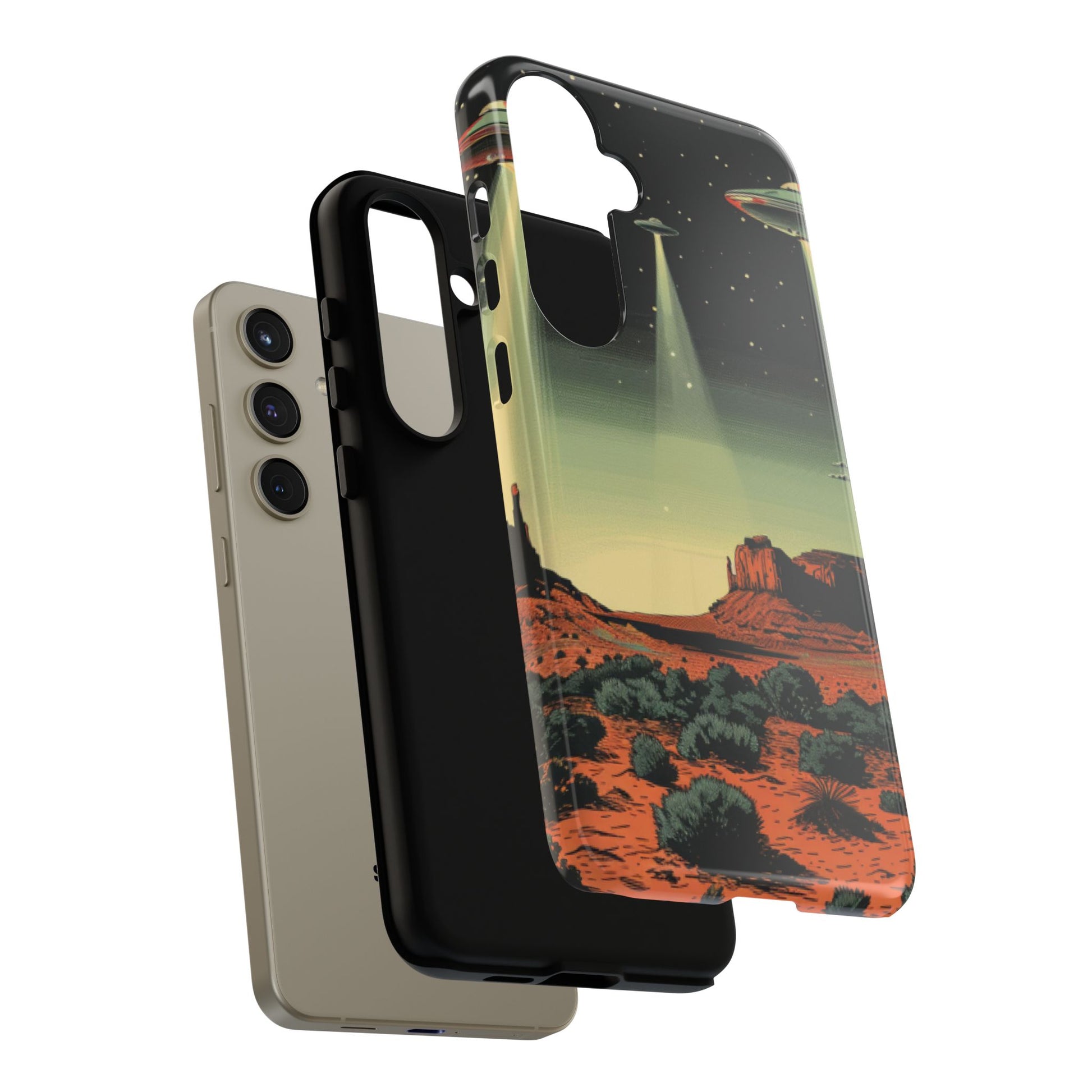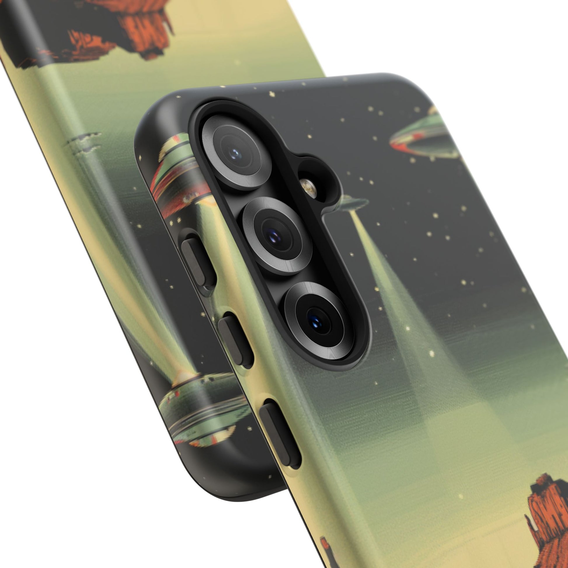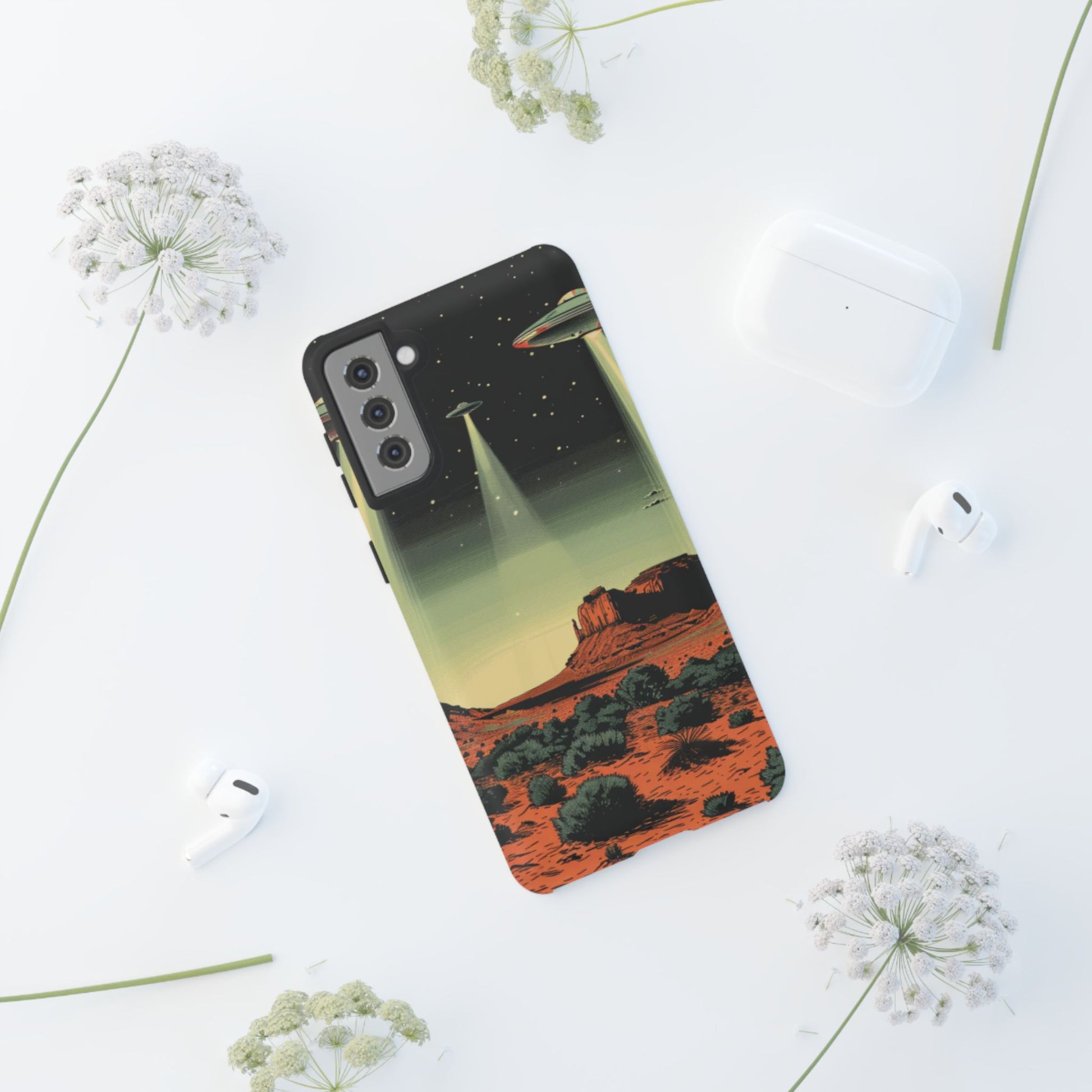 Night drives across red rock mesas, a hush of stars, and suddenly a silver disc sliding through the desert sky — this protective phone case carries that slow, cinematic thrill into everyday life. The double-layer shell hugs your phone while the TPU liner cushions every knock. The scene wraps fully around the case, keeping the vintage sci‑fi illustration crisp and weather-resistant. It’s for people who like their gear tough but mysterious: road‑trip storytellers, late-night stargazers, and collectors of retro space art. Use it on long drives, at outdoor meetups, or when you want a small, daily reminder of wide open places and strange lights on the horizon.