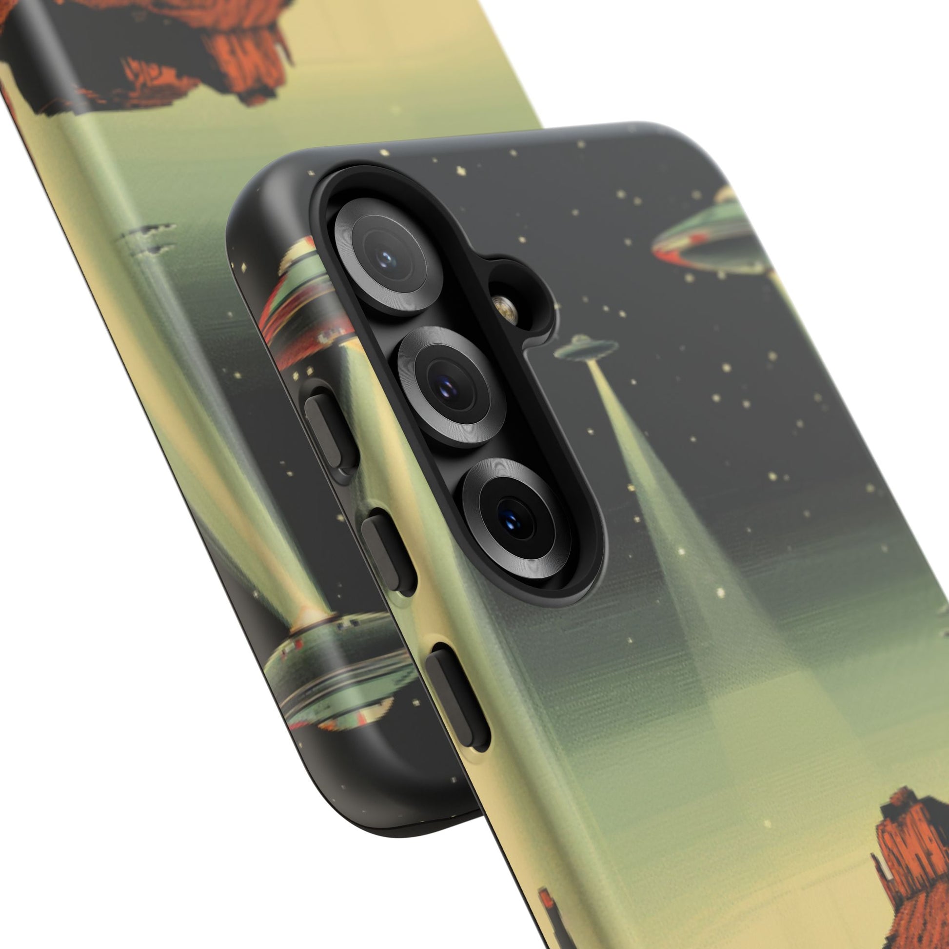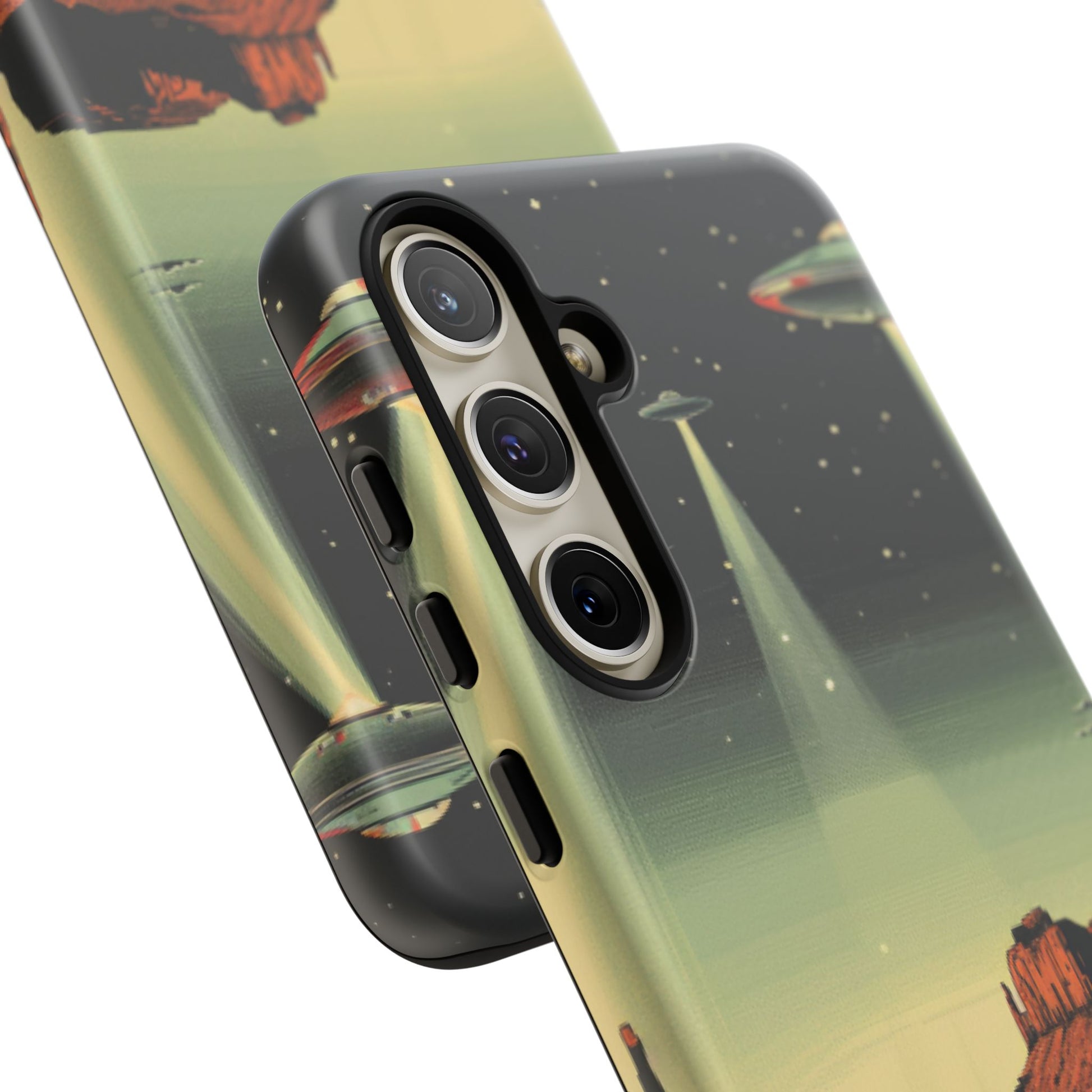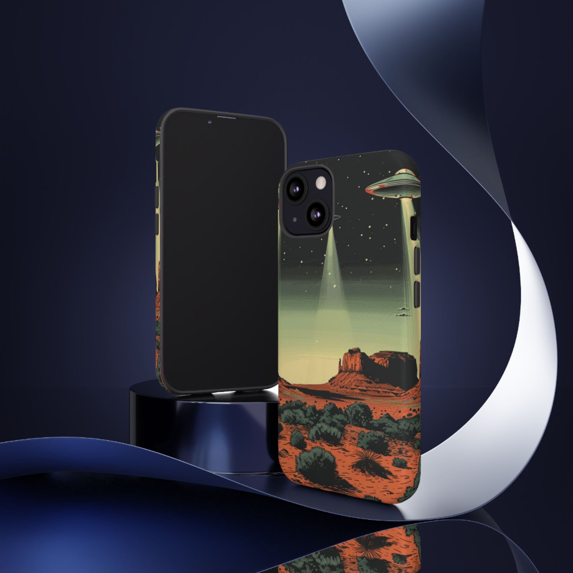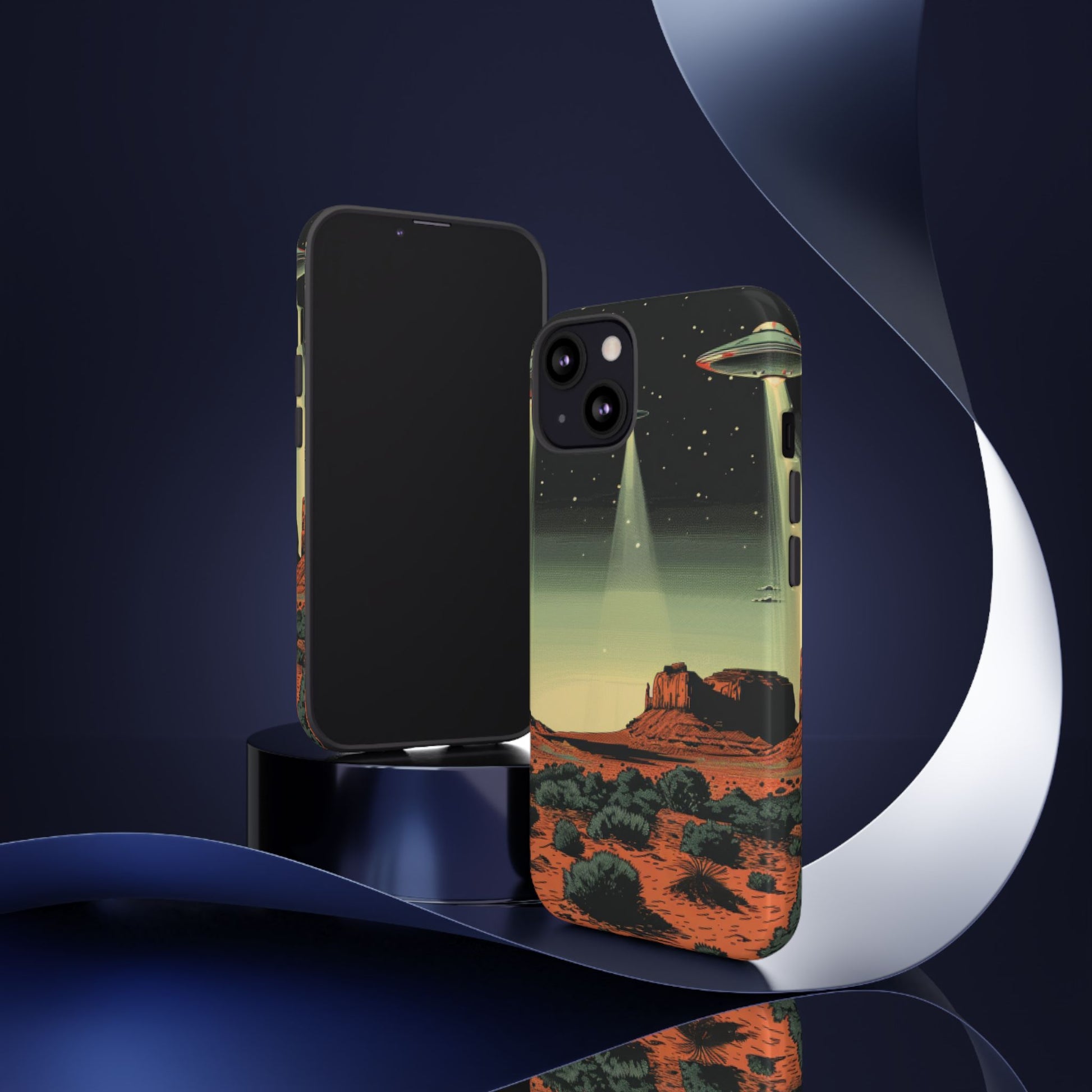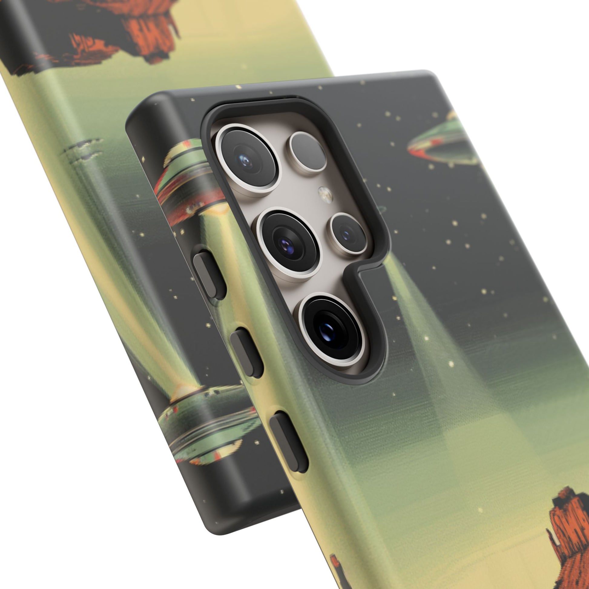 Night drives across red rock mesas, a hush of stars, and suddenly a silver disc sliding through the desert sky — this protective phone case carries that slow, cinematic thrill into everyday life. The double-layer shell hugs your phone while the TPU liner cushions every knock. The scene wraps fully around the case, keeping the vintage sci‑fi illustration crisp and weather-resistant. It’s for people who like their gear tough but mysterious: road‑trip storytellers, late-night stargazers, and collectors of retro space art. Use it on long drives, at outdoor meetups, or when you want a small, daily reminder of wide open places and strange lights on the horizon.