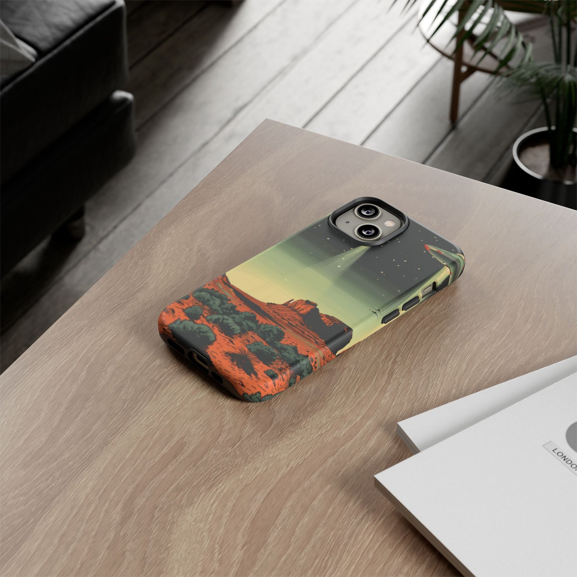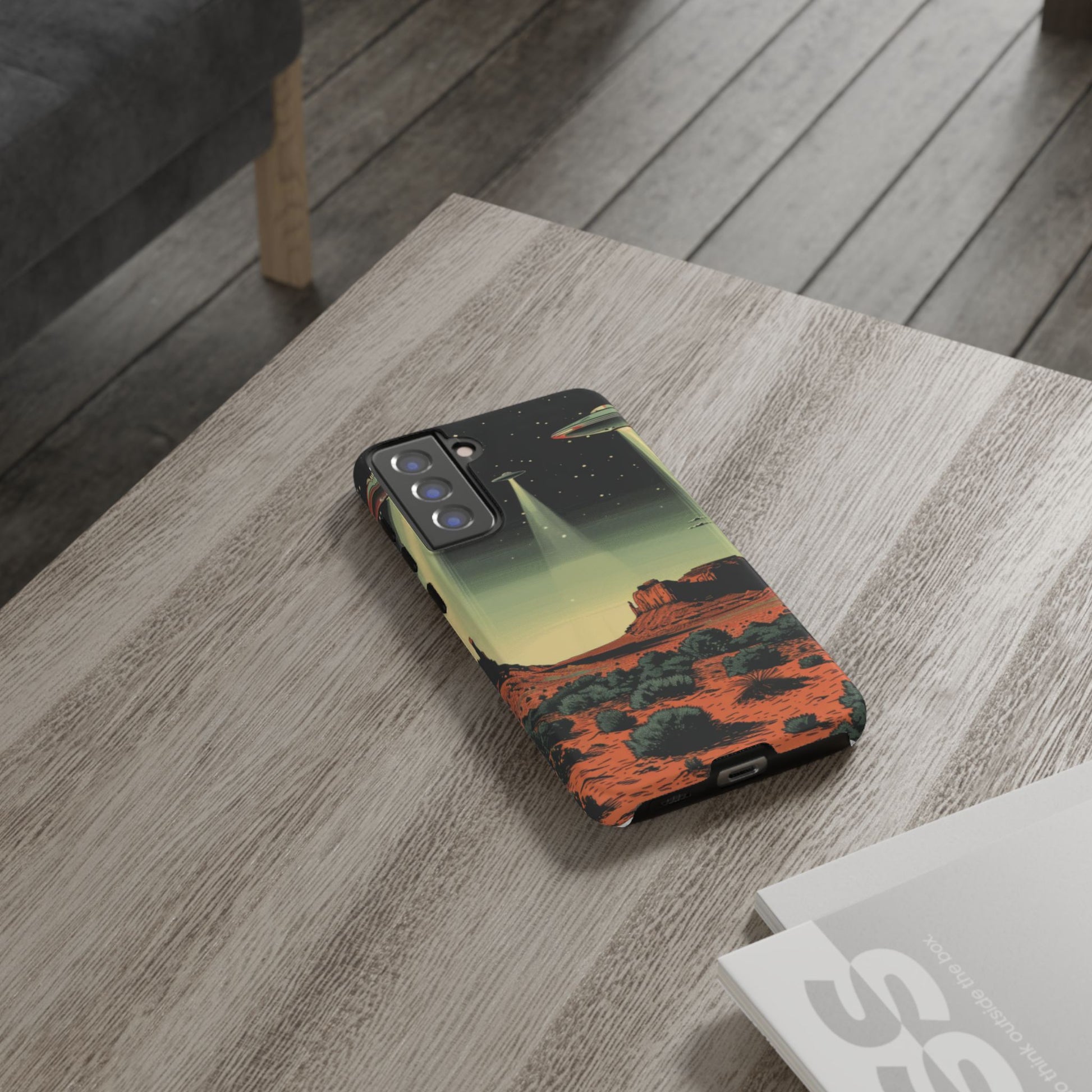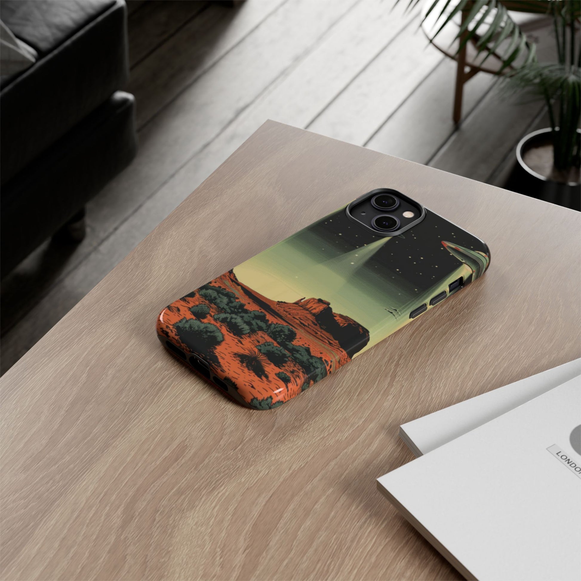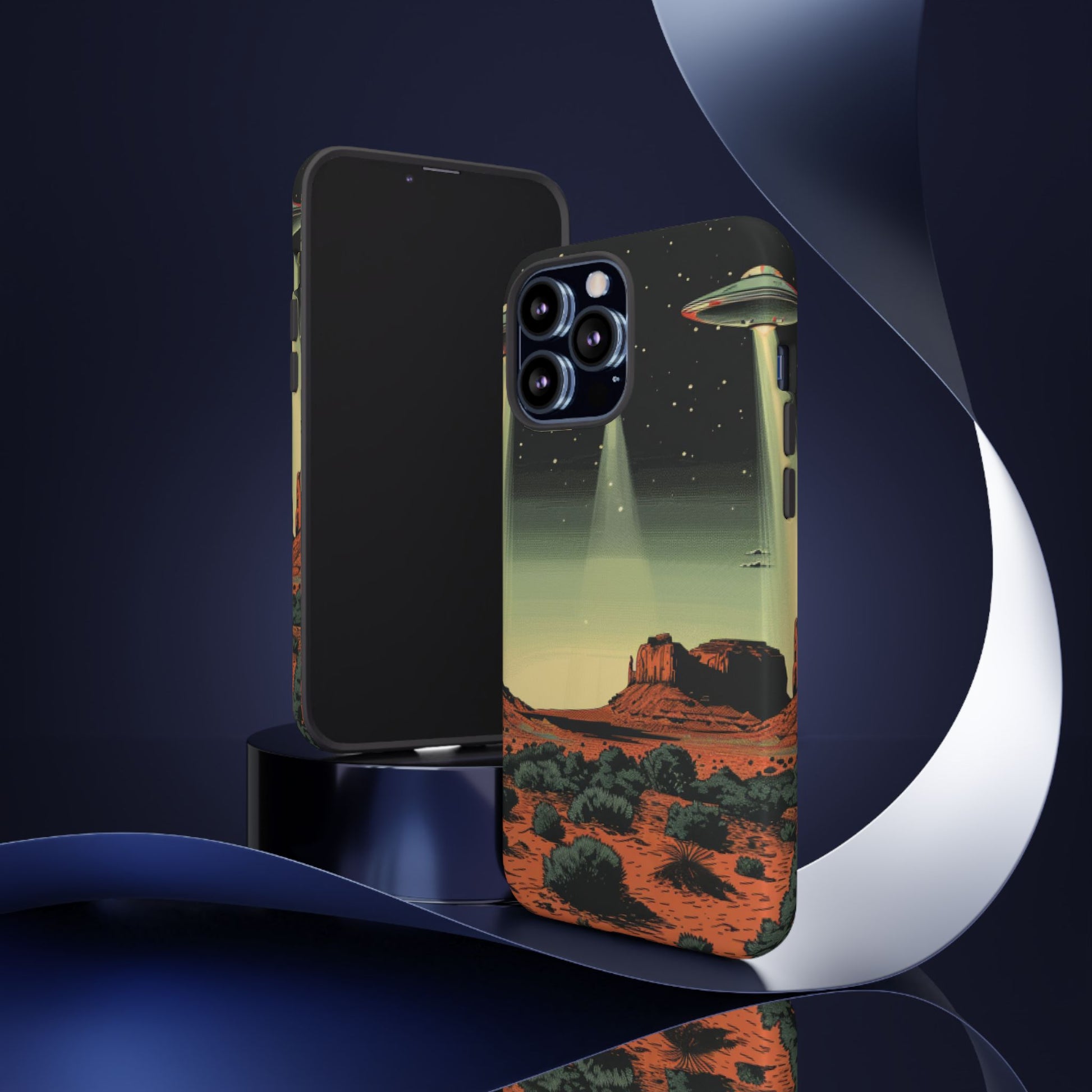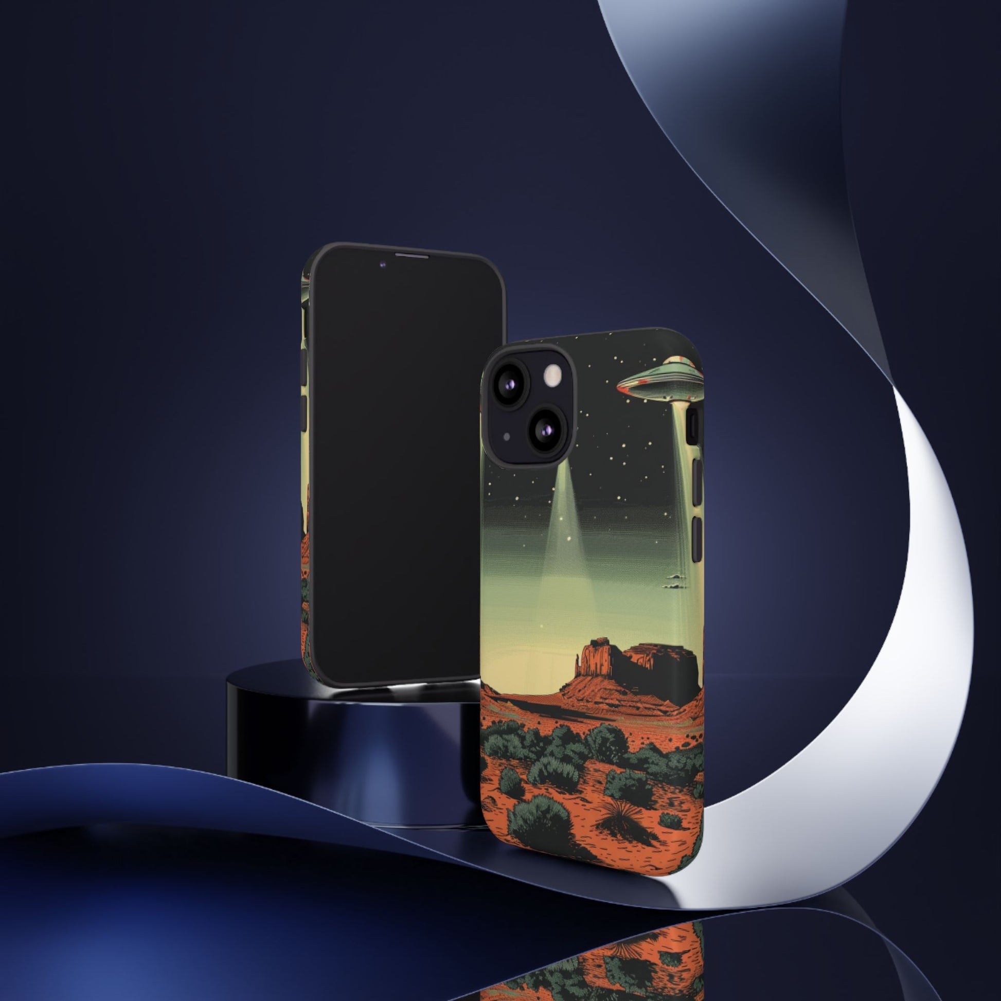 Night drives across red rock mesas, a hush of stars, and suddenly a silver disc sliding through the desert sky — this protective phone case carries that slow, cinematic thrill into everyday life. The double-layer shell hugs your phone while the TPU liner cushions every knock. The scene wraps fully around the case, keeping the vintage sci‑fi illustration crisp and weather-resistant. It’s for people who like their gear tough but mysterious: road‑trip storytellers, late-night stargazers, and collectors of retro space art. Use it on long drives, at outdoor meetups, or when you want a small, daily reminder of wide open places and strange lights on the horizon.