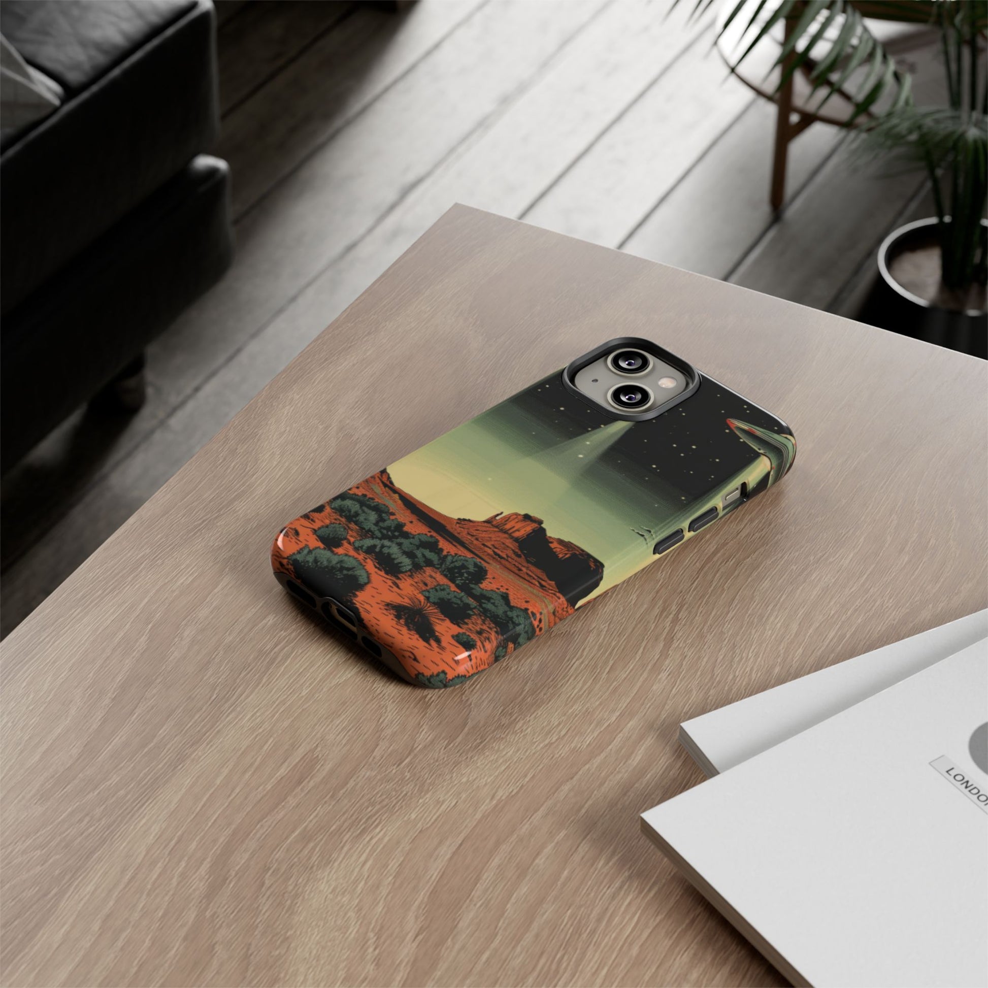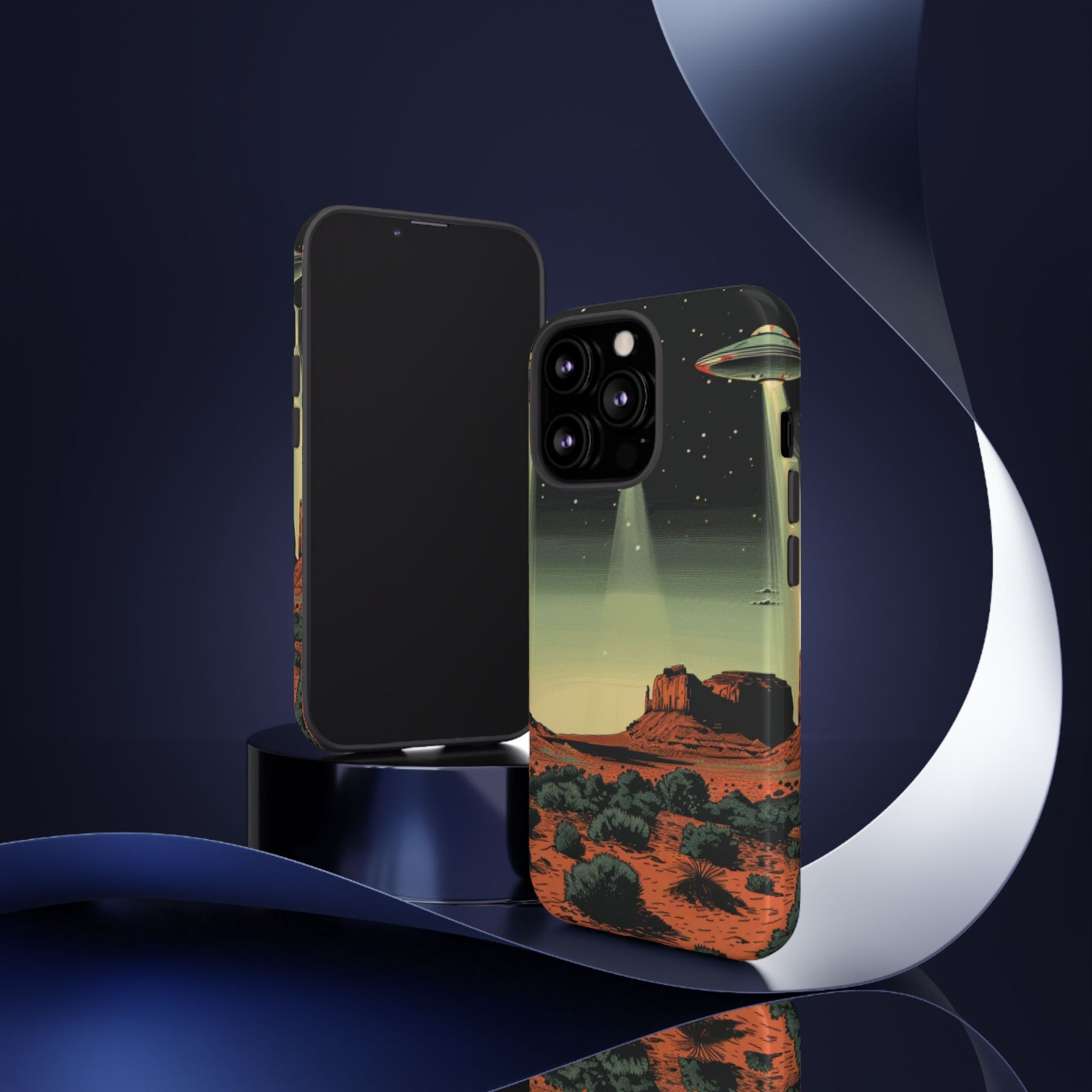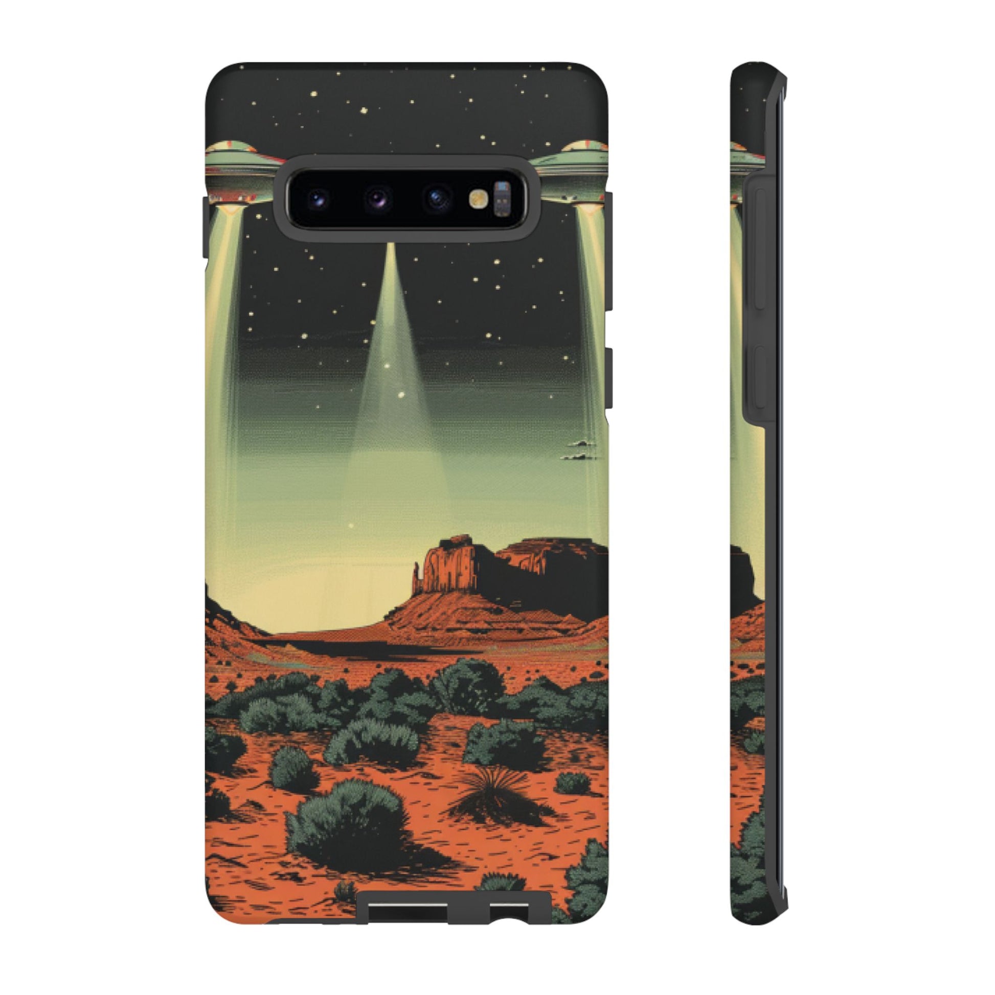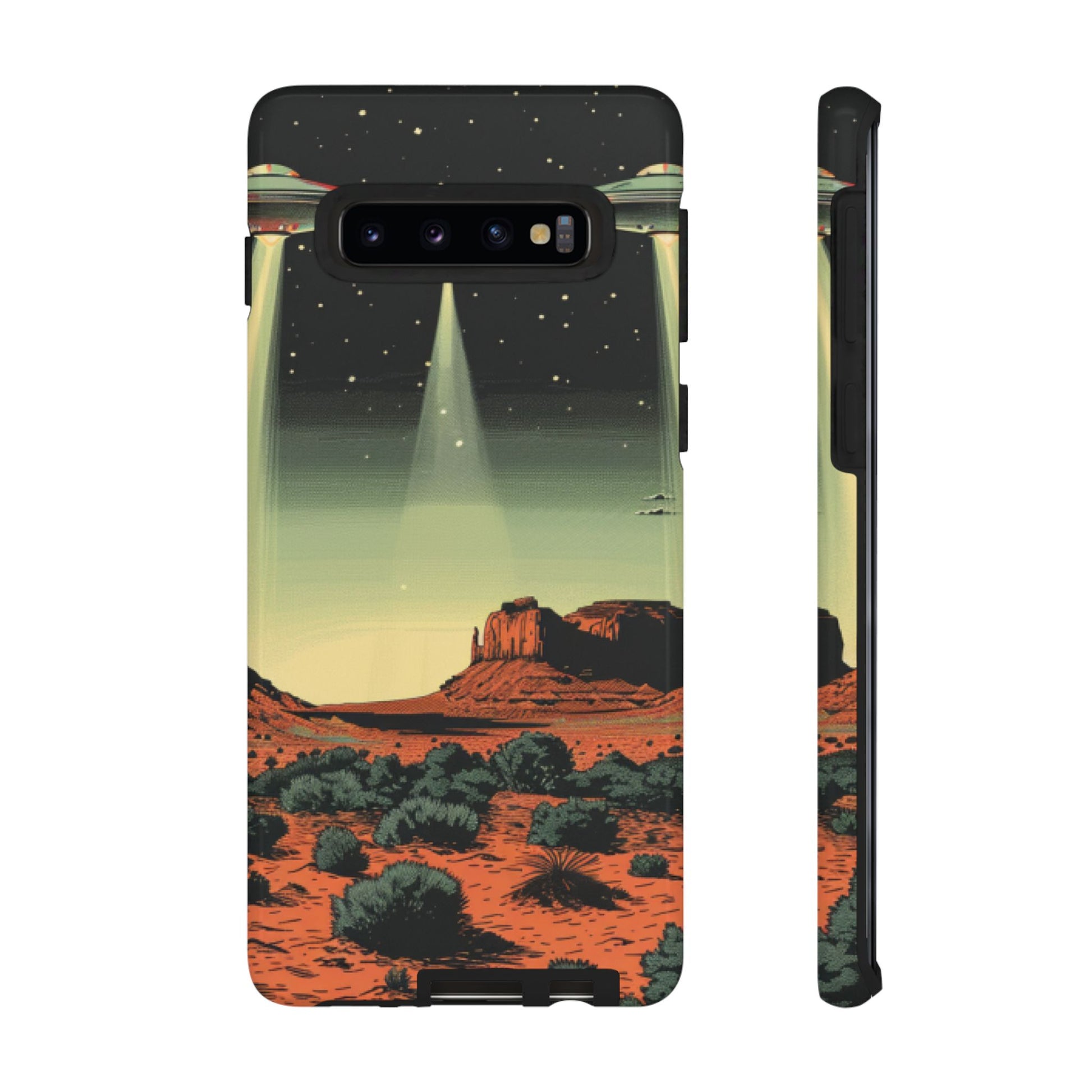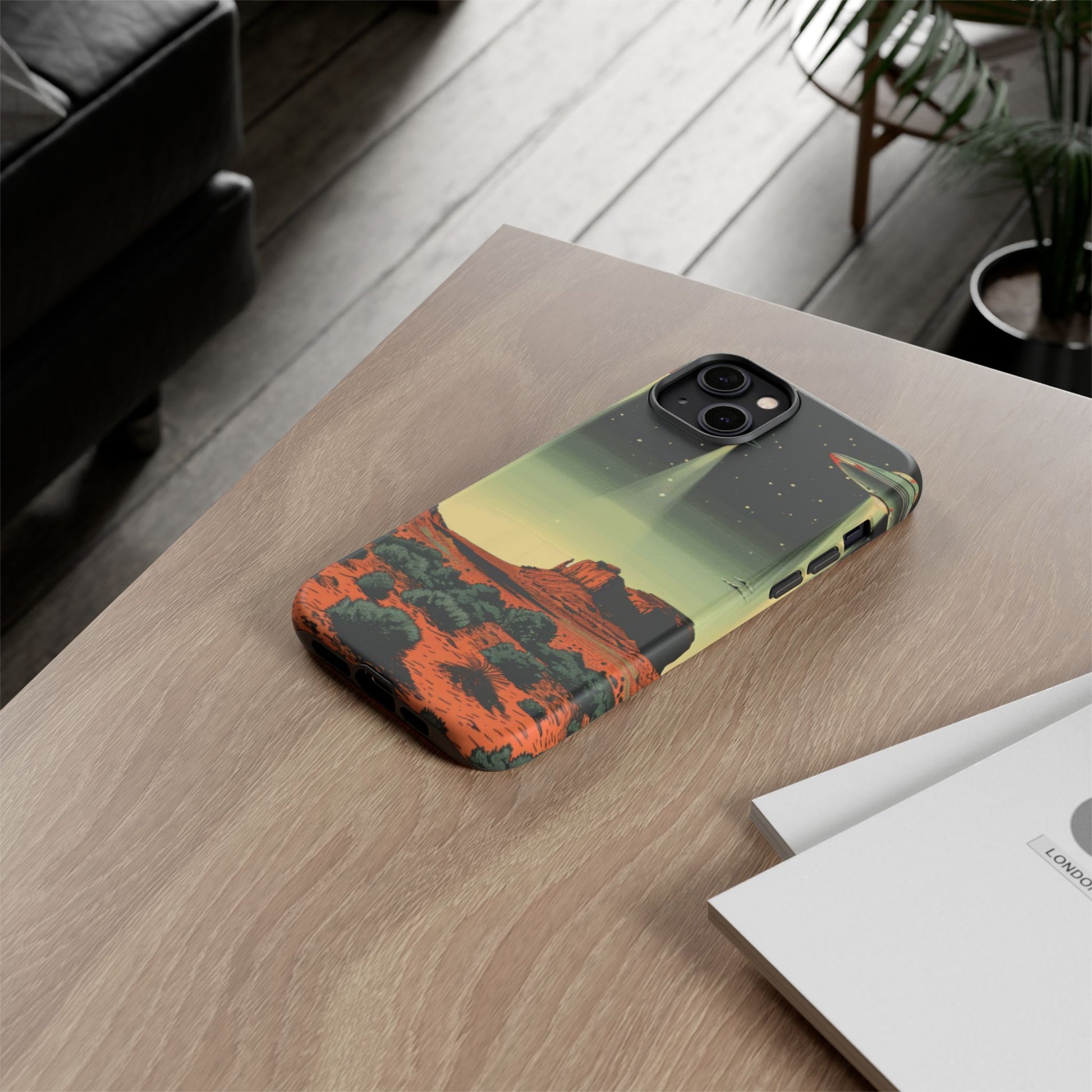 Night drives across red rock mesas, a hush of stars, and suddenly a silver disc sliding through the desert sky — this protective phone case carries that slow, cinematic thrill into everyday life. The double-layer shell hugs your phone while the TPU liner cushions every knock. The scene wraps fully around the case, keeping the vintage sci‑fi illustration crisp and weather-resistant. It’s for people who like their gear tough but mysterious: road‑trip storytellers, late-night stargazers, and collectors of retro space art. Use it on long drives, at outdoor meetups, or when you want a small, daily reminder of wide open places and strange lights on the horizon.