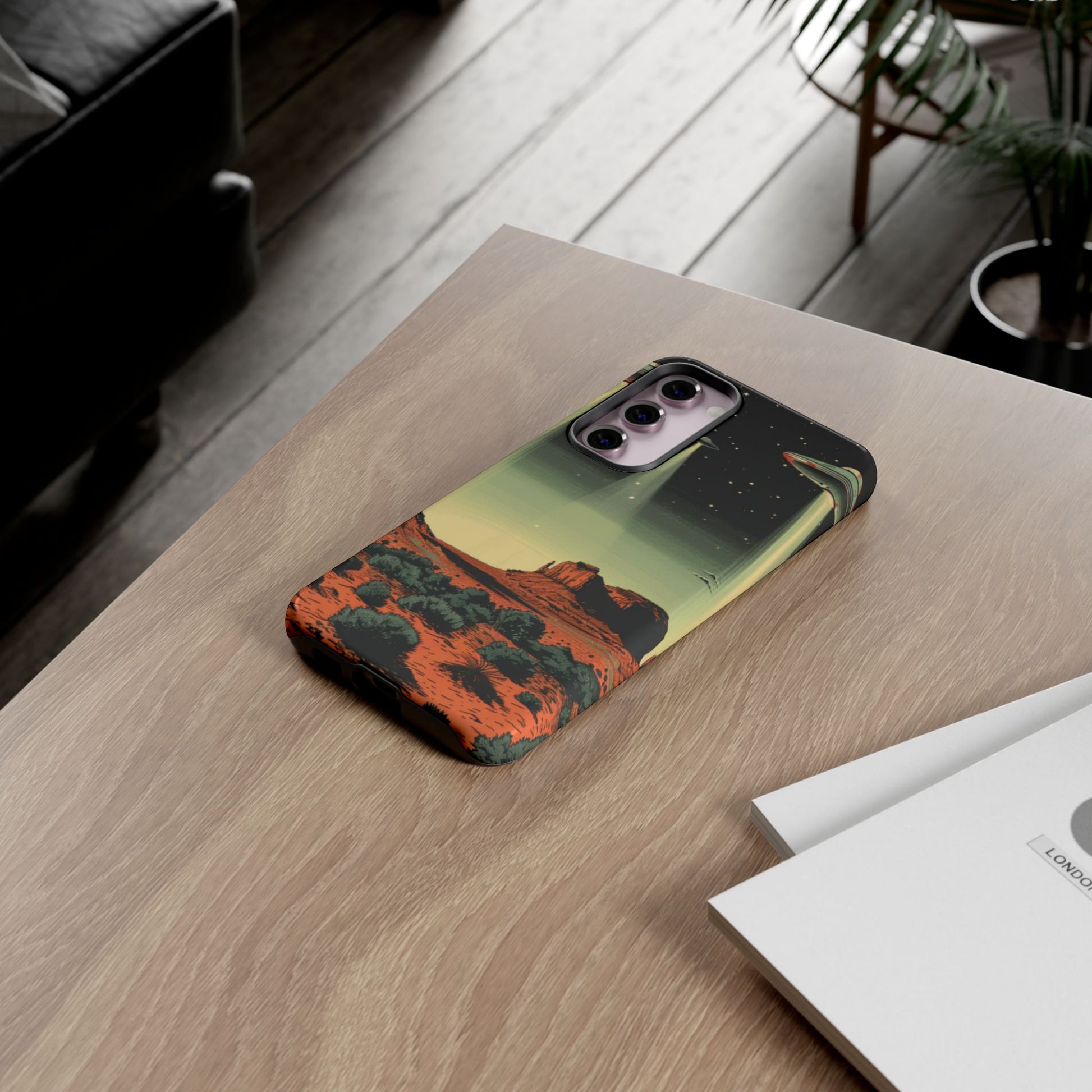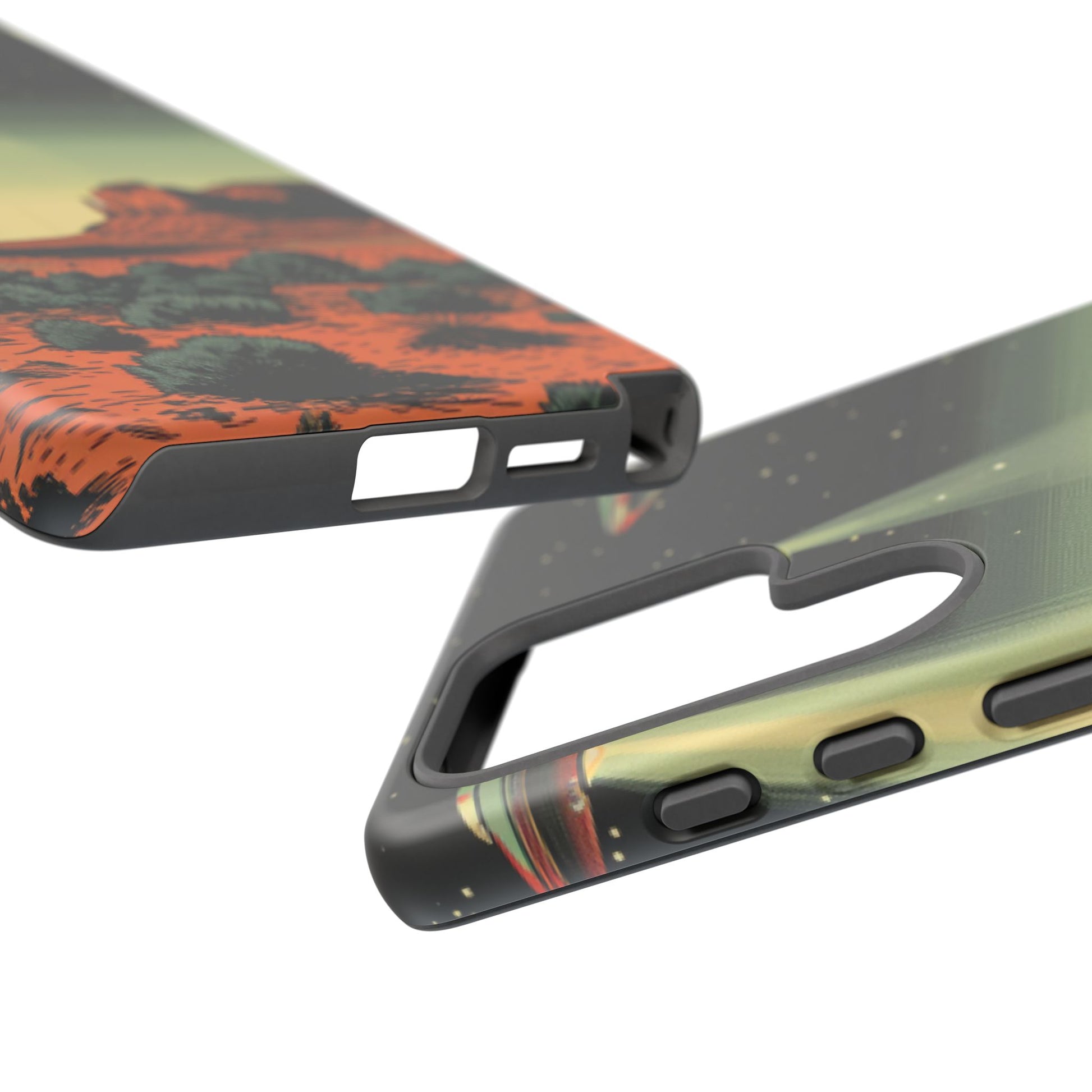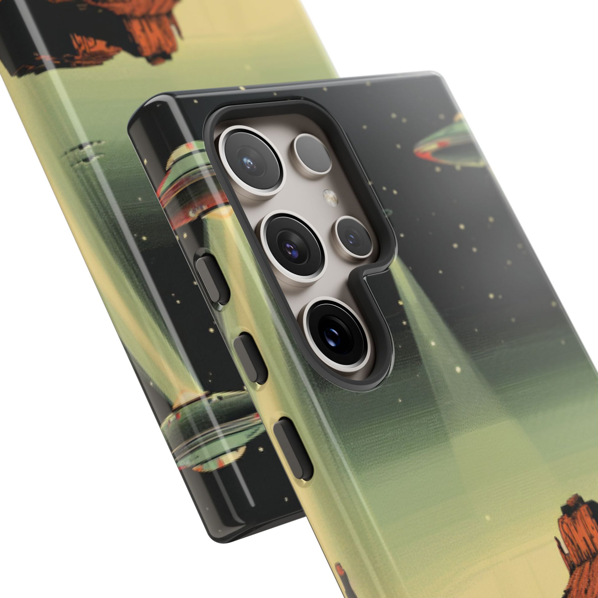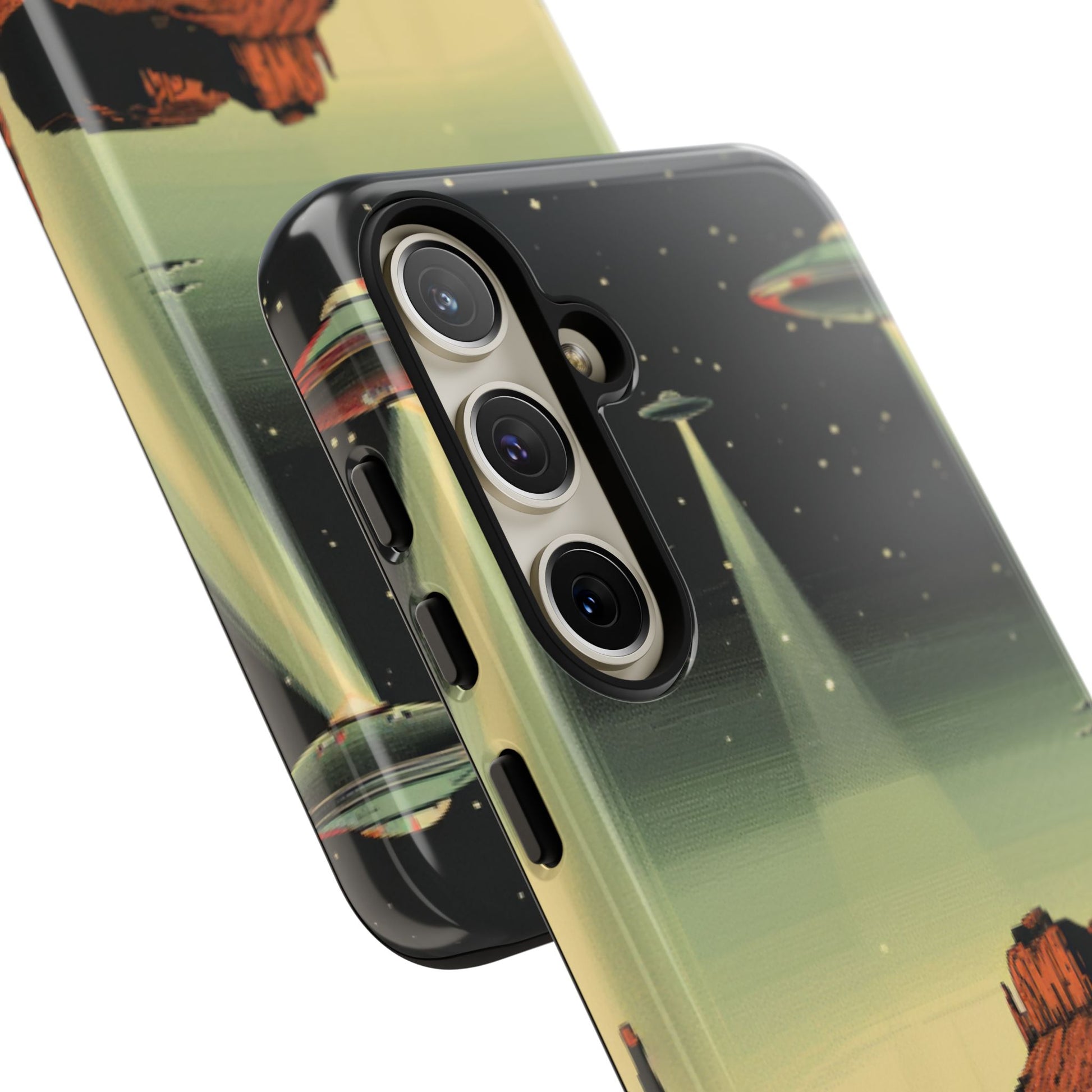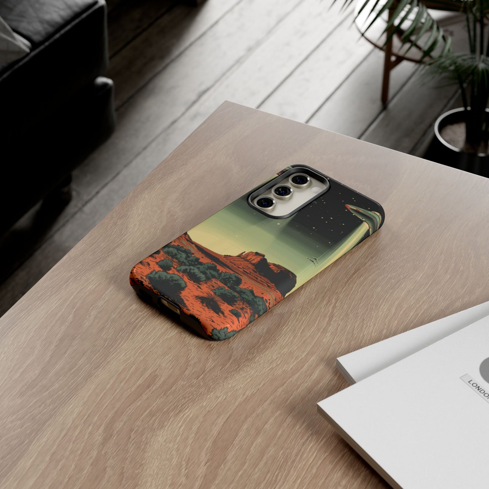 Night drives across red rock mesas, a hush of stars, and suddenly a silver disc sliding through the desert sky — this protective phone case carries that slow, cinematic thrill into everyday life. The double-layer shell hugs your phone while the TPU liner cushions every knock. The scene wraps fully around the case, keeping the vintage sci‑fi illustration crisp and weather-resistant. It’s for people who like their gear tough but mysterious: road‑trip storytellers, late-night stargazers, and collectors of retro space art. Use it on long drives, at outdoor meetups, or when you want a small, daily reminder of wide open places and strange lights on the horizon.