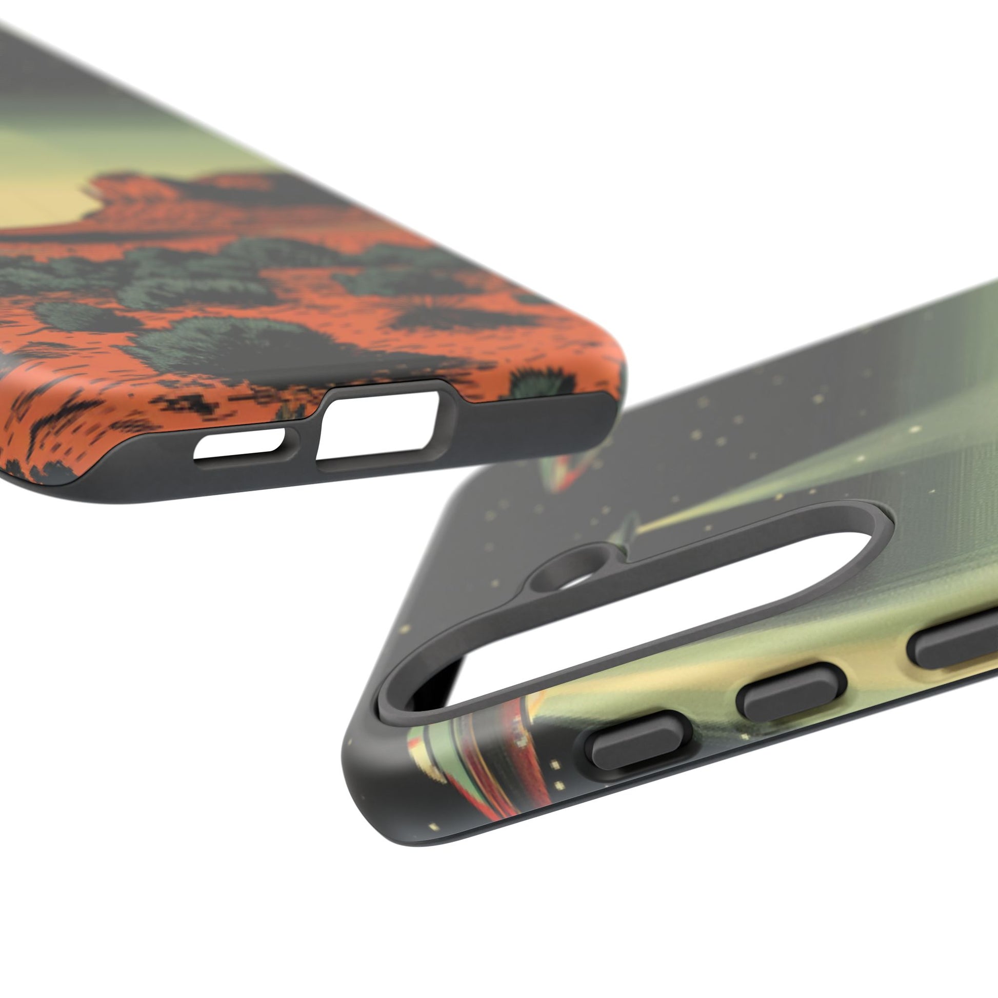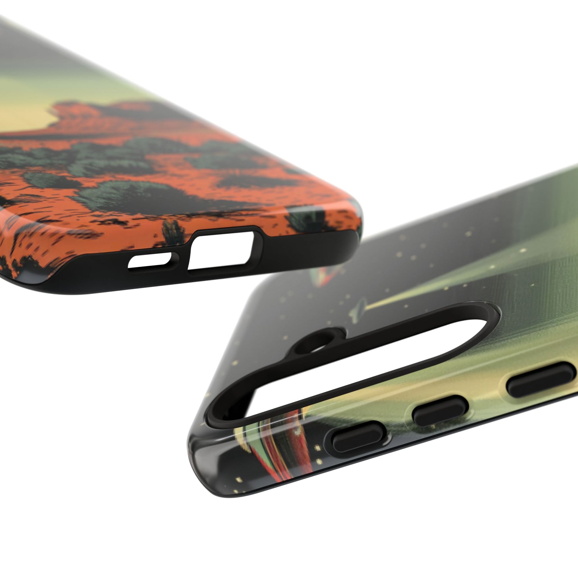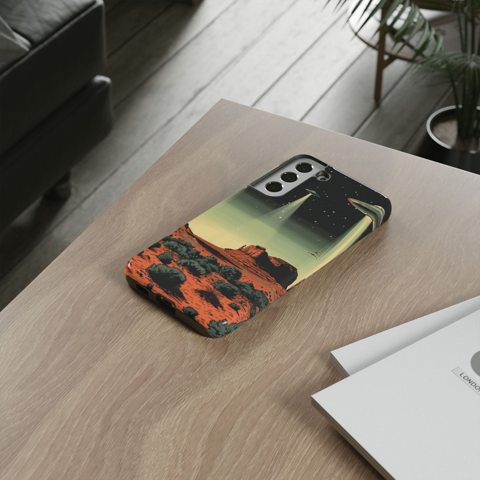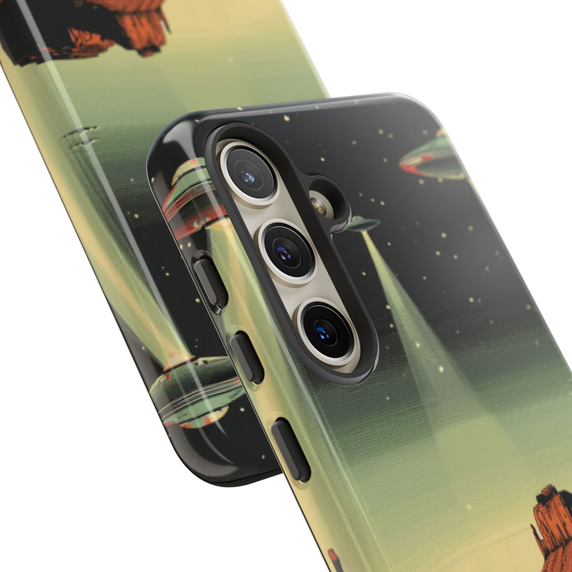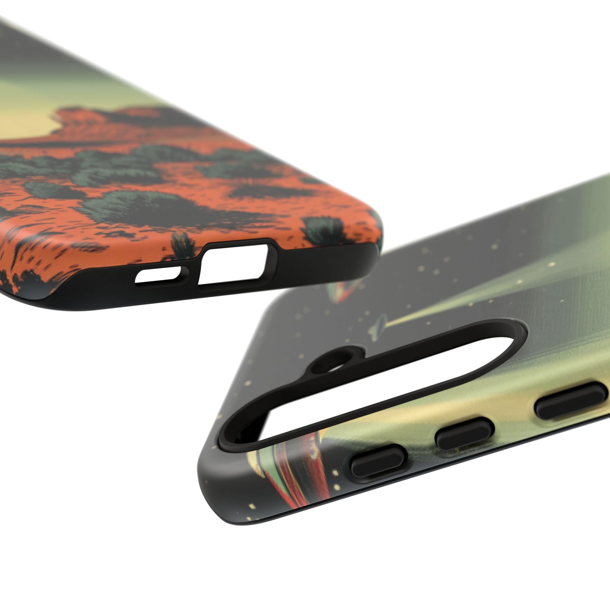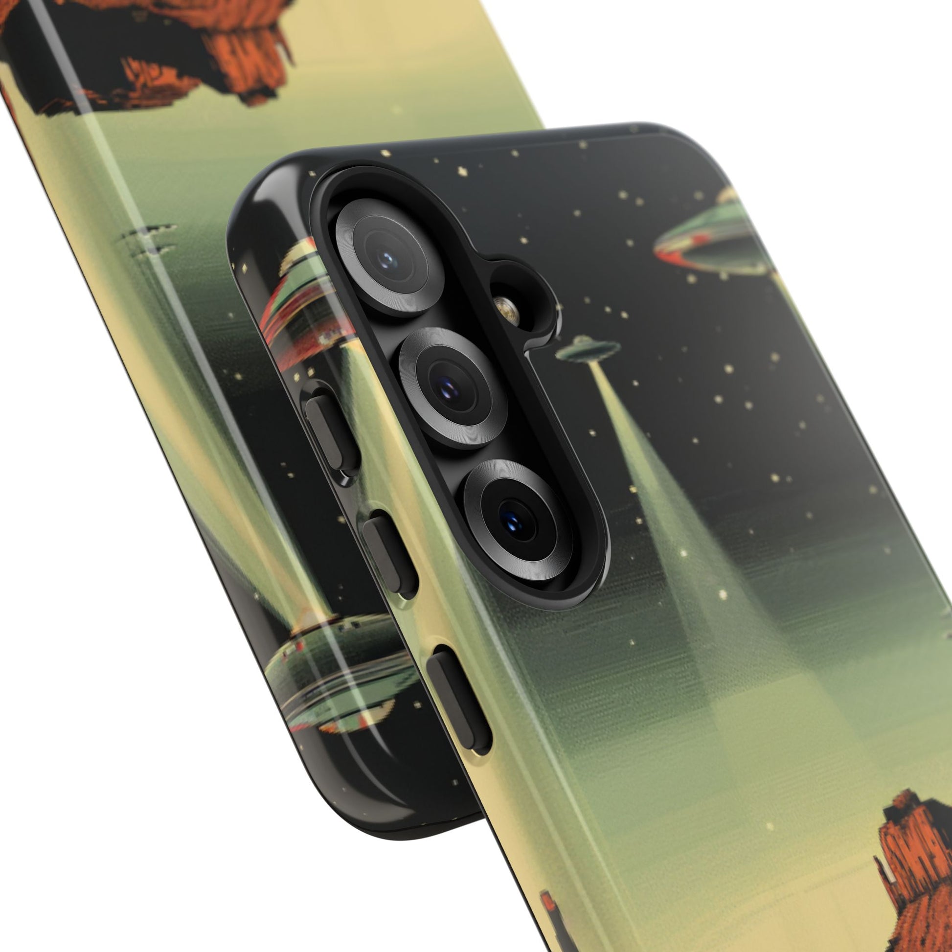 Night drives across red rock mesas, a hush of stars, and suddenly a silver disc sliding through the desert sky — this protective phone case carries that slow, cinematic thrill into everyday life. The double-layer shell hugs your phone while the TPU liner cushions every knock. The scene wraps fully around the case, keeping the vintage sci‑fi illustration crisp and weather-resistant. It’s for people who like their gear tough but mysterious: road‑trip storytellers, late-night stargazers, and collectors of retro space art. Use it on long drives, at outdoor meetups, or when you want a small, daily reminder of wide open places and strange lights on the horizon.