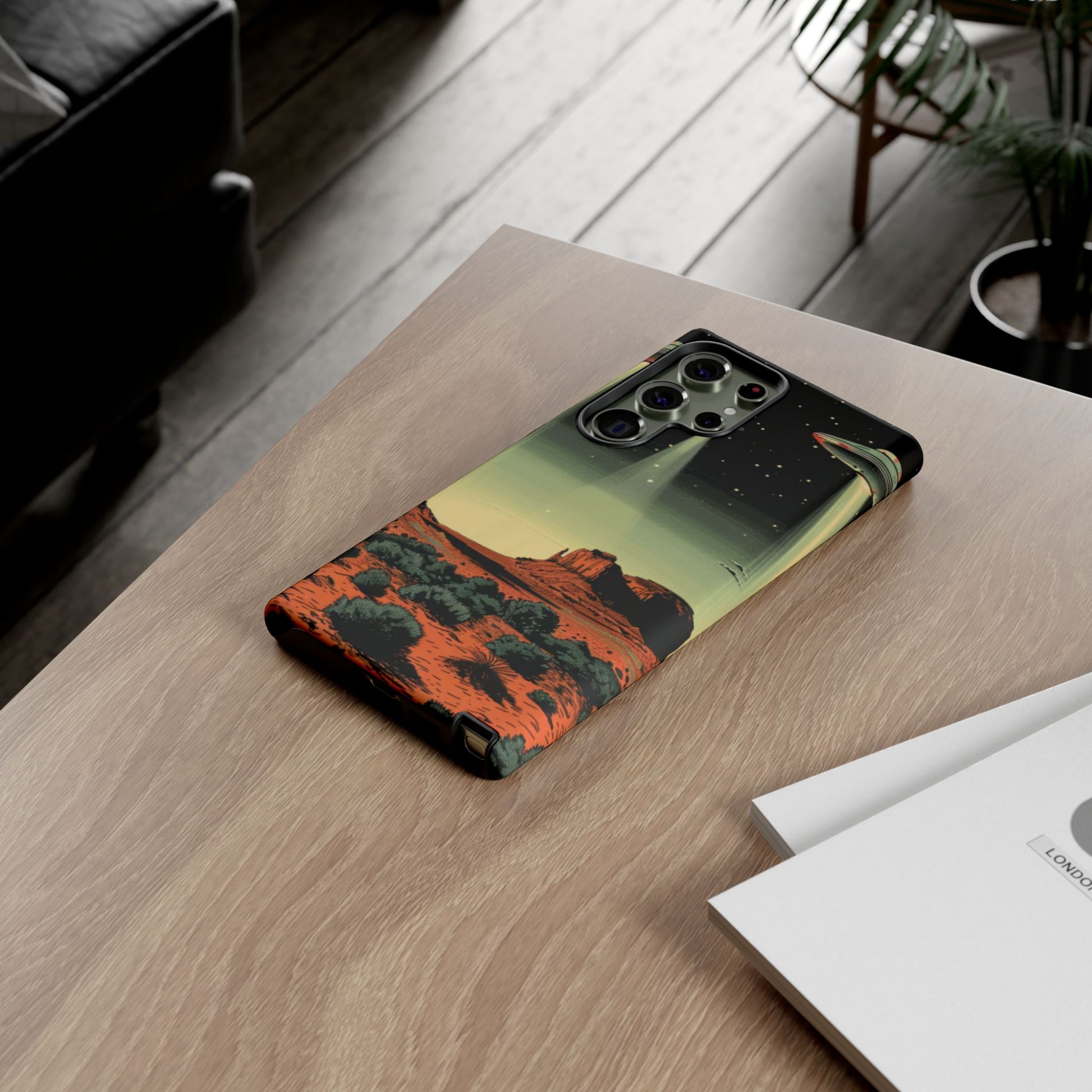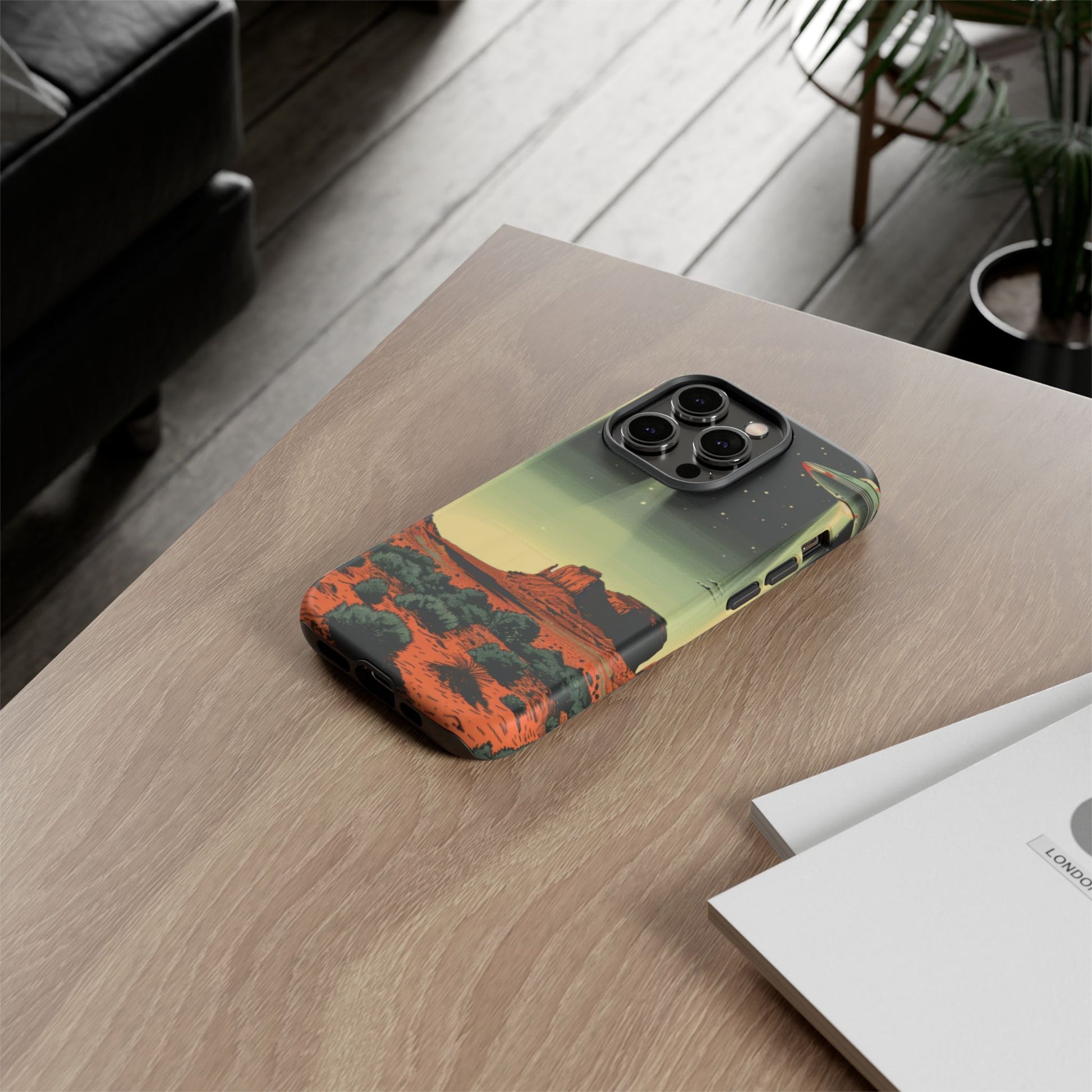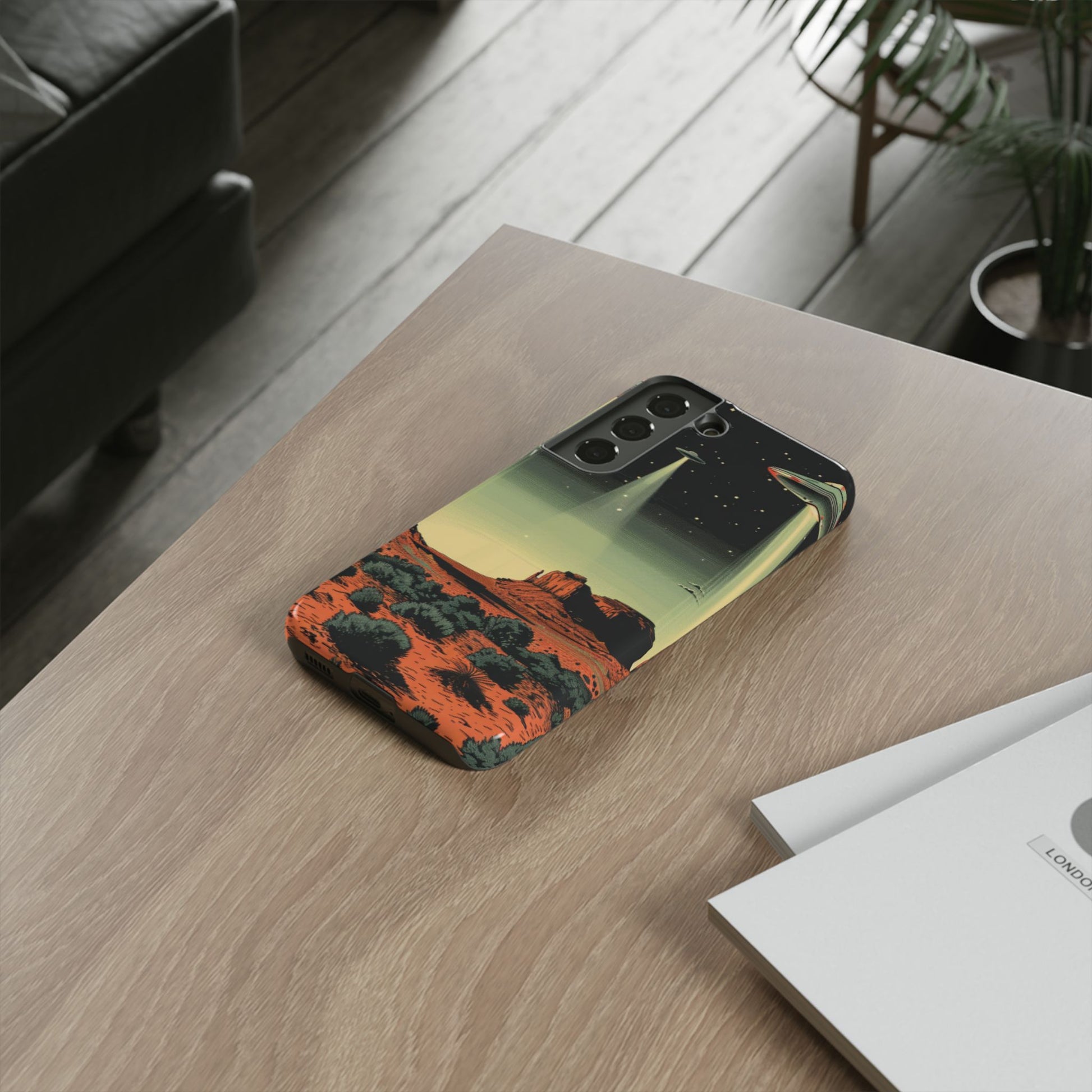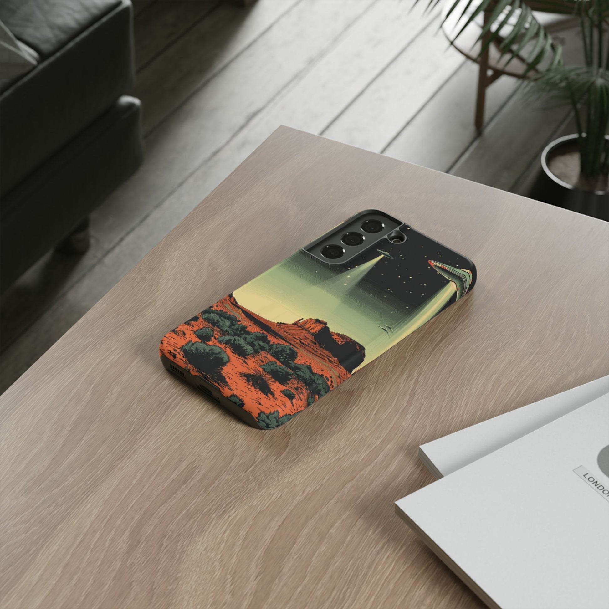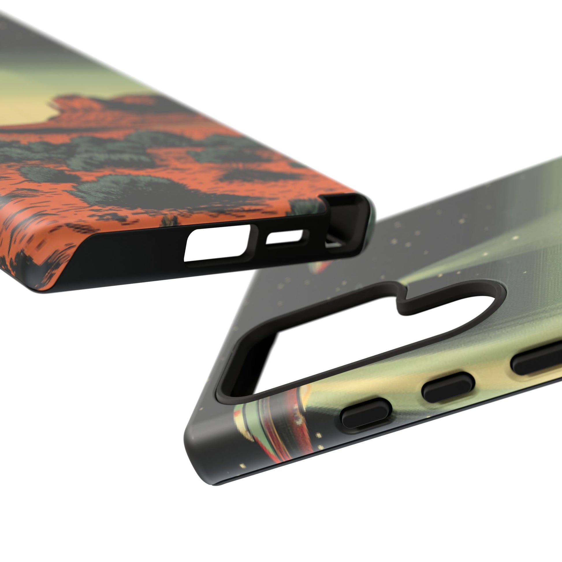 Night drives across red rock mesas, a hush of stars, and suddenly a silver disc sliding through the desert sky — this protective phone case carries that slow, cinematic thrill into everyday life. The double-layer shell hugs your phone while the TPU liner cushions every knock. The scene wraps fully around the case, keeping the vintage sci‑fi illustration crisp and weather-resistant. It’s for people who like their gear tough but mysterious: road‑trip storytellers, late-night stargazers, and collectors of retro space art. Use it on long drives, at outdoor meetups, or when you want a small, daily reminder of wide open places and strange lights on the horizon.