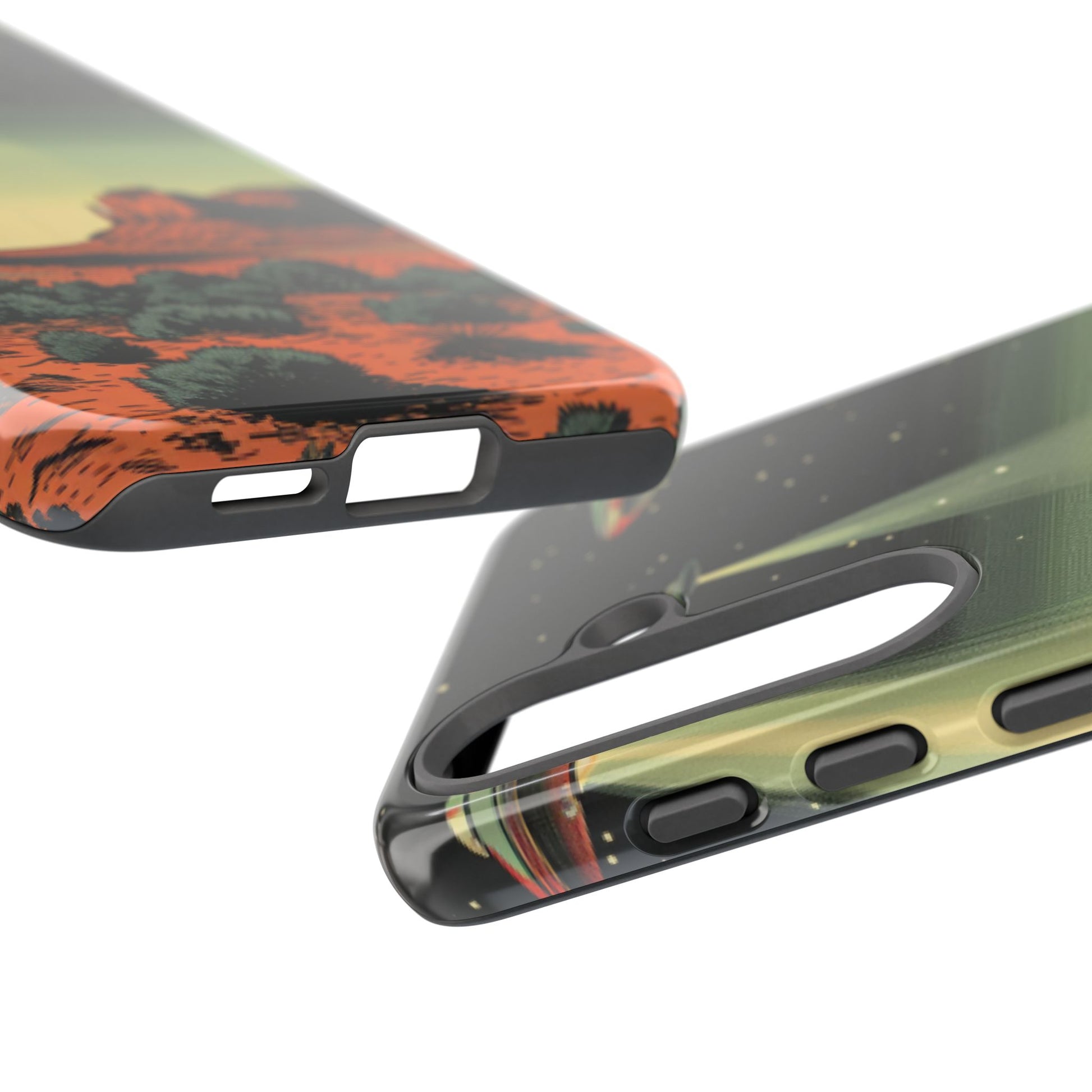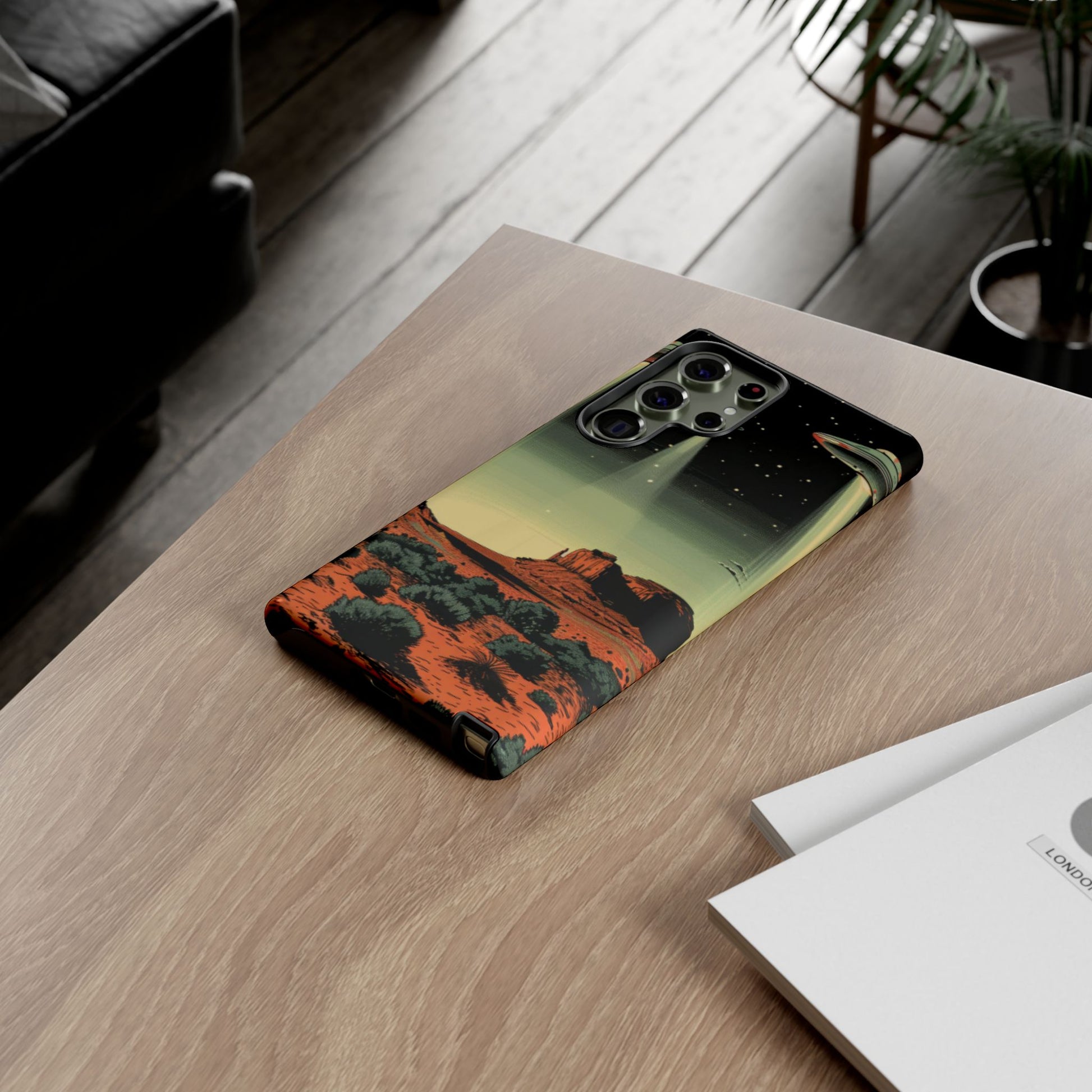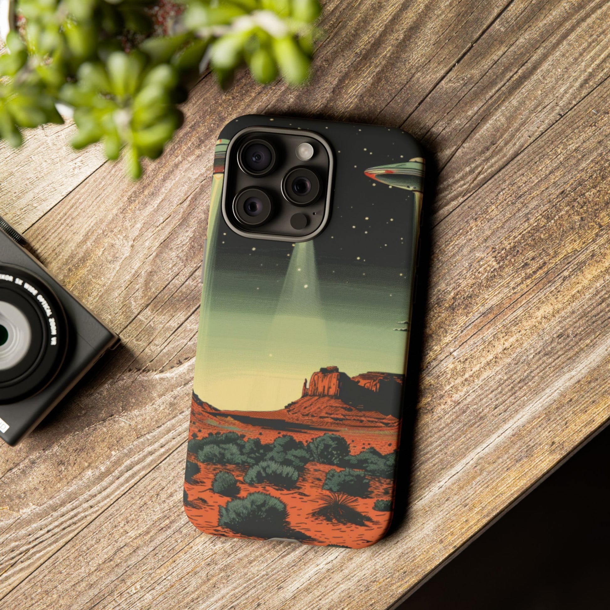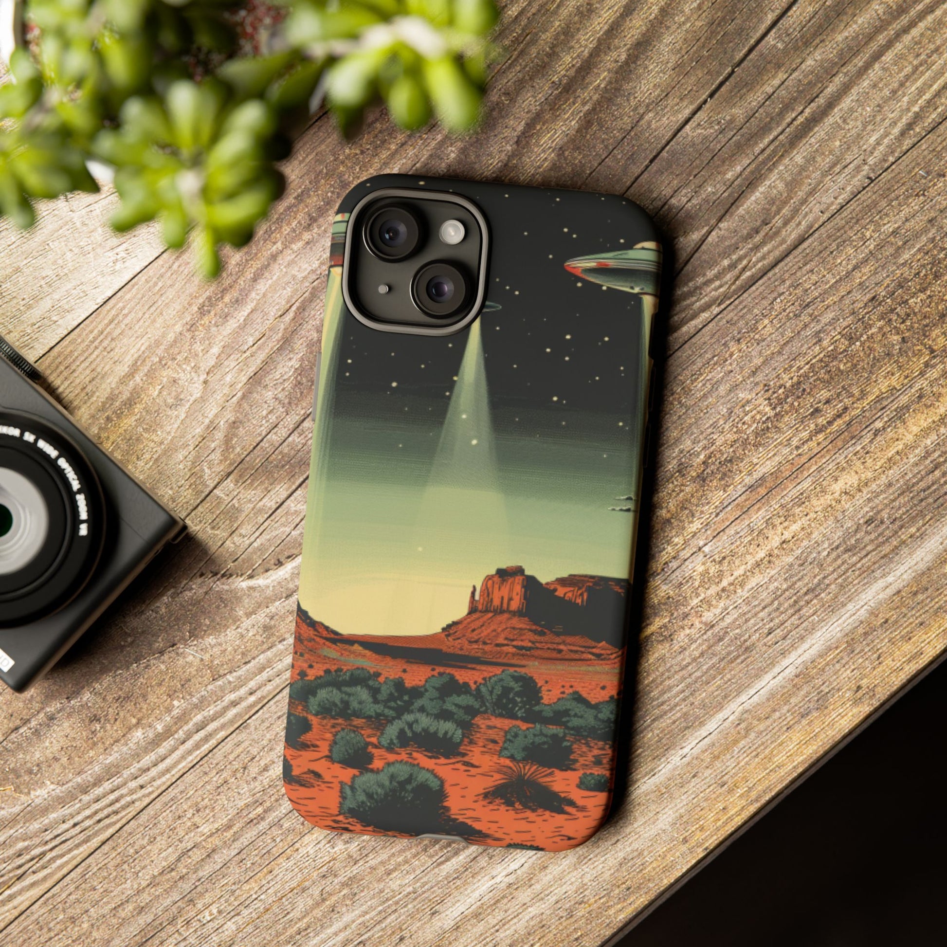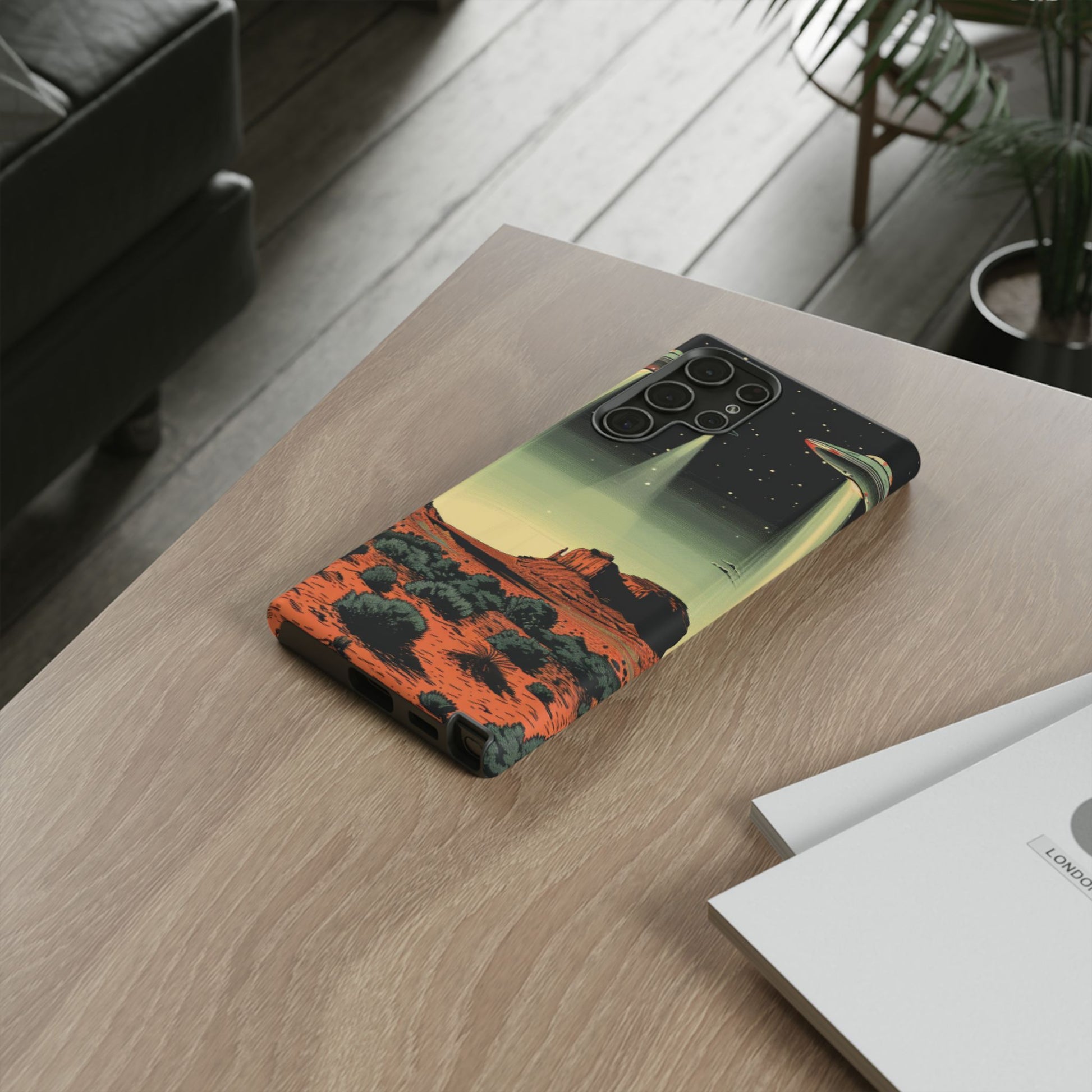 Night drives across red rock mesas, a hush of stars, and suddenly a silver disc sliding through the desert sky — this protective phone case carries that slow, cinematic thrill into everyday life. The double-layer shell hugs your phone while the TPU liner cushions every knock. The scene wraps fully around the case, keeping the vintage sci‑fi illustration crisp and weather-resistant. It’s for people who like their gear tough but mysterious: road‑trip storytellers, late-night stargazers, and collectors of retro space art. Use it on long drives, at outdoor meetups, or when you want a small, daily reminder of wide open places and strange lights on the horizon.