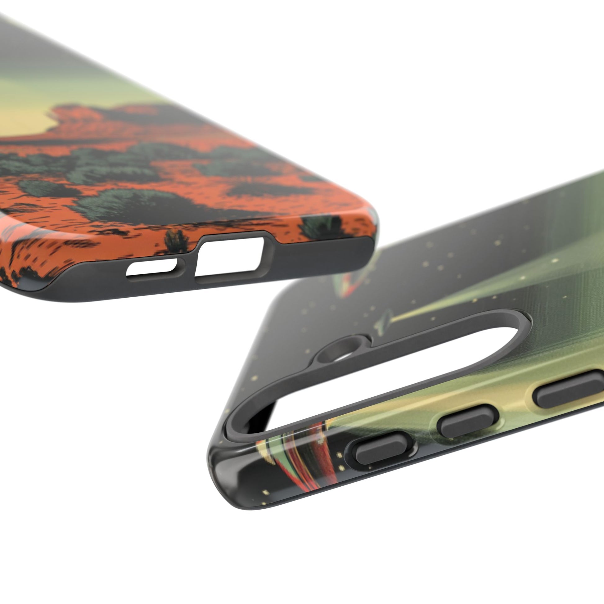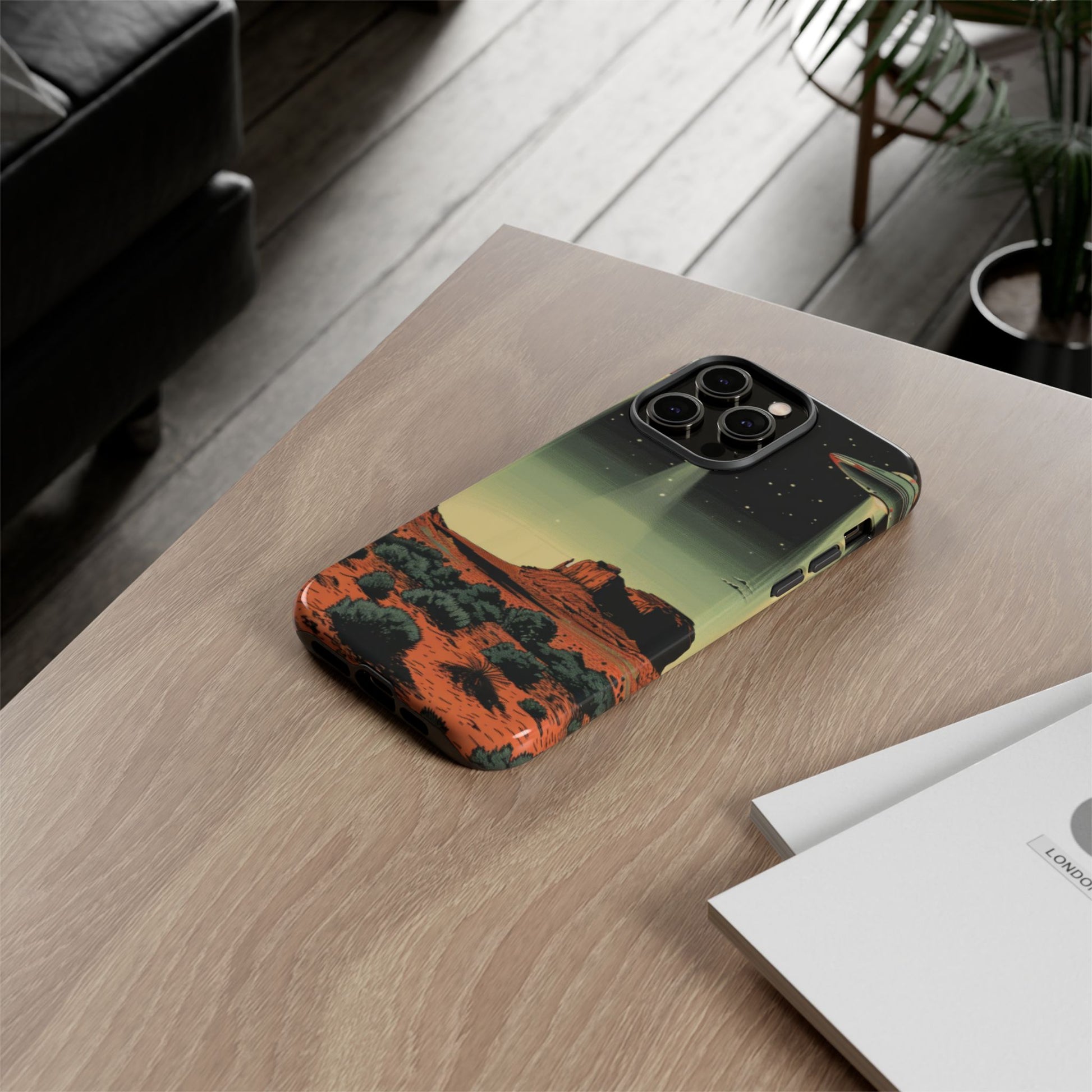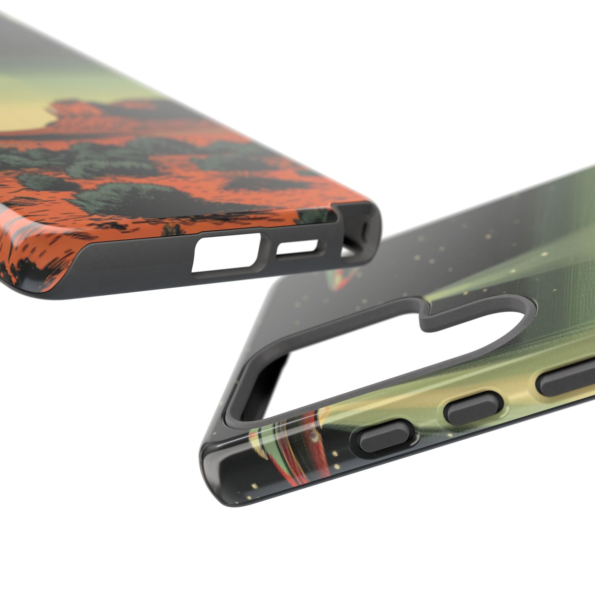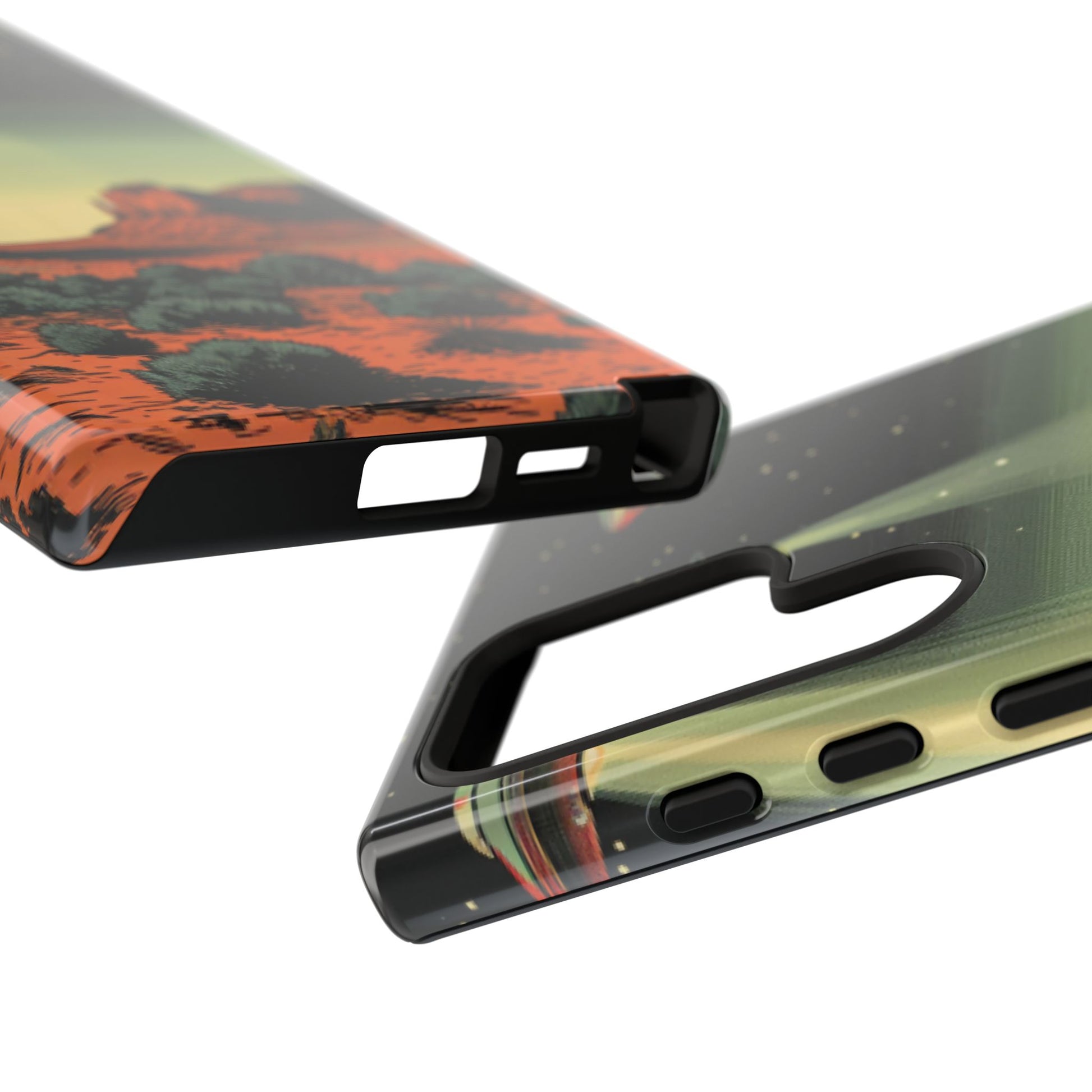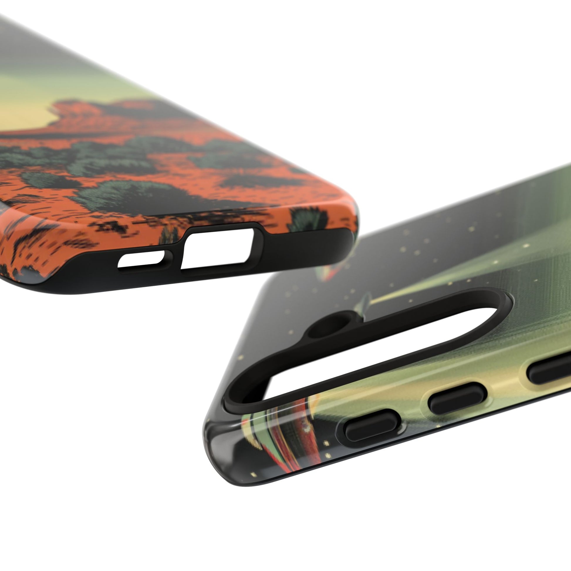 Night drives across red rock mesas, a hush of stars, and suddenly a silver disc sliding through the desert sky — this protective phone case carries that slow, cinematic thrill into everyday life. The double-layer shell hugs your phone while the TPU liner cushions every knock. The scene wraps fully around the case, keeping the vintage sci‑fi illustration crisp and weather-resistant. It’s for people who like their gear tough but mysterious: road‑trip storytellers, late-night stargazers, and collectors of retro space art. Use it on long drives, at outdoor meetups, or when you want a small, daily reminder of wide open places and strange lights on the horizon.