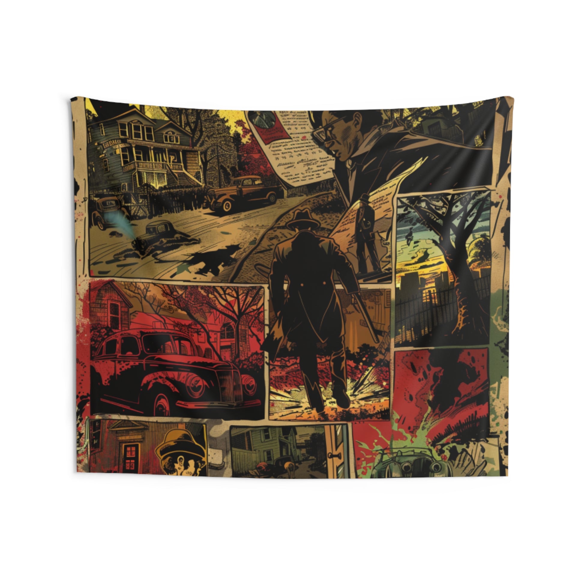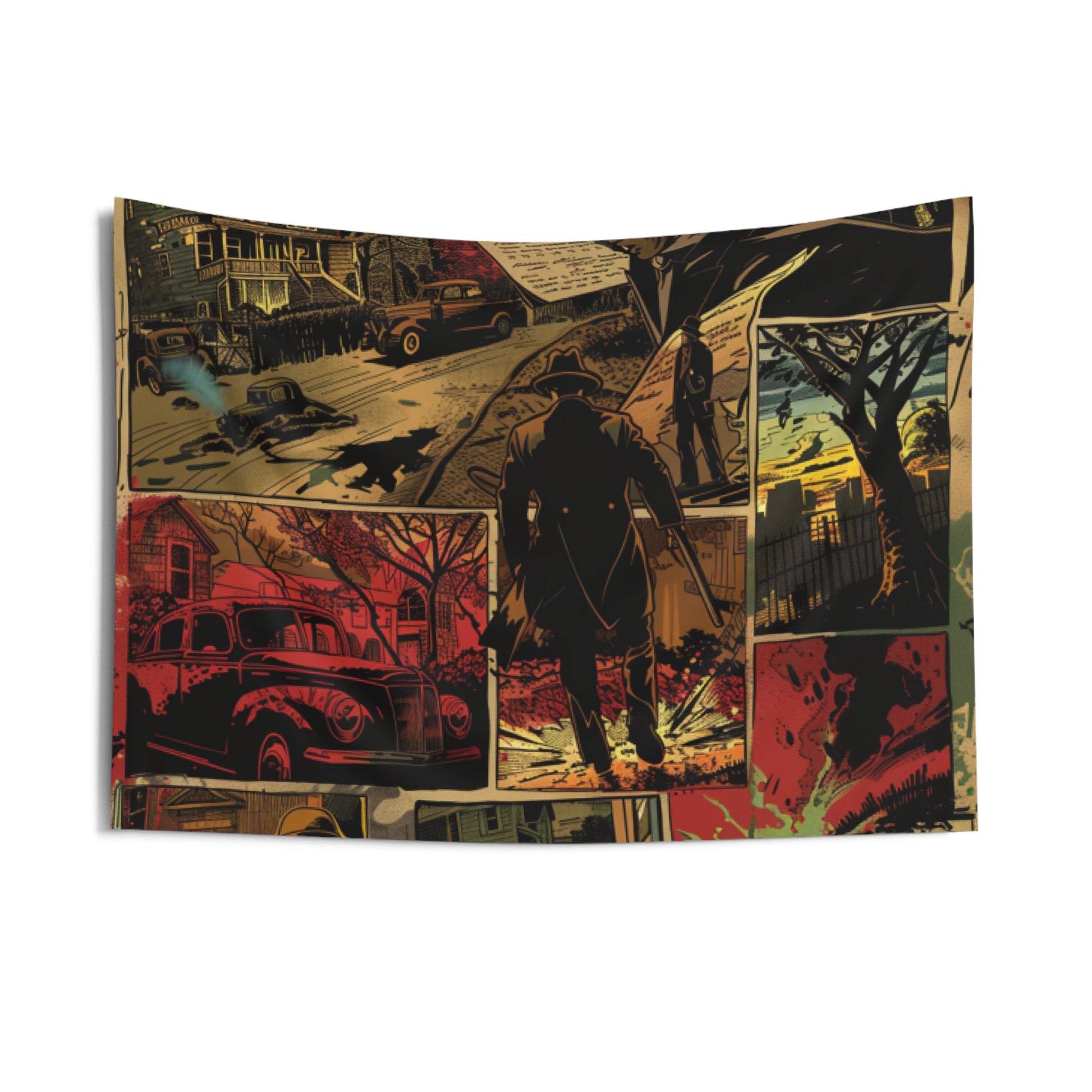 This indoor wall tapestry brings a moody, graphic-novel energy to your space. Deep, burnished colors and cinematic panels create a story-driven backdrop — noir streets, lone figures, and vintage details that draw the eye and invite quiet nights of reading, sketching, or listening to records. Lightweight and durable, it hangs flat against a wall to anchor living rooms, studios, or dens with an atmospheric, slightly mysterious vibe. Let it set the tone for movie nights, late-night writing sessions, or a cozy corner where tales and imagination take center stage.