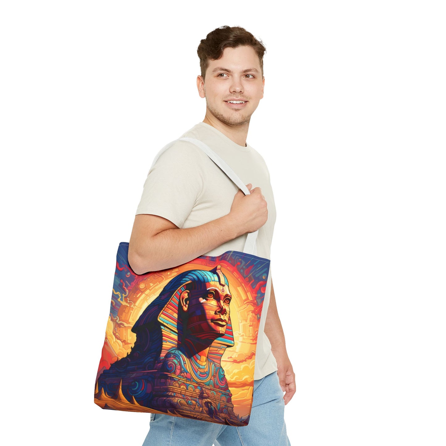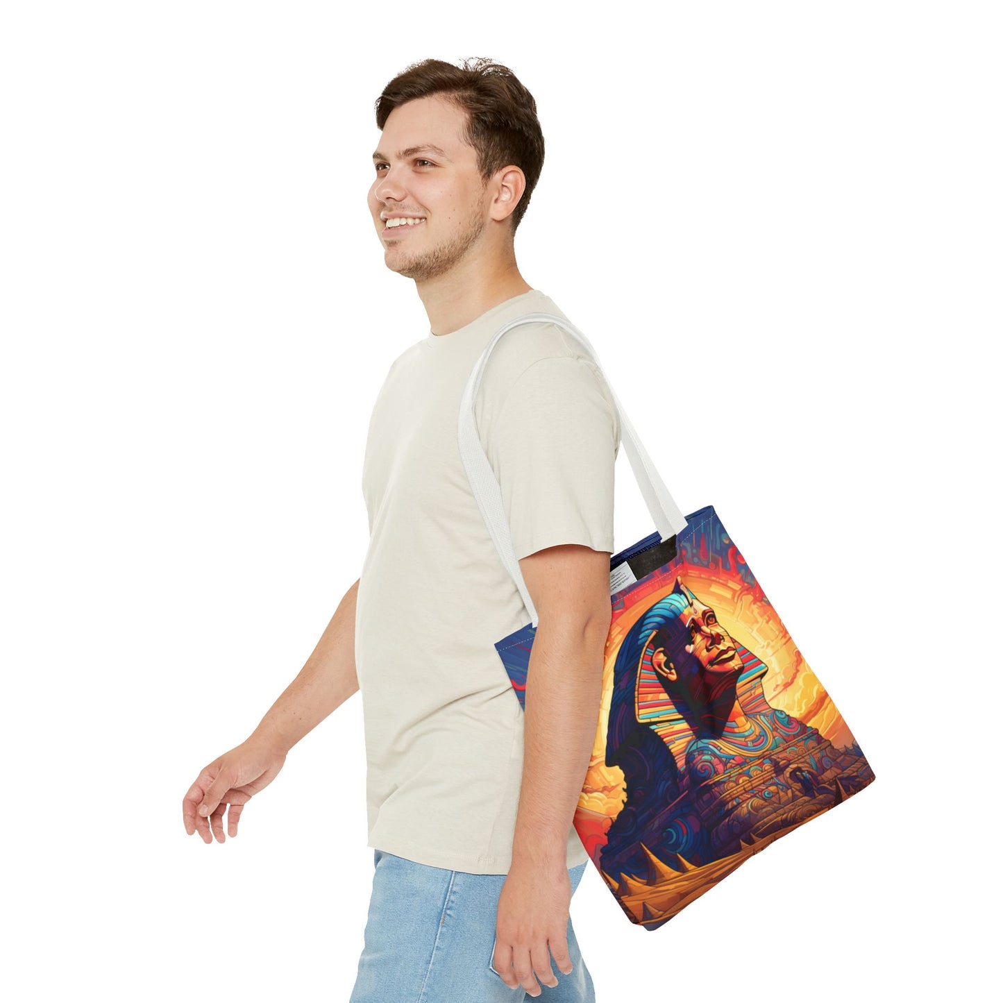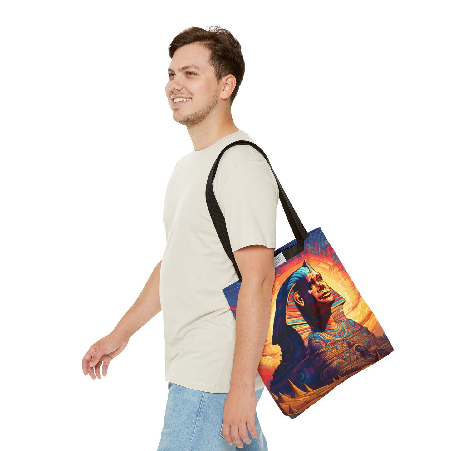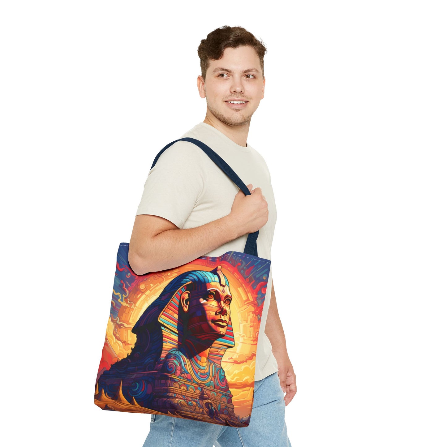 Available in three sizes to add both functionality and style, these custom tote bags come with various handle colors. Made from spun polyester, these bags feature double-stitched seams, cotton webbing handles, and a non-woven laminate lining for extended durability. The prints on the bags are achieved through dye sublimation for high-quality visual results.