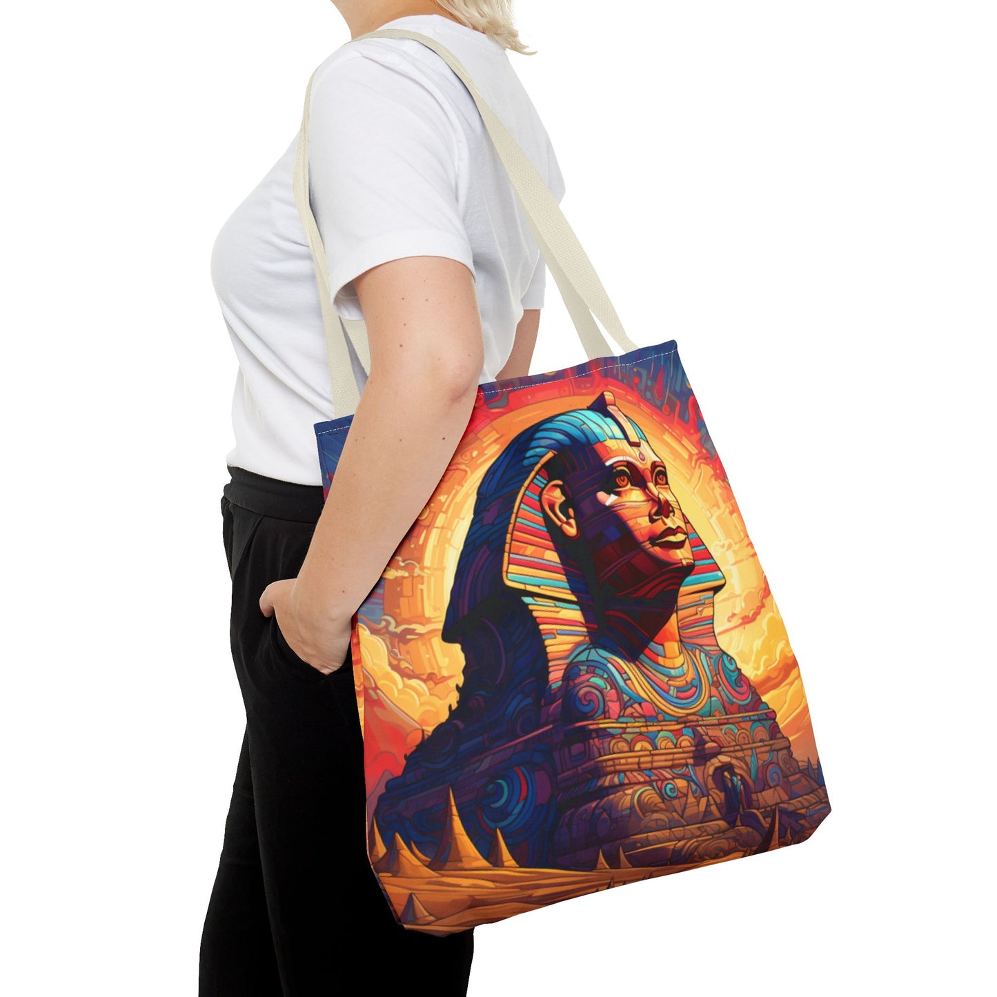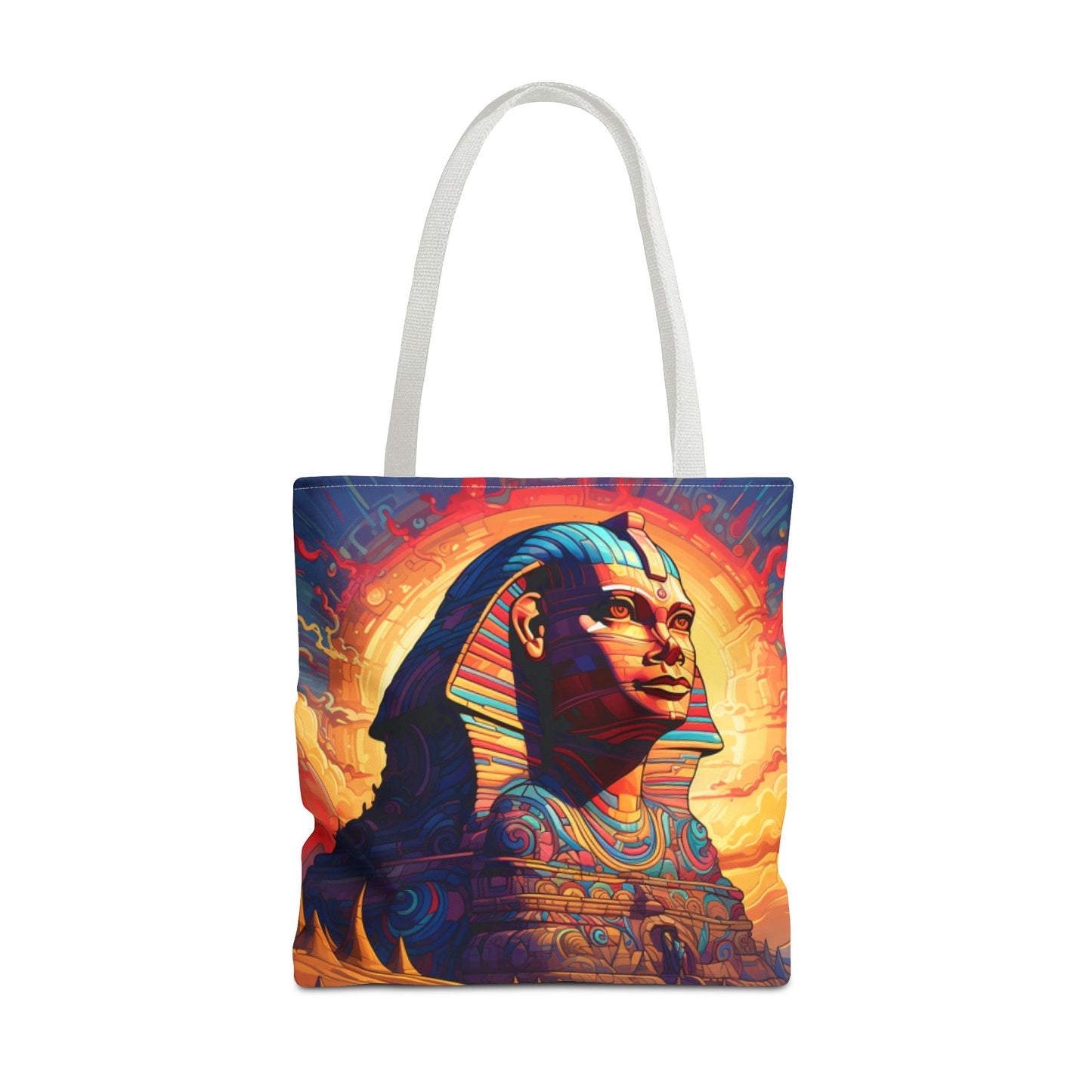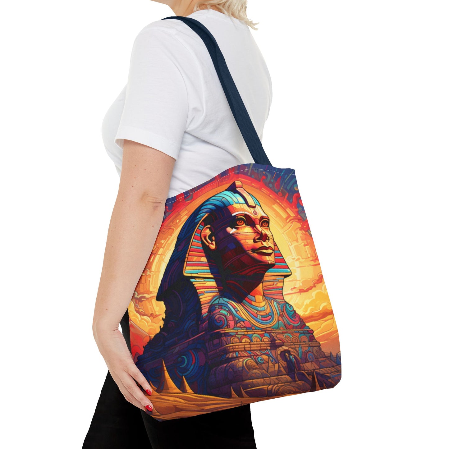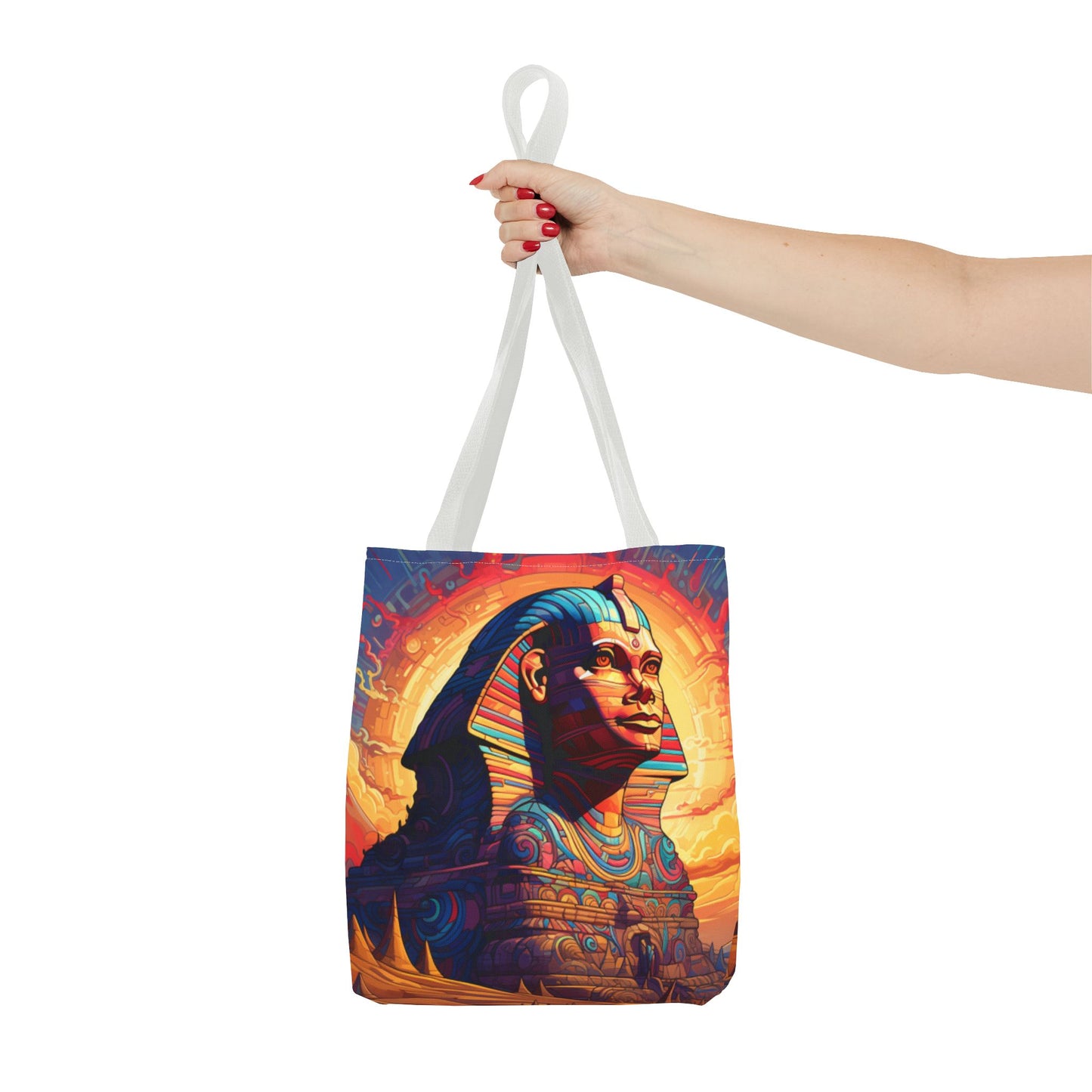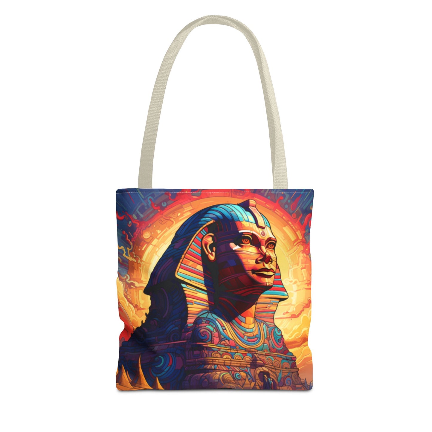 Available in three sizes to add both functionality and style, these custom tote bags come with various handle colors. Made from spun polyester, these bags feature double-stitched seams, cotton webbing handles, and a non-woven laminate lining for extended durability. The prints on the bags are achieved through dye sublimation for high-quality visual results.
